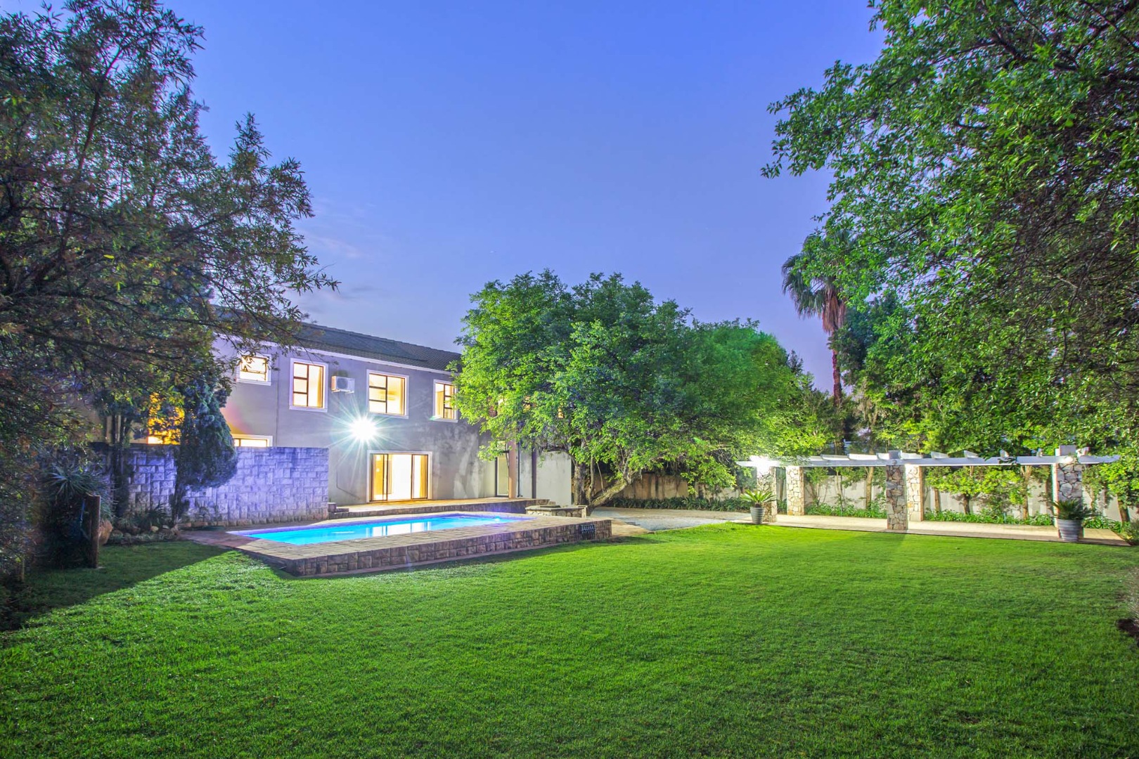Nestled within the prestigious Silver Lakes Golf Estate in Pretoria, South Africa, this magnificent residence epitomises sophisticated estate living. Its striking modern facade, graced by an elegant double-door entry and expansive windows, immediately captivates, promising an unparalleled lifestyle within a secure, eco-conscious, and golf-centric community. Step inside to discover an interior designed for discerning tastes, where an open-plan layout seamlessly connects generous living spaces. The residence boasts five opulent bedrooms and four-and-a-half luxurious bathrooms, ensuring ultimate comfort and privacy. A dedicated study, a sophisticated built-in bar, and a welcoming fireplace enhance the home's allure, while a well-appointed kitchen with a pantry, a formal dining room, and a family TV room cater to every domestic need. Air conditioning throughout ensures year-round comfort. The expansive 2300 sqm erf provides a private sanctuary, featuring a sparkling swimming pool, an inviting patio, and a meticulously landscaped garden with an irrigation system. Entertain guests effortlessly with a built-in braai and a charming stone fire pit area, all set amidst mature trees and lush greenery. A substantial four-car garage and additional parking ensure ample space for vehicles, complemented by dedicated staff quarters and a convenient laundry room. Beyond its aesthetic appeal, this estate offers peace of mind with 24-hour security, a secure access gate, and the inherent safety of a gated community. Embracing modern sustainability, the home is equipped with fibre connectivity, solar panels, a solar geyser, and a battery inverter, ensuring energy efficiency and uninterrupted living. Water tanks further enhance self-sufficiency, providing a resilient and eco-conscious environment. Key Features: * Five Bedrooms, 4.5 Bathrooms * Expansive 2300 sqm Erf with Pool * Four Garages & Ample Parking * Built-in Braai, Fire Pit & Patio * Study, Built-in Bar, Fireplace * Solar Panels, Inverter, Fibre Connectivity * Staff Quarters & Laundry * Secure Golf & Eco Estate Living
