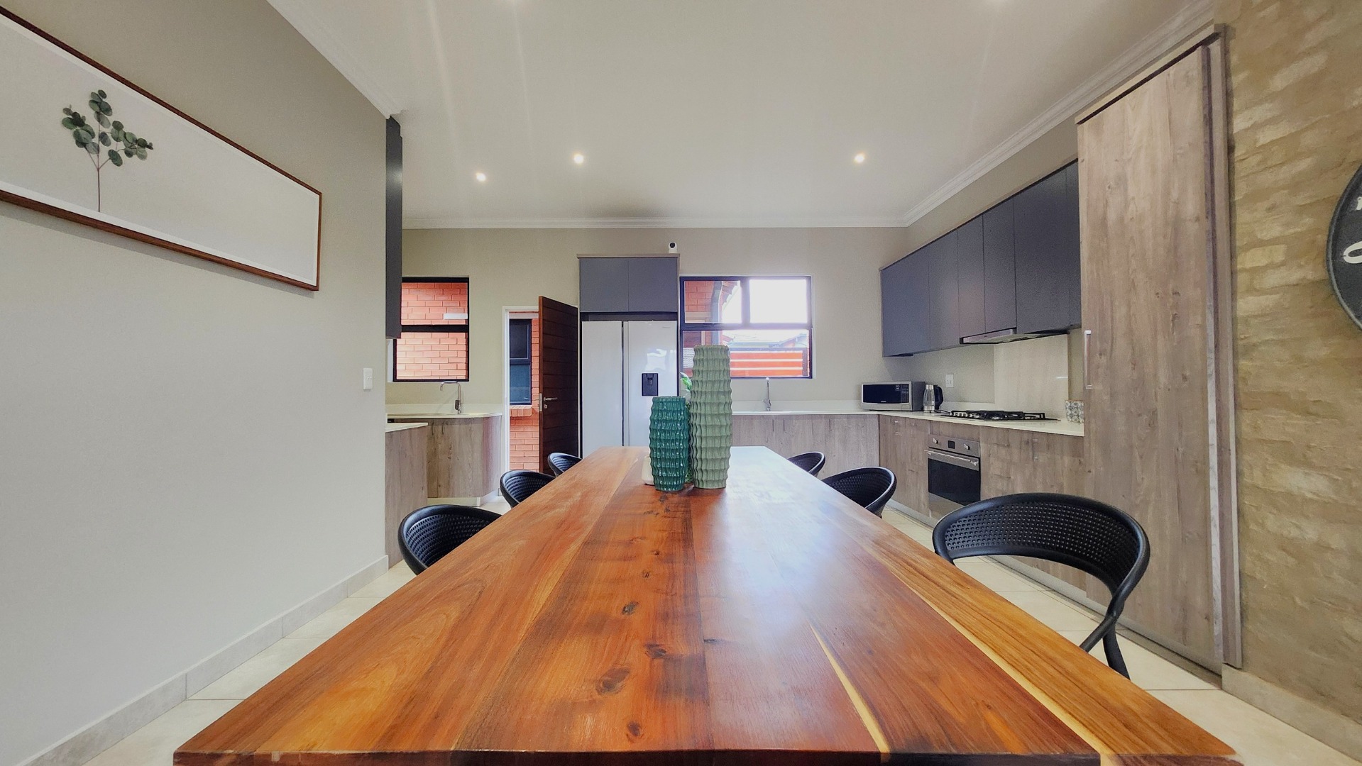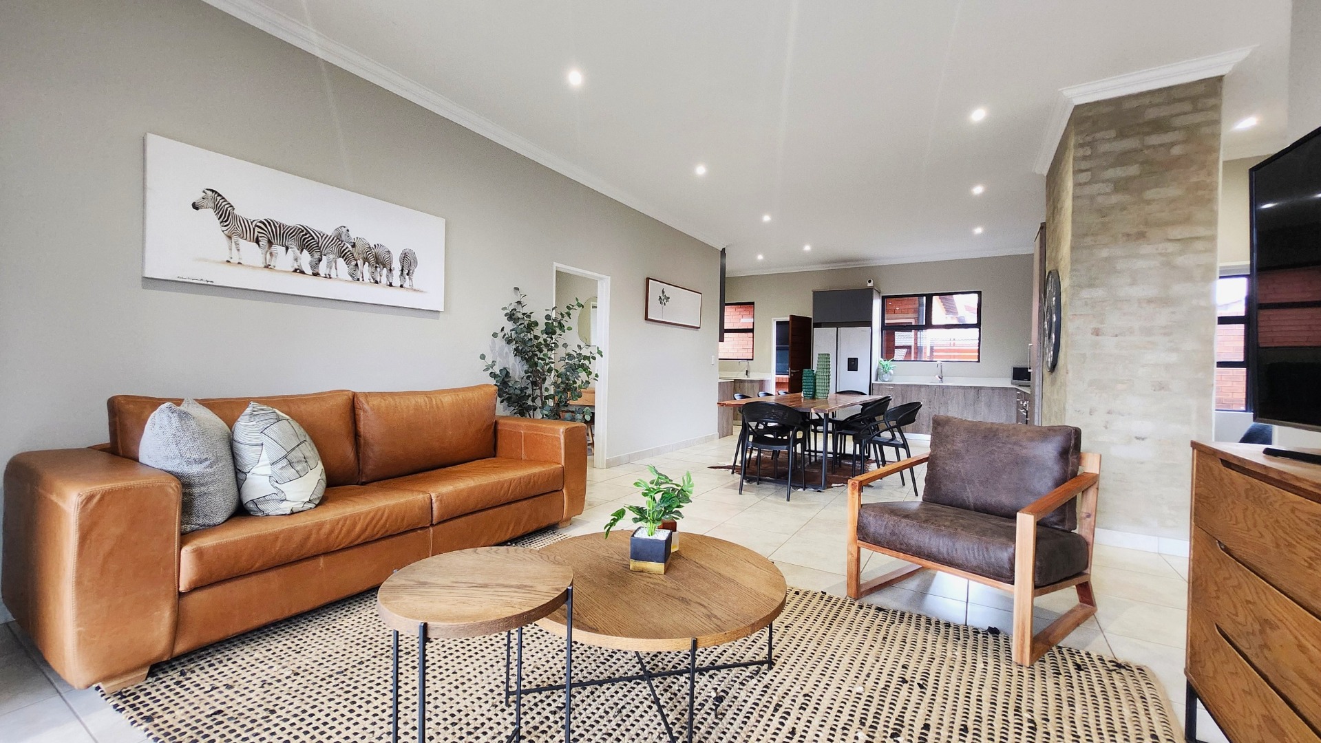 This home offers a seamless open-plan design with a stylish kitchen featuring a gas hob and electric oven, flowing into a spacious living area that opens onto a covered patio with a built-in braai and a private, pet-friendly garden — perfect for entertaining or relaxing with family.