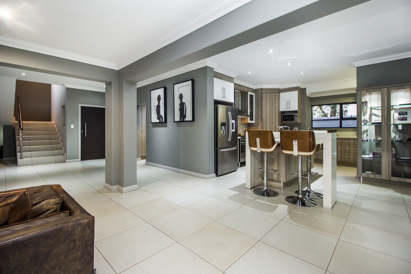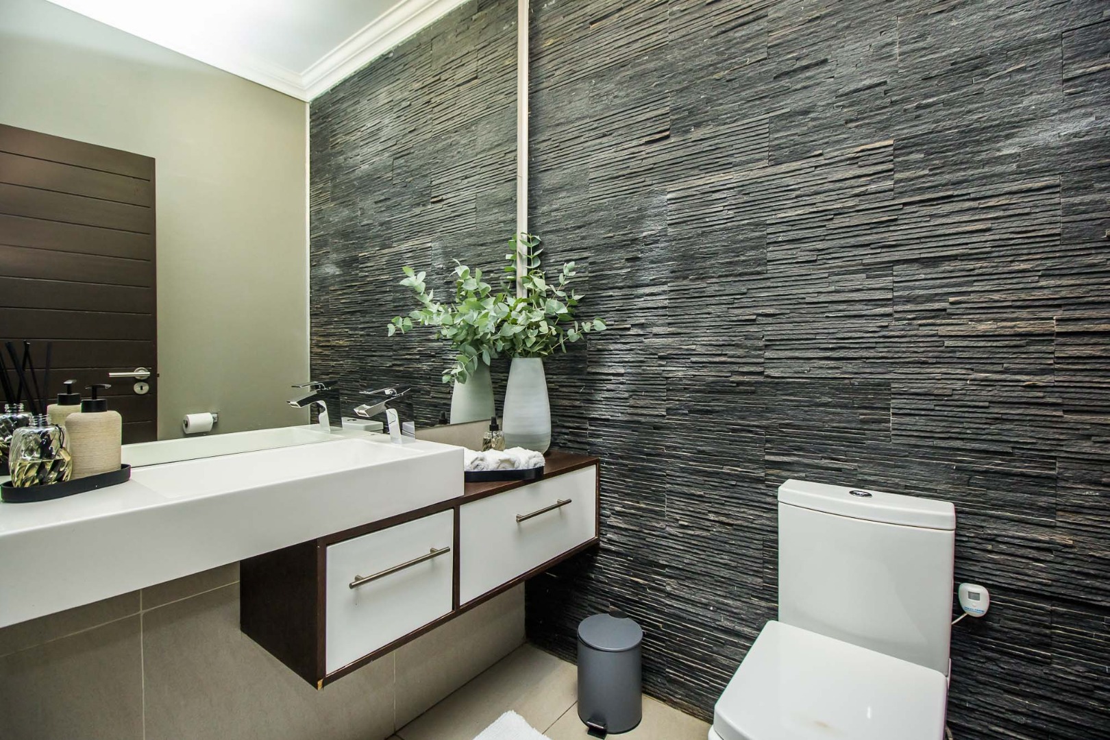Discover modern living in this exquisite 3-bedroom, 2-bathroom residence located within the prestigious Silver Stream Estate in Pretoria. The property immediately impresses with its striking contemporary architectural design, featuring a blend of white stucco and dark stone cladding, complemented by sophisticated exterior lighting and a gated entry for enhanced security and privacy. A spacious paved driveway leads to a double garage, offering ample parking.