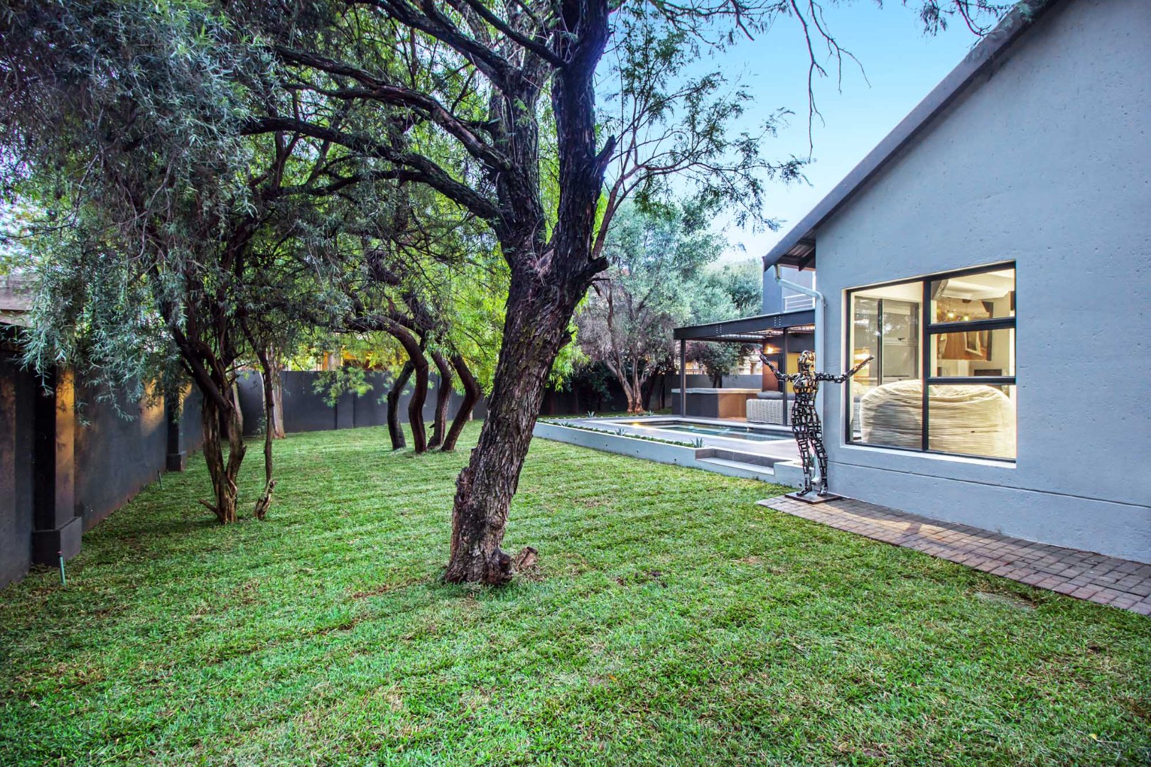 Each of the three bedrooms offers comfort and style, while the two bathrooms are finished to a high standard. The property truly shines with its outdoor amenities, featuring a private swimming pool, a covered patio with an integrated braai, and an outdoor bar, perfect for entertaining. A hot tub in the private garden area provides an additional touch of luxury. The meticulously maintained garden and paving complete the exterior appeal.