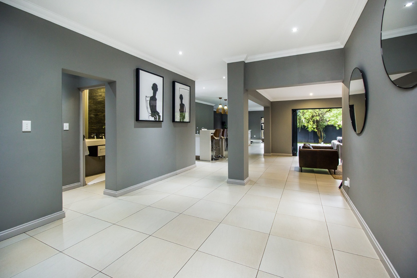 Step inside to an interior designed for seamless indoor-outdoor living, characterized by clean lines and a neutral palette. The home boasts a well-appointed kitchen with a pantry, a dedicated dining room, a comfortable lounge, and a family TV room, providing versatile spaces for relaxation and entertainment. An entrance hall, and guest toilet add to the functional layout, catering to both family life and professional needs.