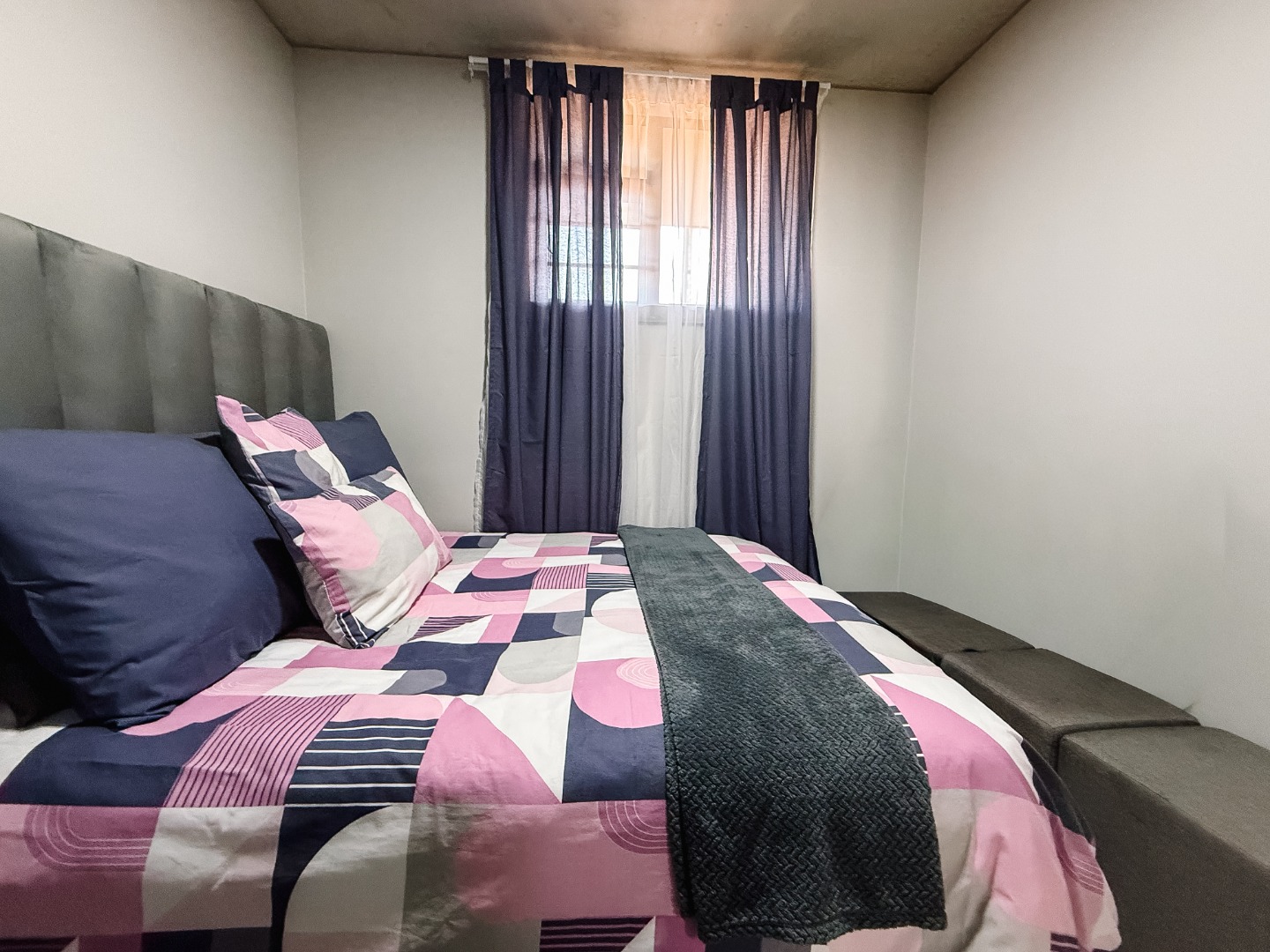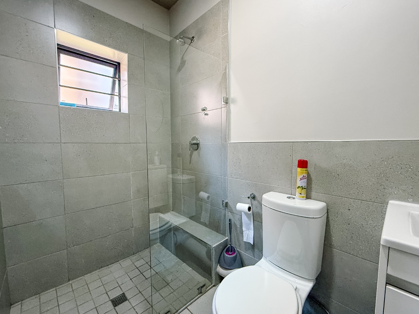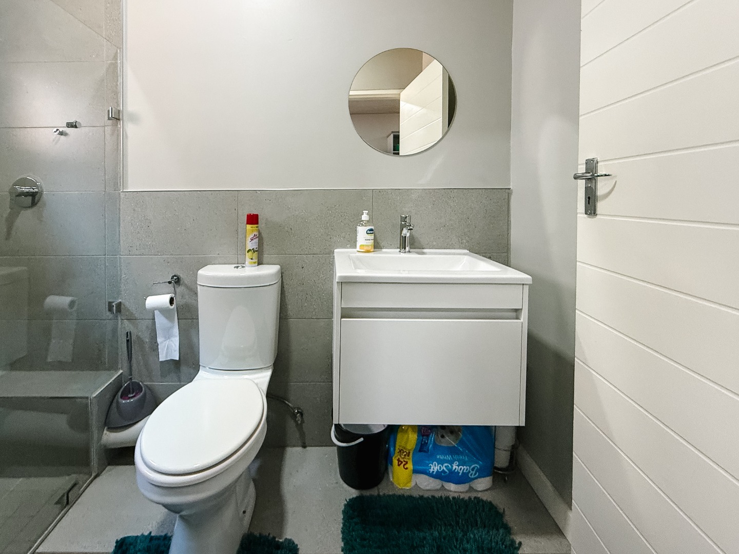 The bedroom is well-sized for the unit’s footprint and comfortably accommodates a bed, built-in cupboards, and additional furniture. It provides a quiet, private retreat with a calm atmosphere, ideal for rest and relaxation. The bathroom is finished with modern fittings and features a shower, basin, and toilet, all presented in a clean, timeless design.