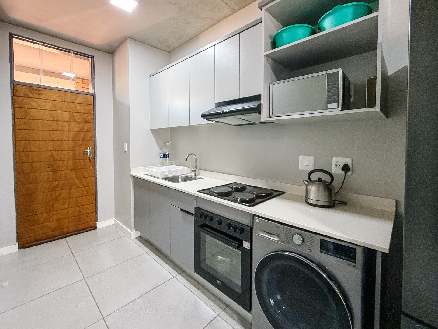 The modern kitchen is fitted with sleek cabinetry, durable countertops, and space for essential appliances. Designed with efficiency in mind, it offers ample storage and a clean, minimalist aesthetic that complements the apartment’s contemporary style. Whether preparing quick weekday meals or hosting guests, the kitchen delivers both form and function.