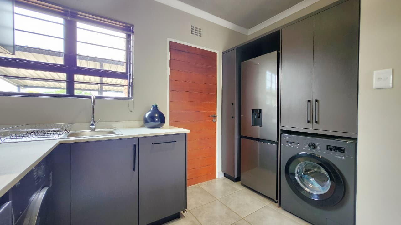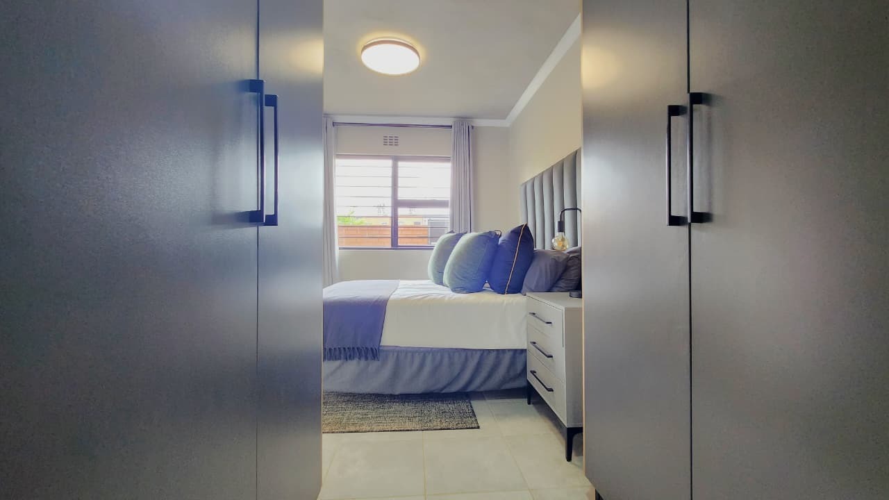 This stylish 2-bedroom, 2-bathroom apartment offers a well-designed open-plan layout. The modern kitchen is fitted with an electric oven and hob and flows seamlessly into a spacious living area, which opens onto a covered patio with a built-in braai and a small private garden—perfect for relaxed weekends or entertaining guests.