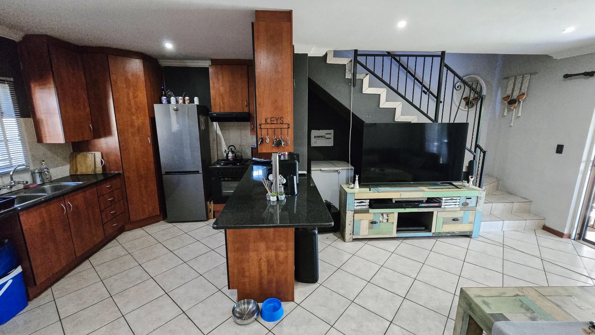 Downstairs features a spacious open-plan layout, ideal for modern living and entertaining. The kitchen is fitted with granite countertops, ample cupboard space, and flows seamlessly into a generously sized living area. A conveniently located guest toilet is positioned near the kitchen, making the ground floor practical and welcoming.