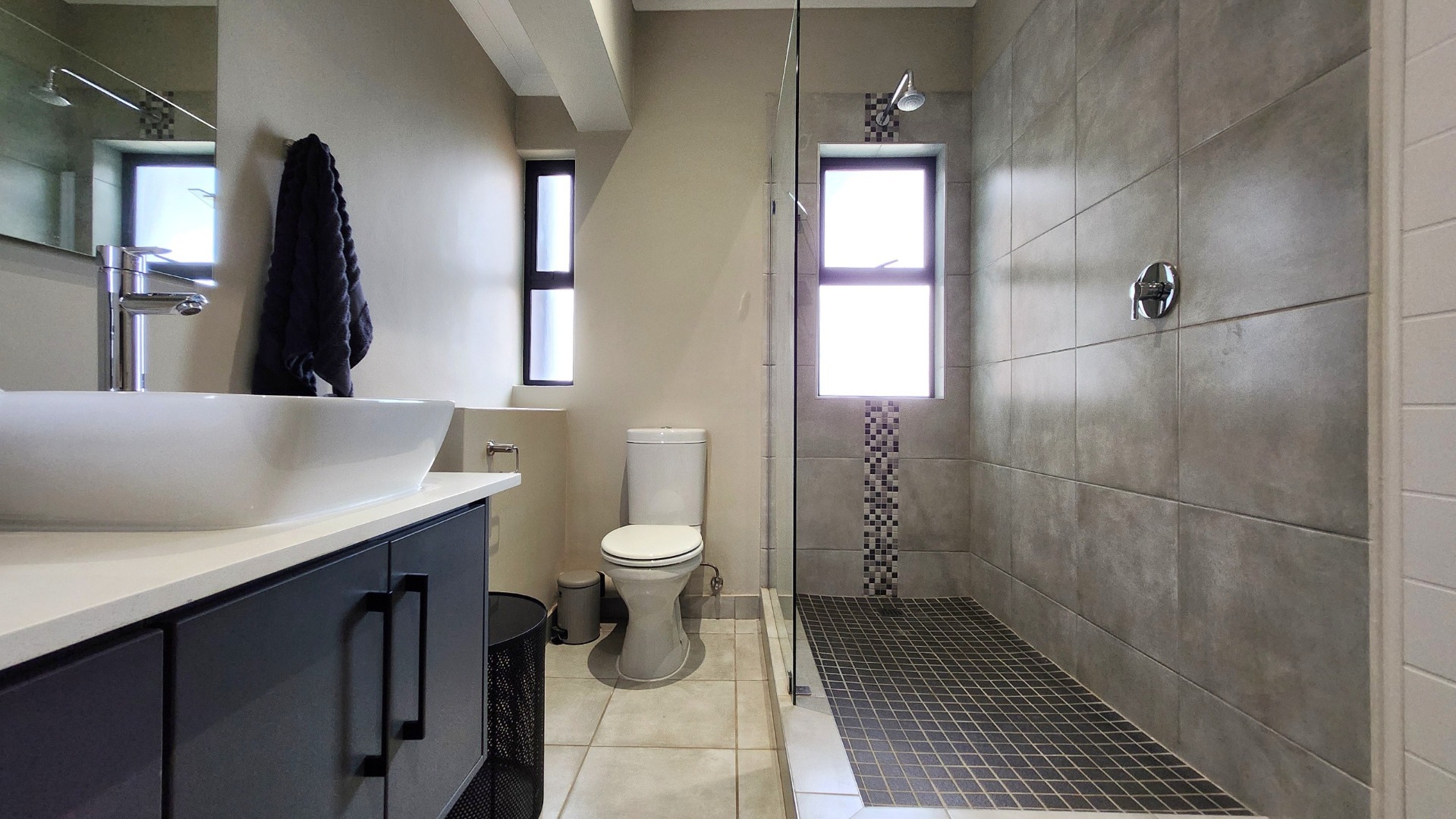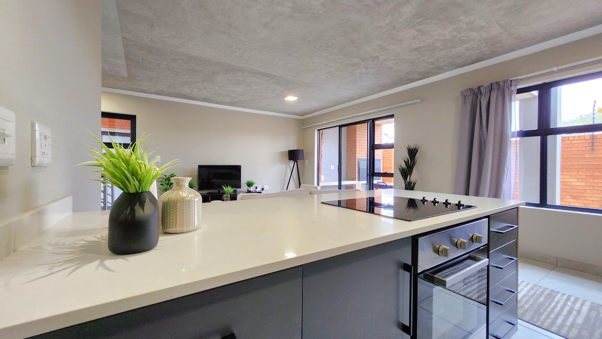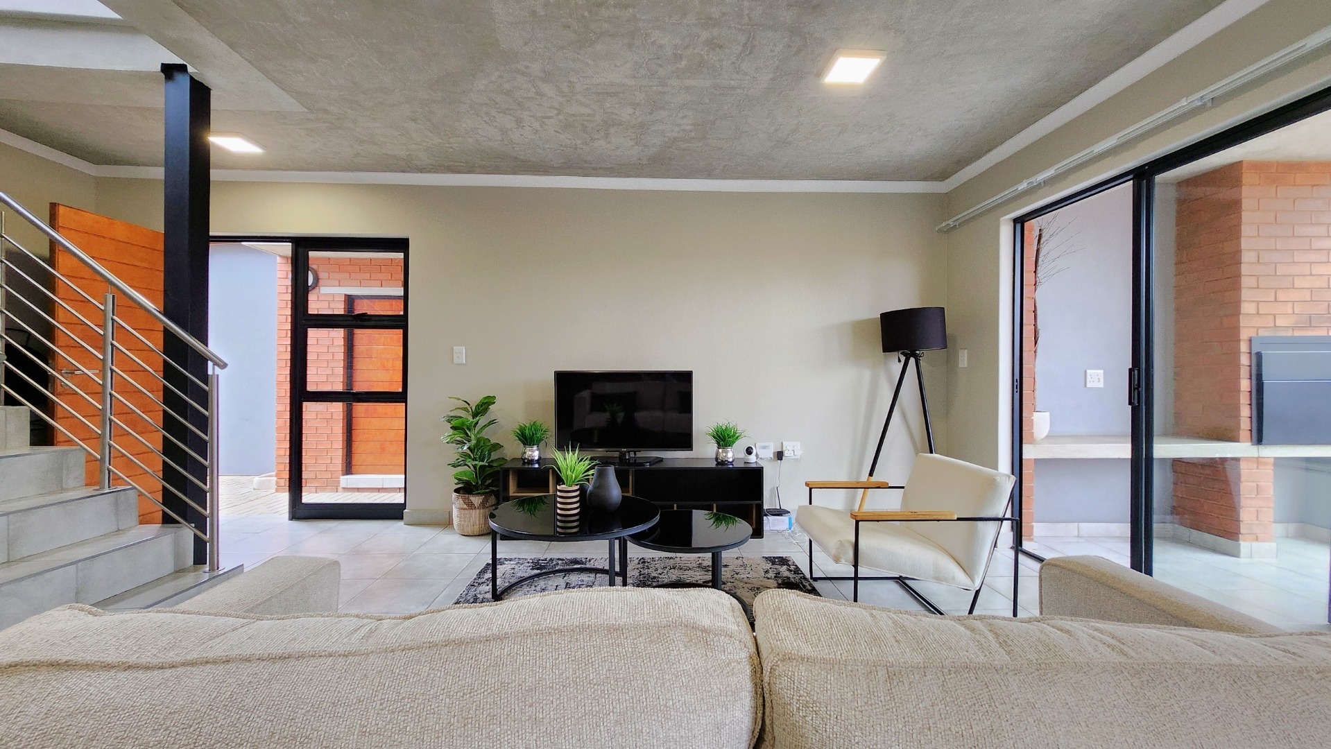 This well-designed 3-bedroom, 2-bathroom apartment offers a stylish open-plan layout. The modern kitchen is fitted with an electric oven and hob and flows seamlessly into a spacious living area, opening onto a covered patio with a built-in braai and a small private garden—perfect for relaxed weekends or entertaining.