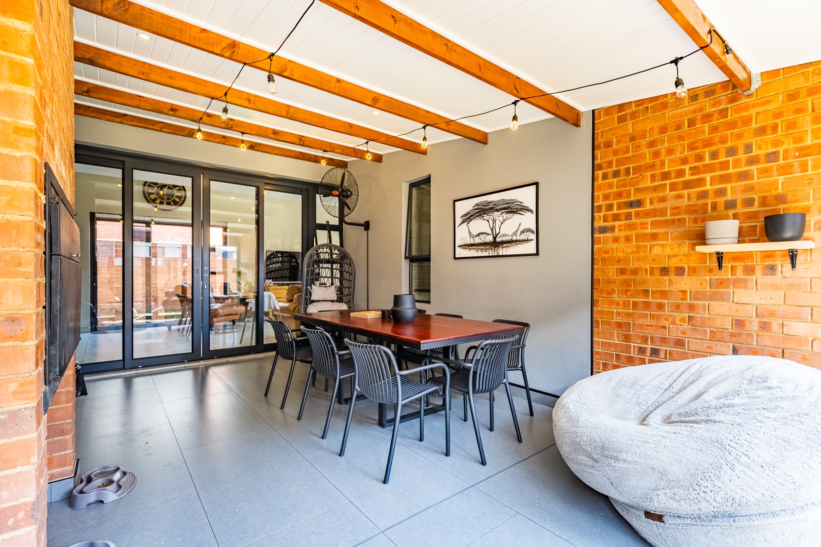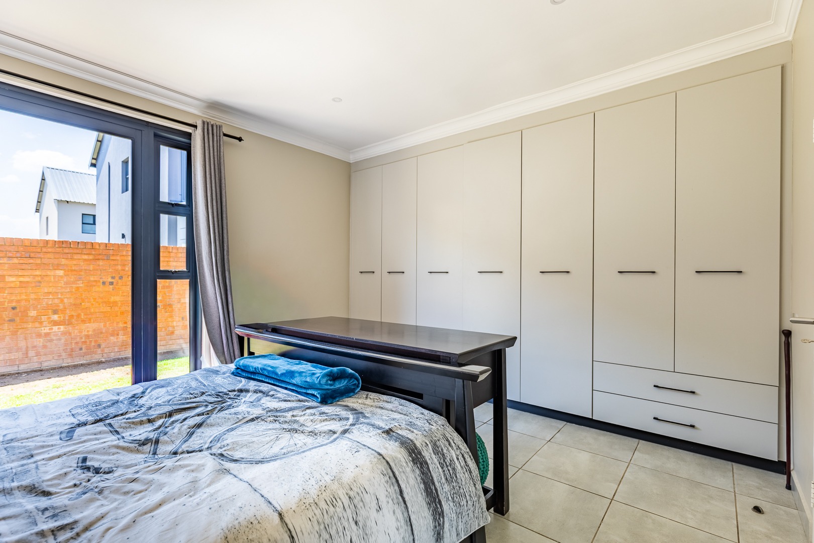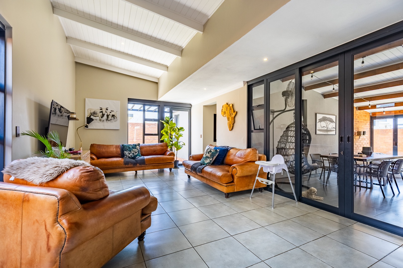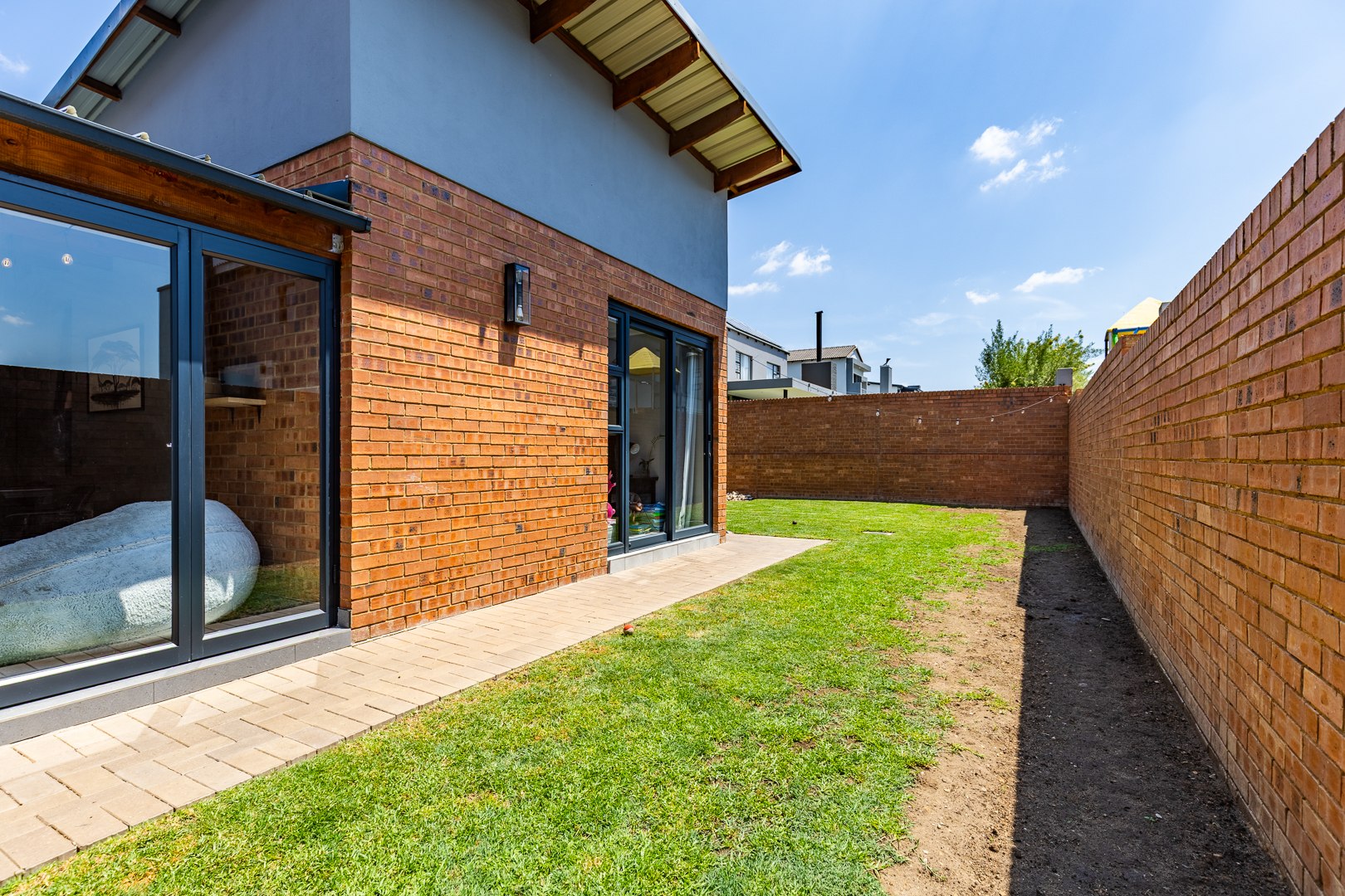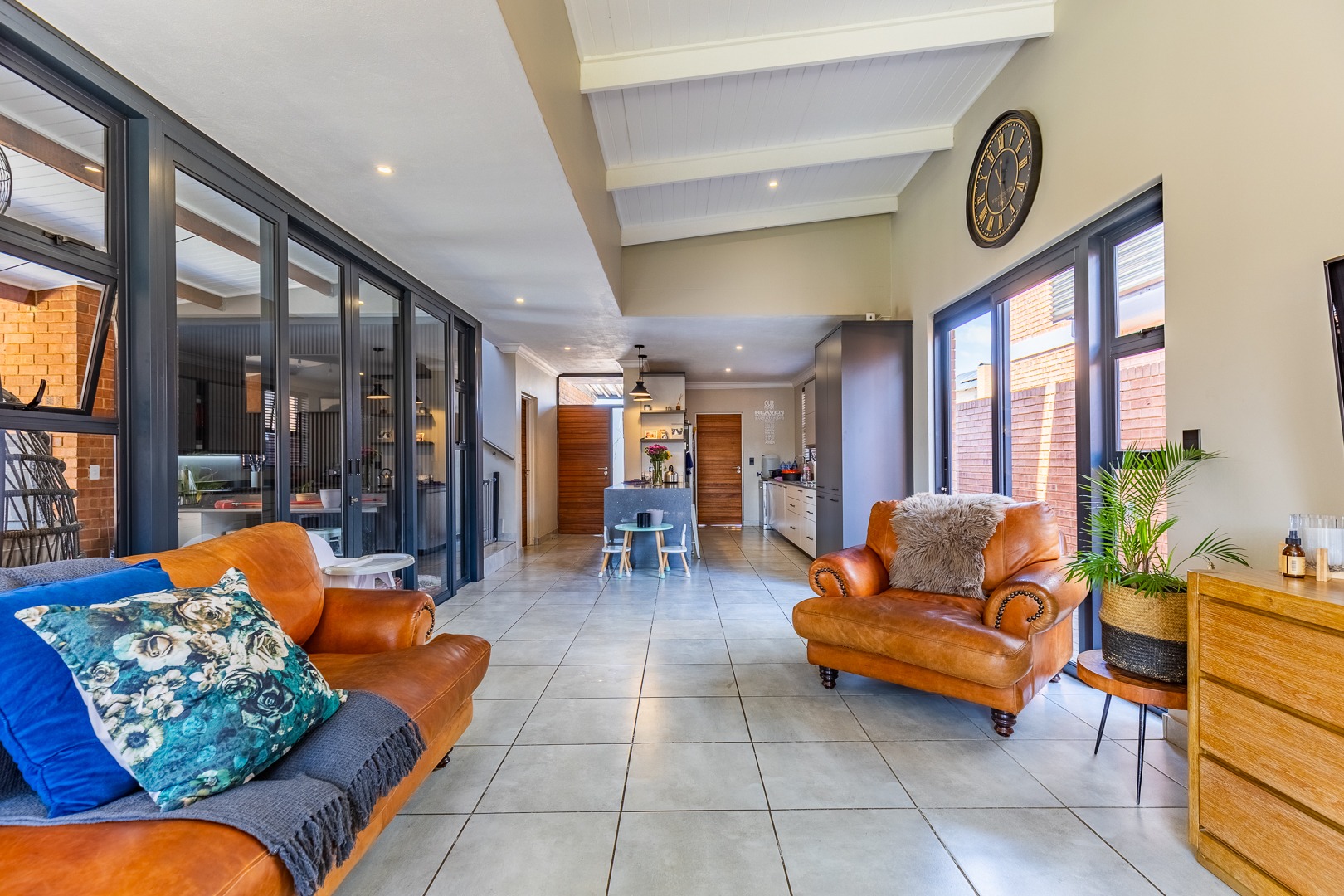 The spacious lounge flows effortlessly into an enclosed patio, perfect for entertaining. This versatile space can be used as a dining room or braai area, with large aluminum sliding doors that open onto a beautifully landscaped garden — ideal for children and pets to enjoy.