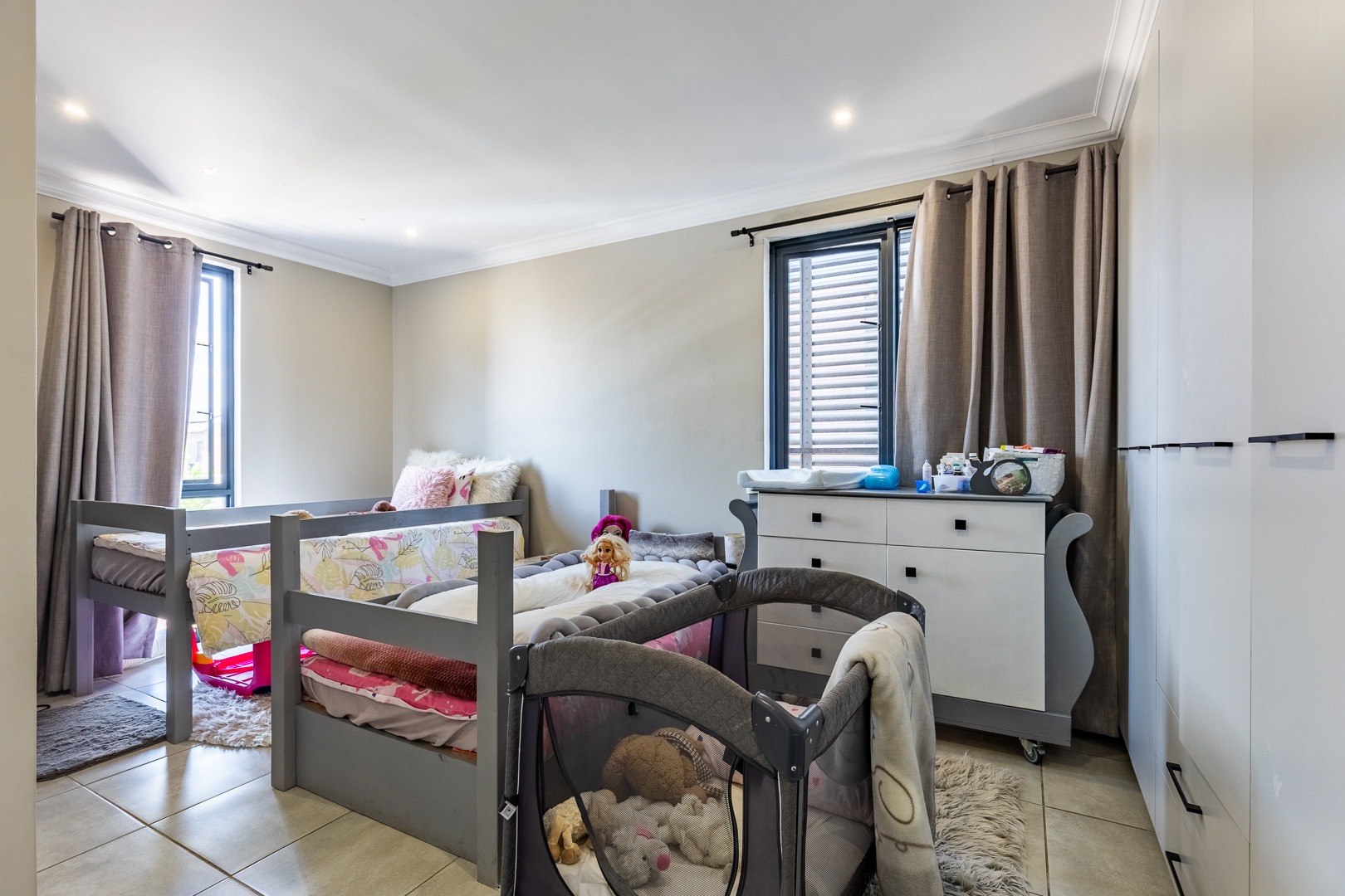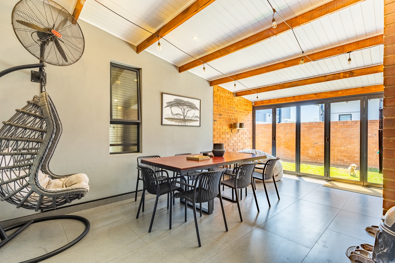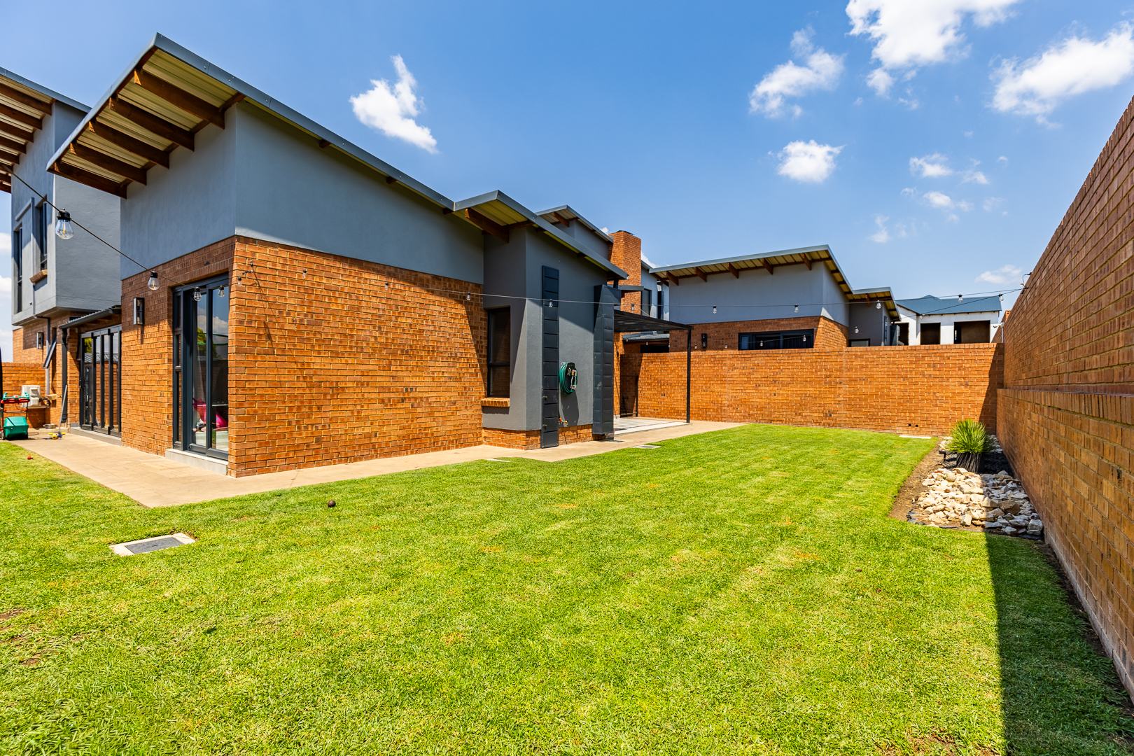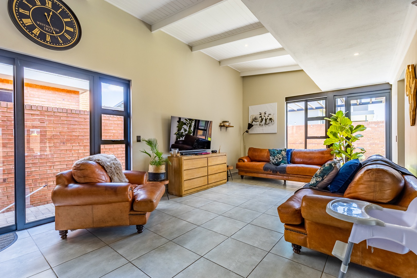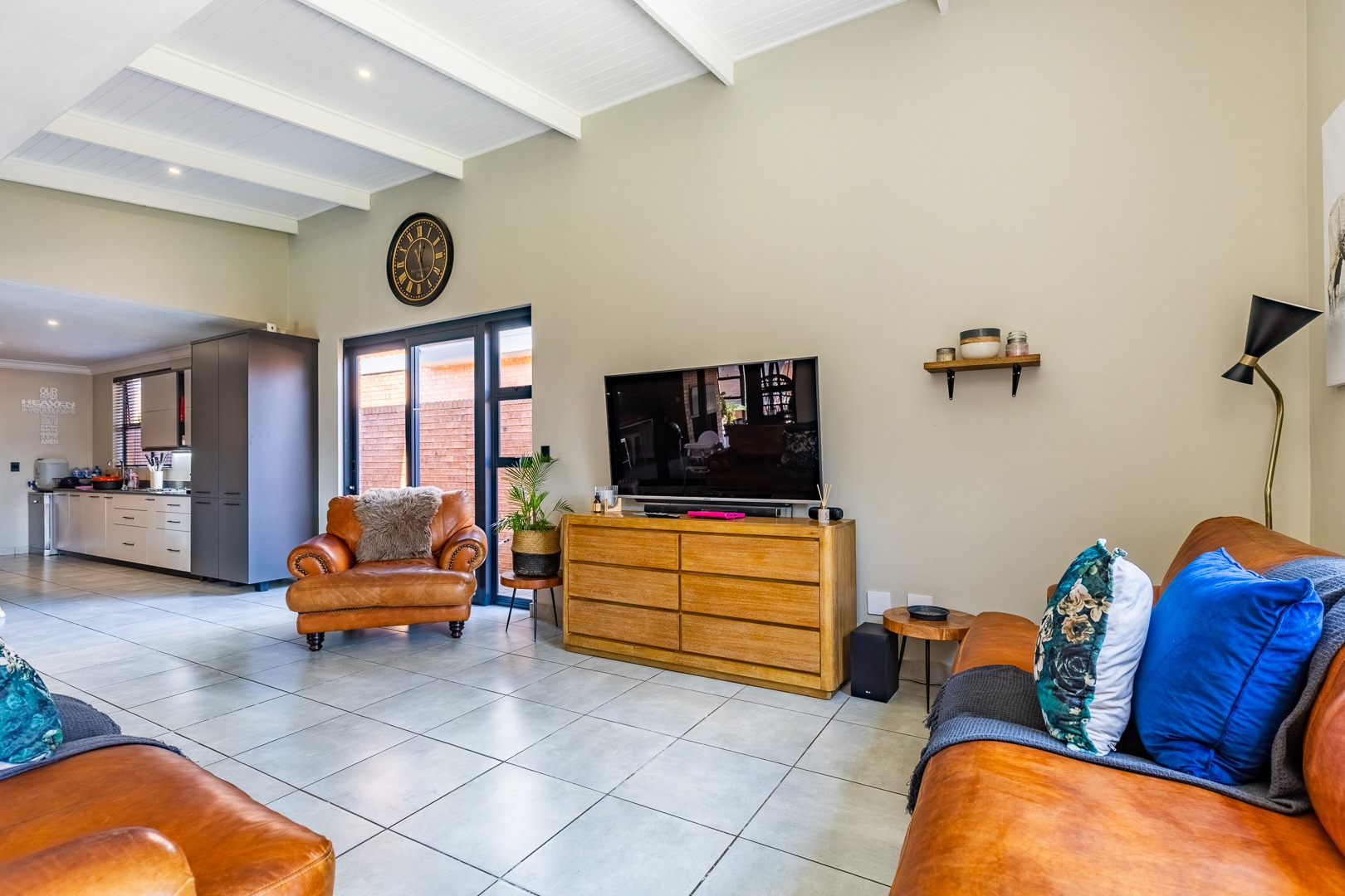 The spacious lounge flows effortlessly into an enclosed patio, perfect for entertaining. This versatile space can be used as a dining room or braai area, with large aluminum sliding doors that open onto a beautifully landscaped garden — ideal for children and pets to enjoy.