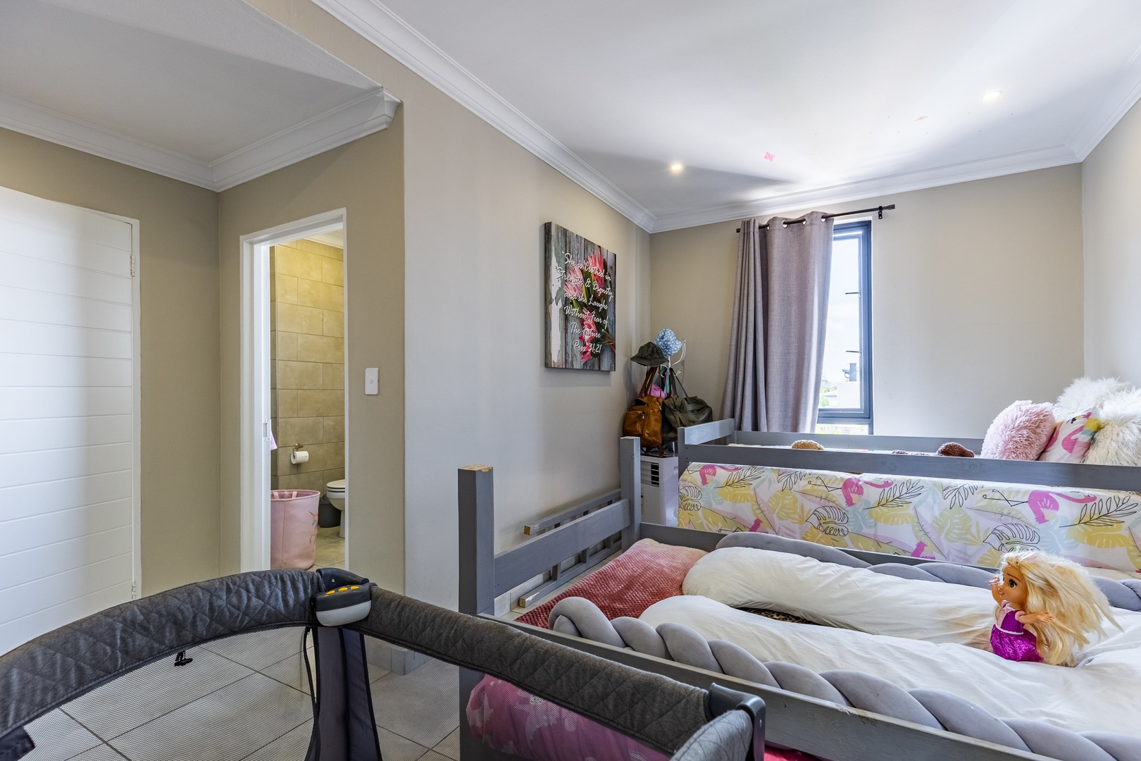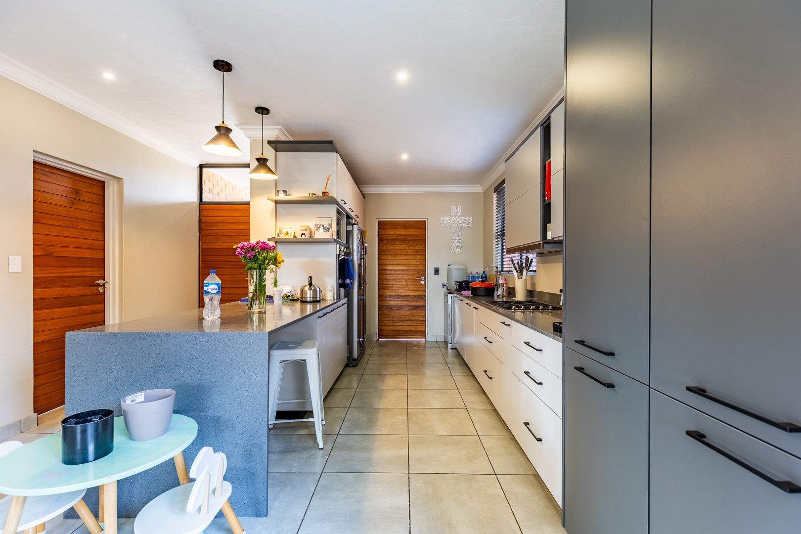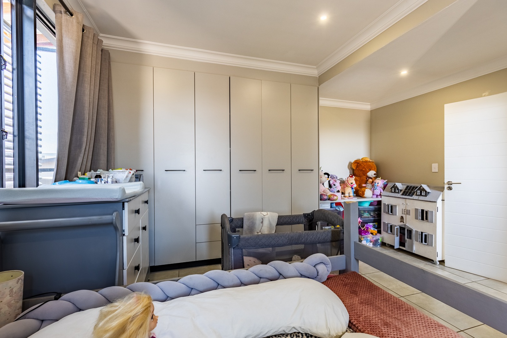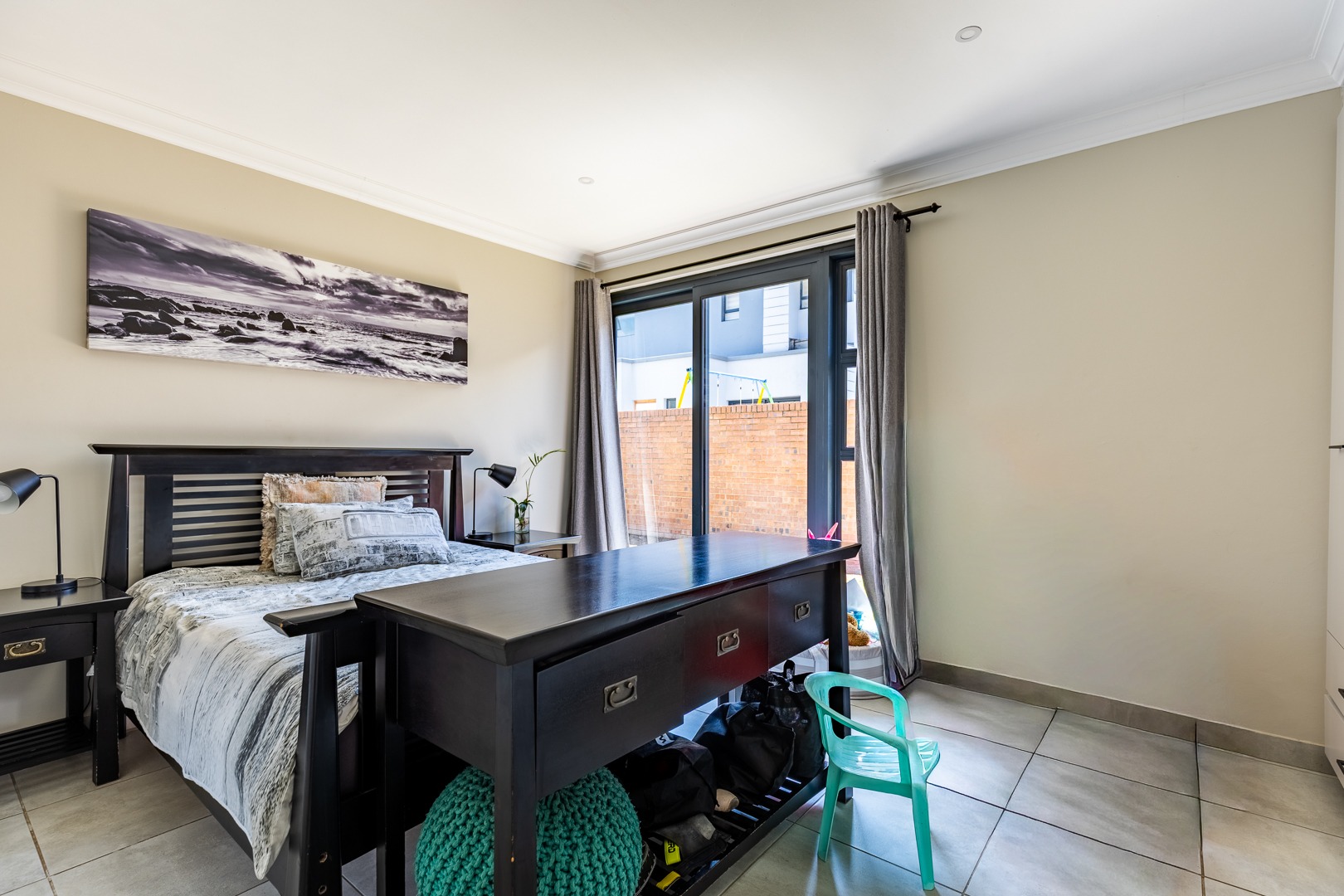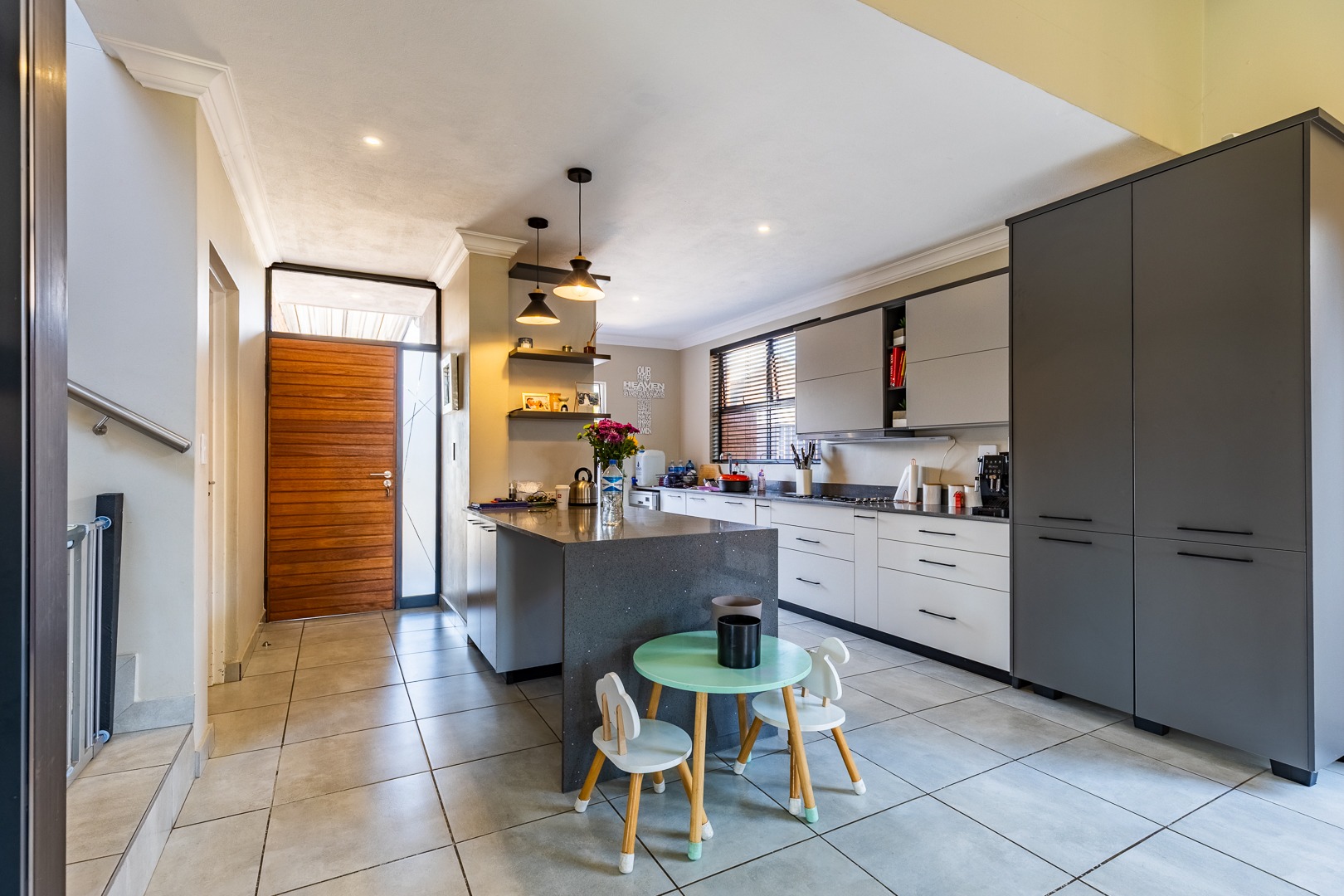 The spacious lounge flows effortlessly into an enclosed patio, perfect for entertaining. This versatile space can be used as a dining room or braai area, with large aluminum sliding doors that open onto a beautifully landscaped garden — ideal for children and pets to enjoy.