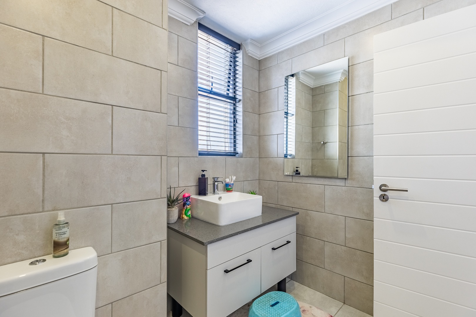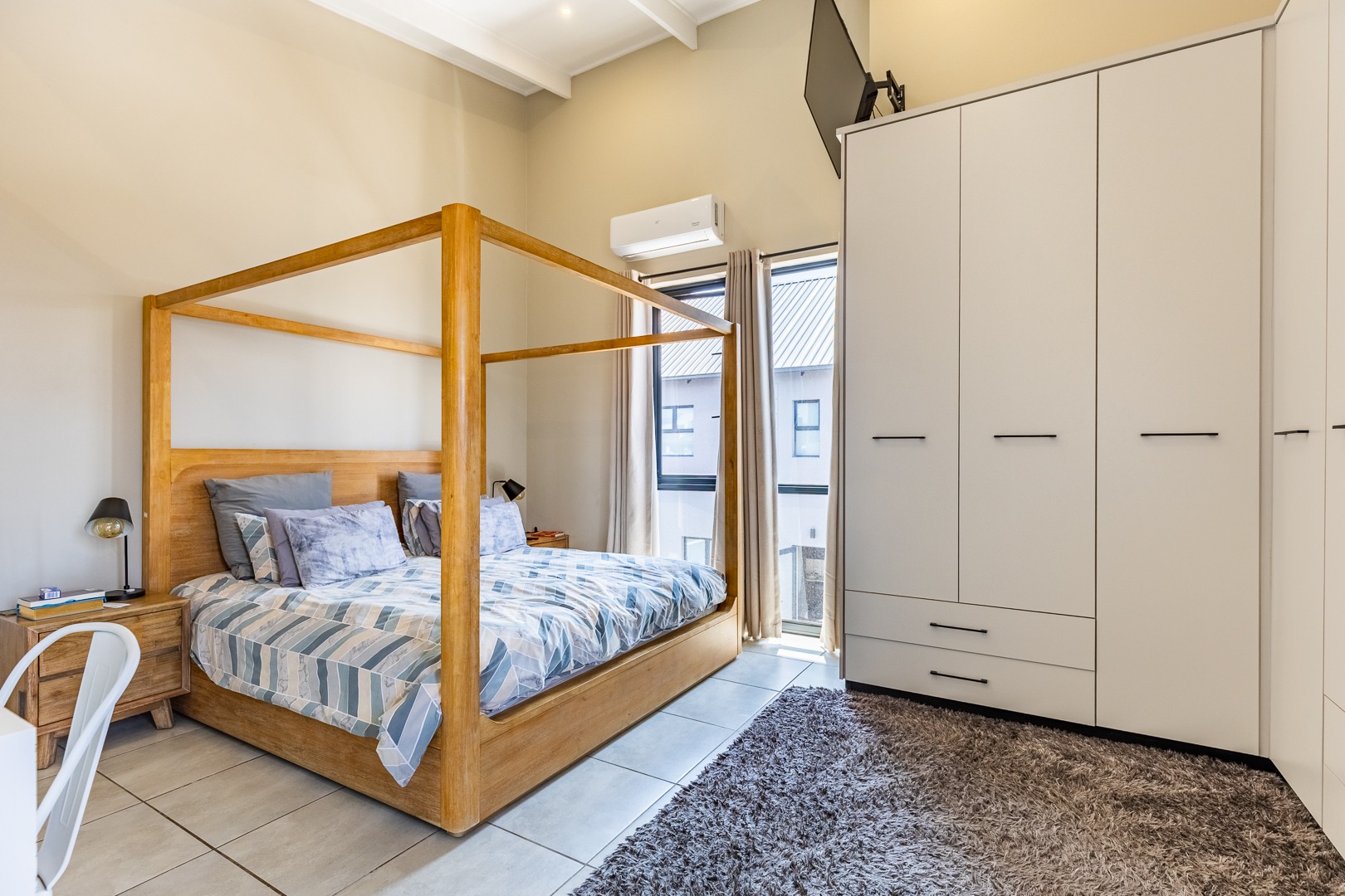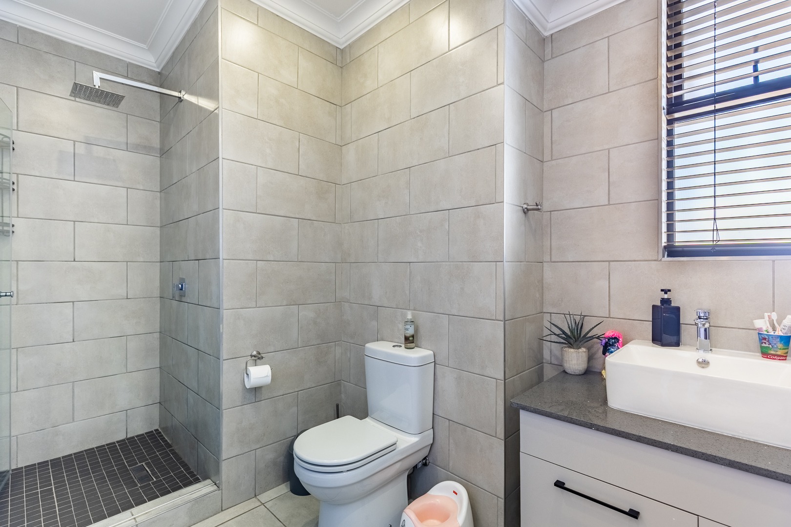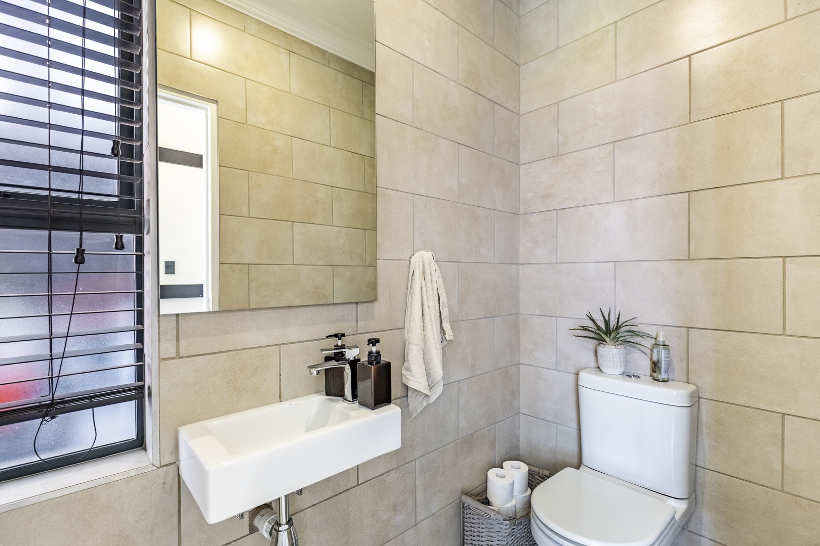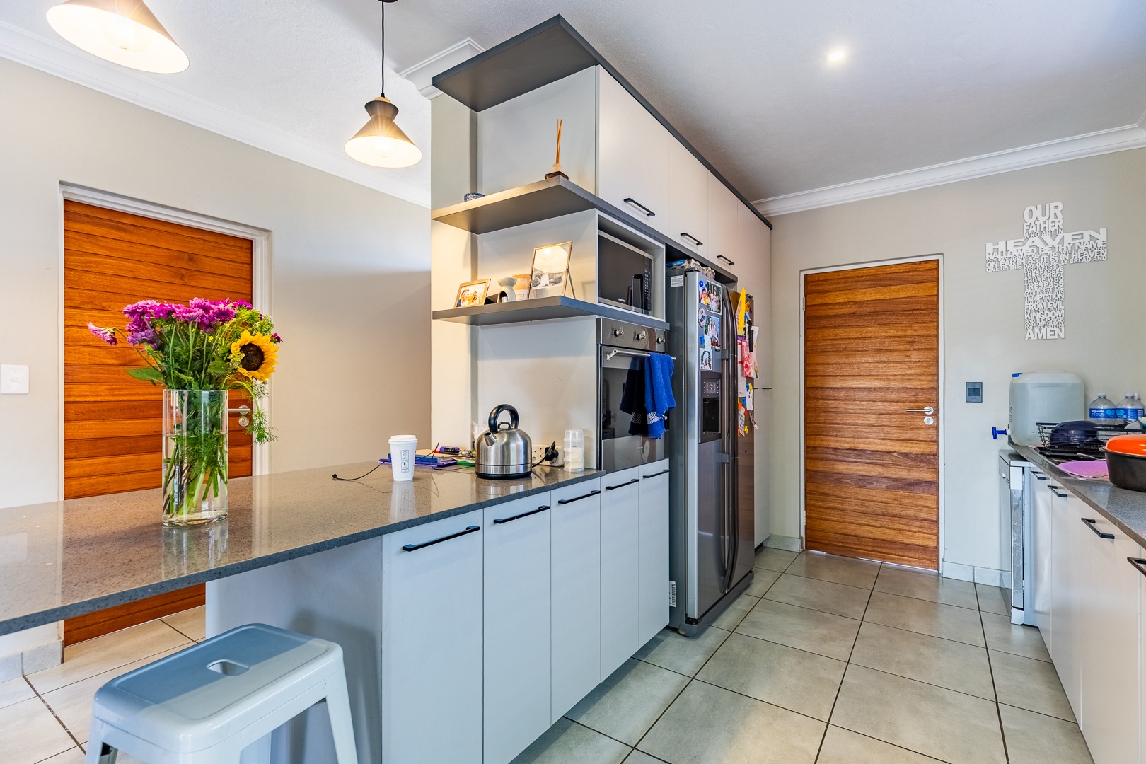 The spacious lounge flows effortlessly into an enclosed patio, perfect for entertaining. This versatile space can be used as a dining room or braai area, with large aluminum sliding doors that open onto a beautifully landscaped garden — ideal for children and pets to enjoy.