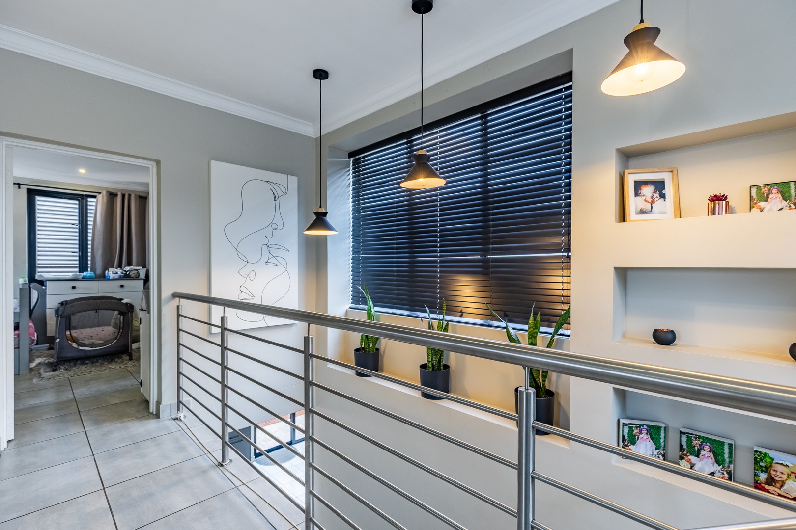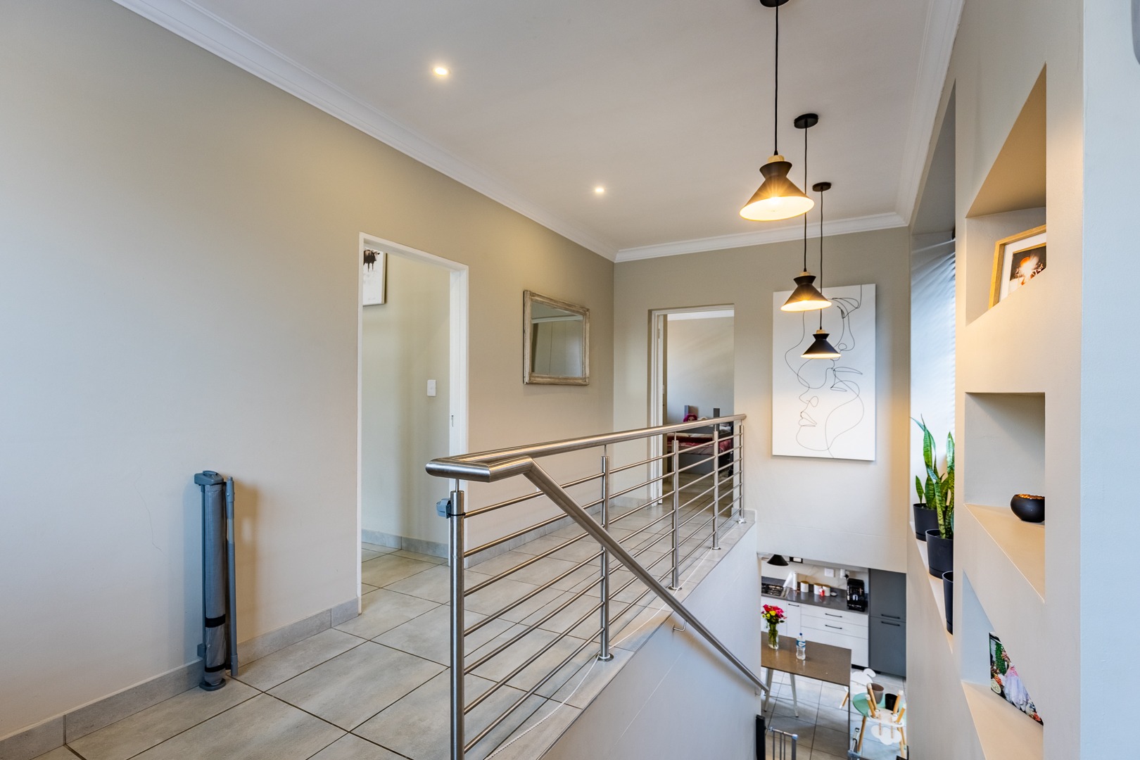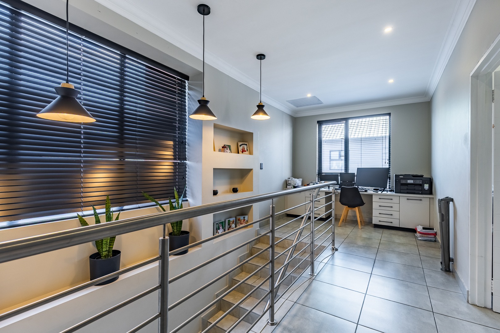 A landing area with built-in cupboards makes for a perfect study nook or home office.