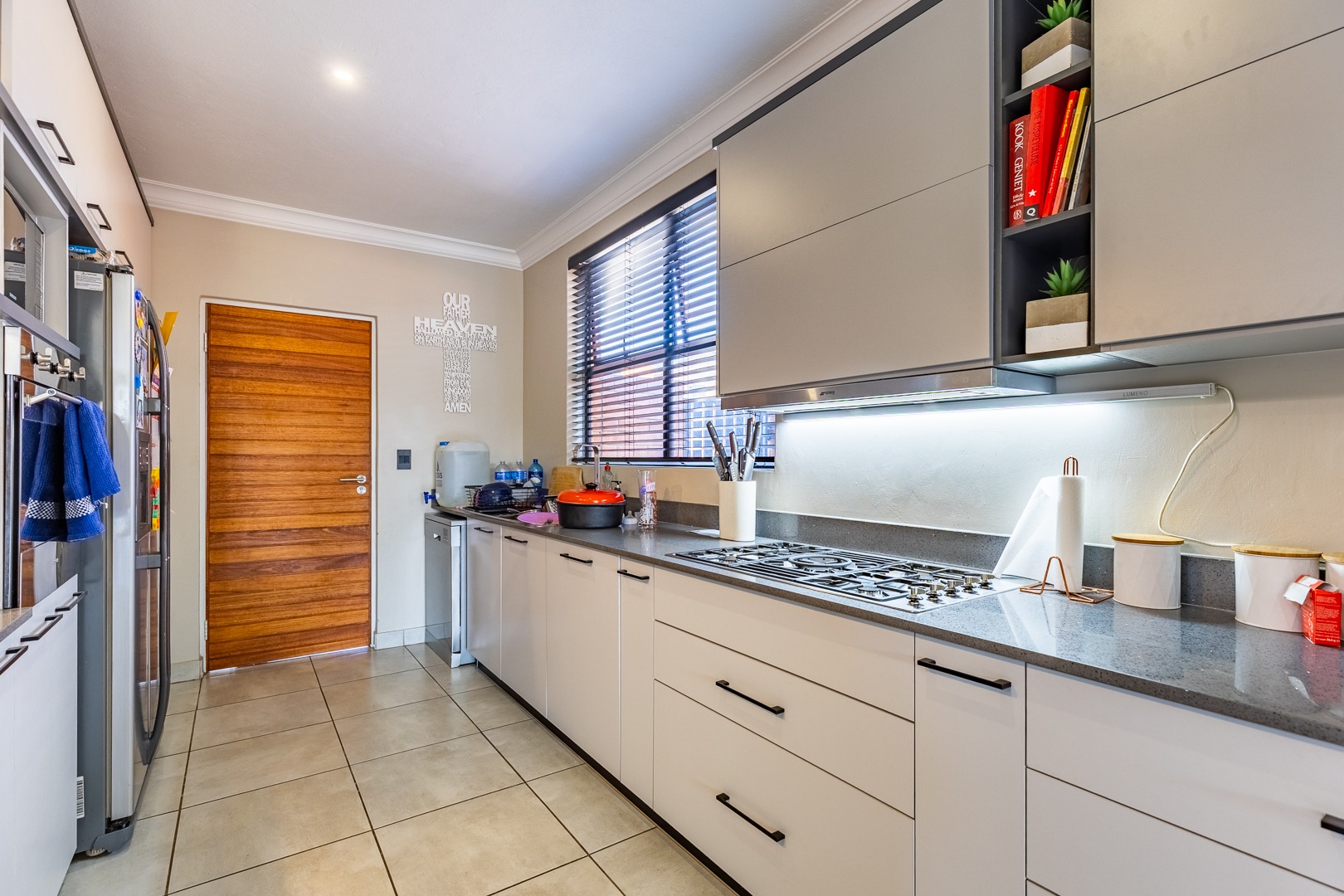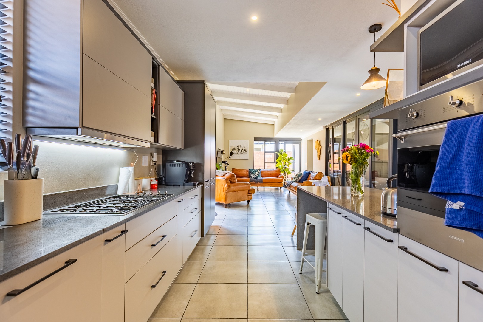 Step into a stylish open-plan living area featuring a modern kitchen with sleek countertops, a five-burner gas hob, space for a double-door fridge, and connections for all your major appliances. The double automated garage offers direct access into the home for added convenience.
