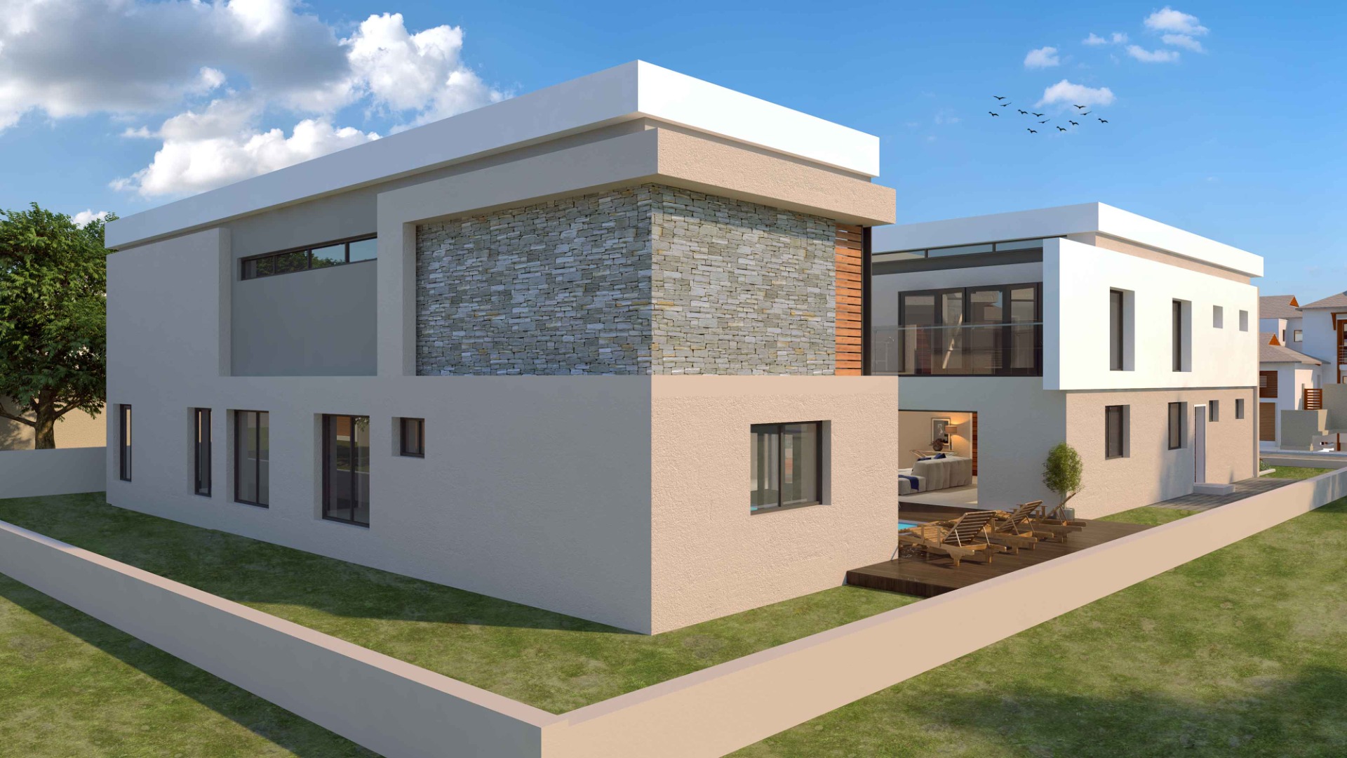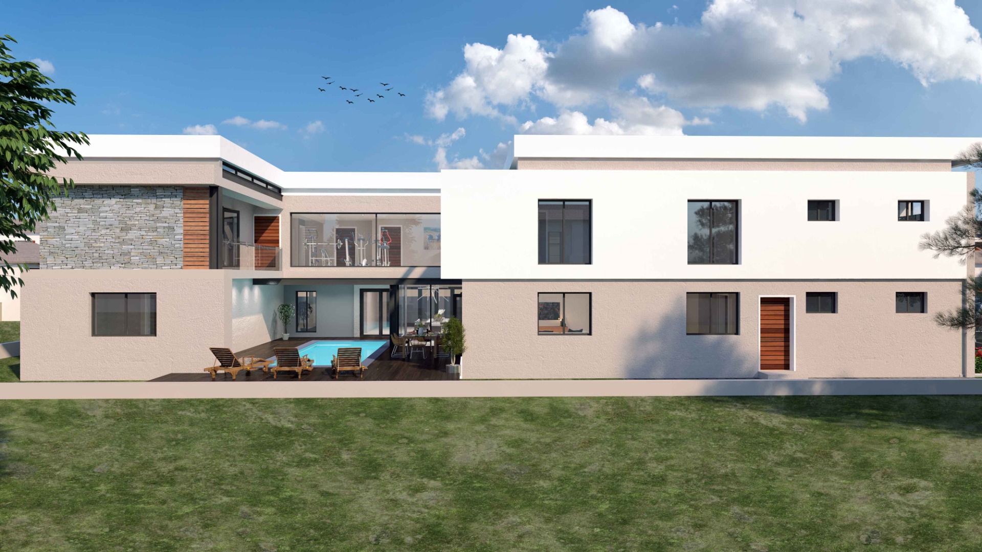 The design has been thoughtfully created for modern family living and effortless entertaining, featuring expansive open-plan living areas, a dining space, and a well-positioned kitchen with separate scullery and laundry. These spaces flow seamlessly onto a covered patio, timber deck, and a planned swimming pool, creating a refined indoor-outdoor lifestyle ideal for both family living and entertaining.