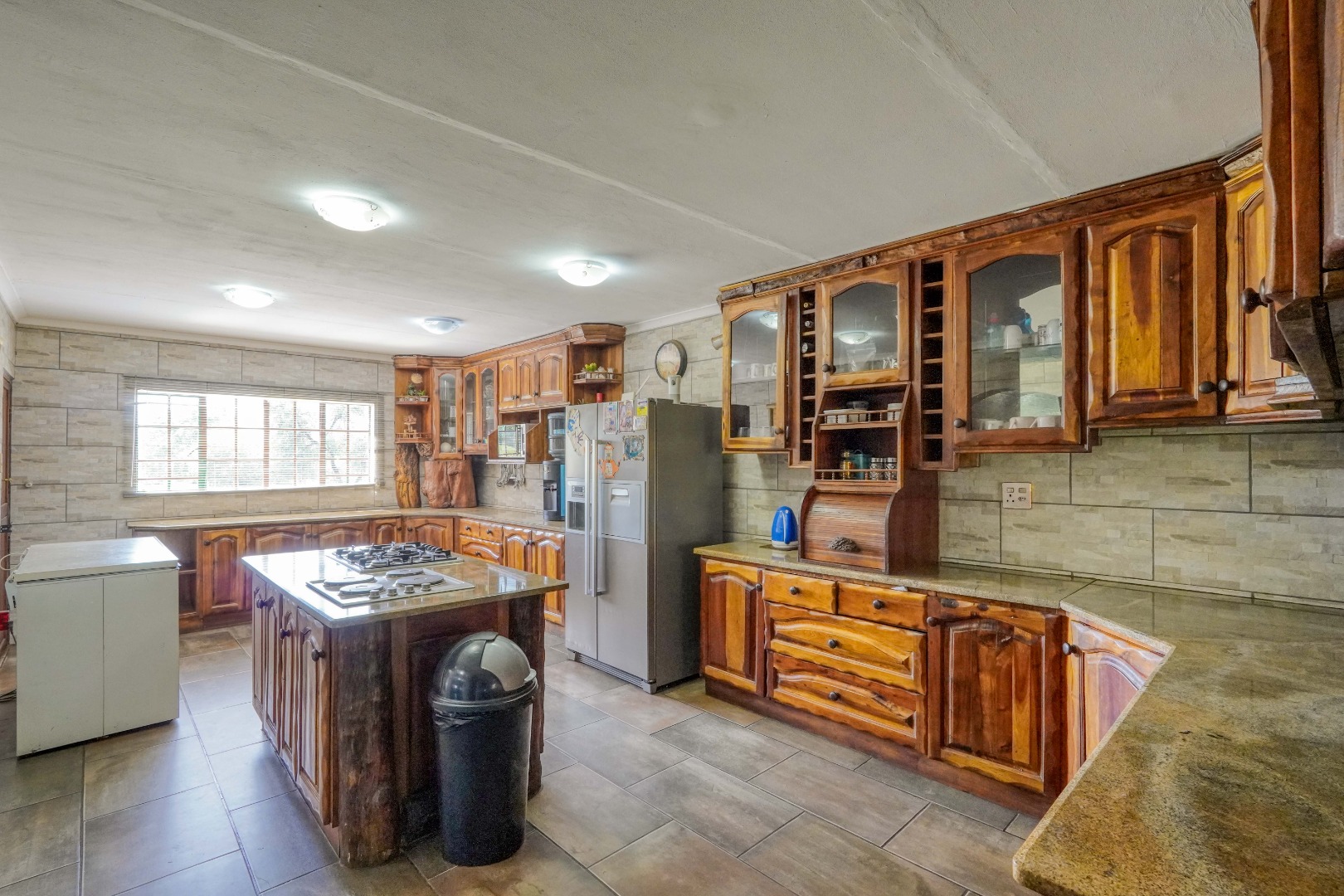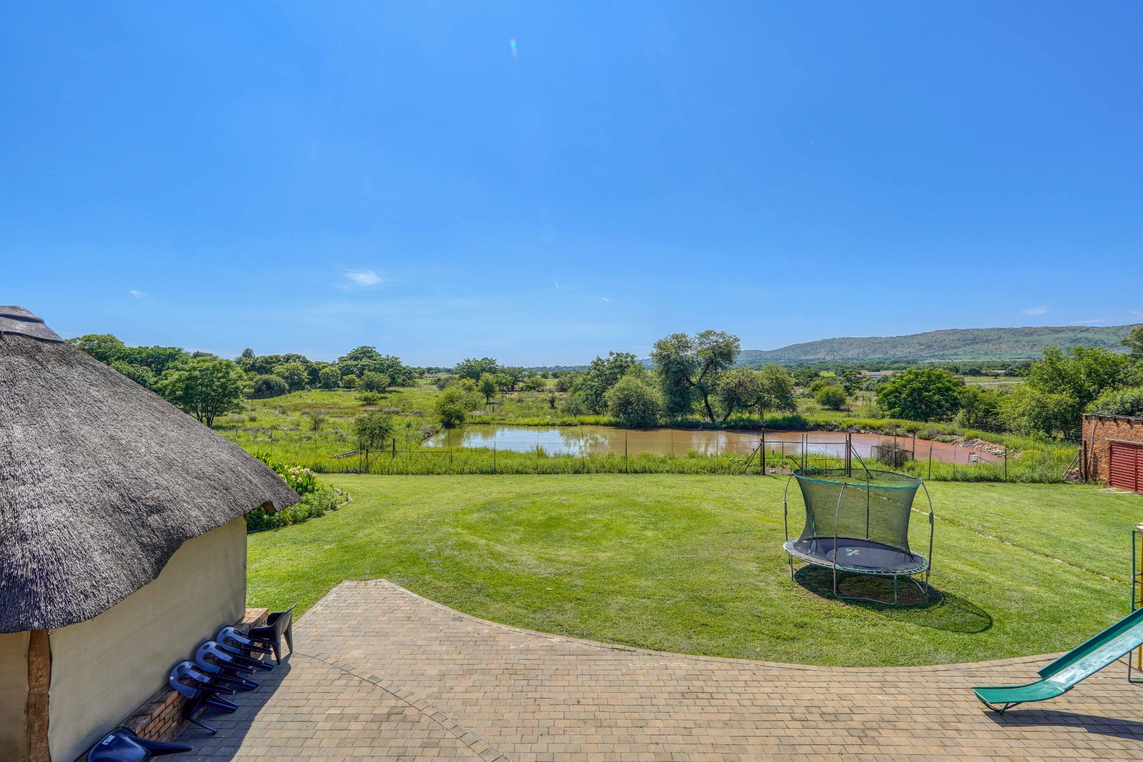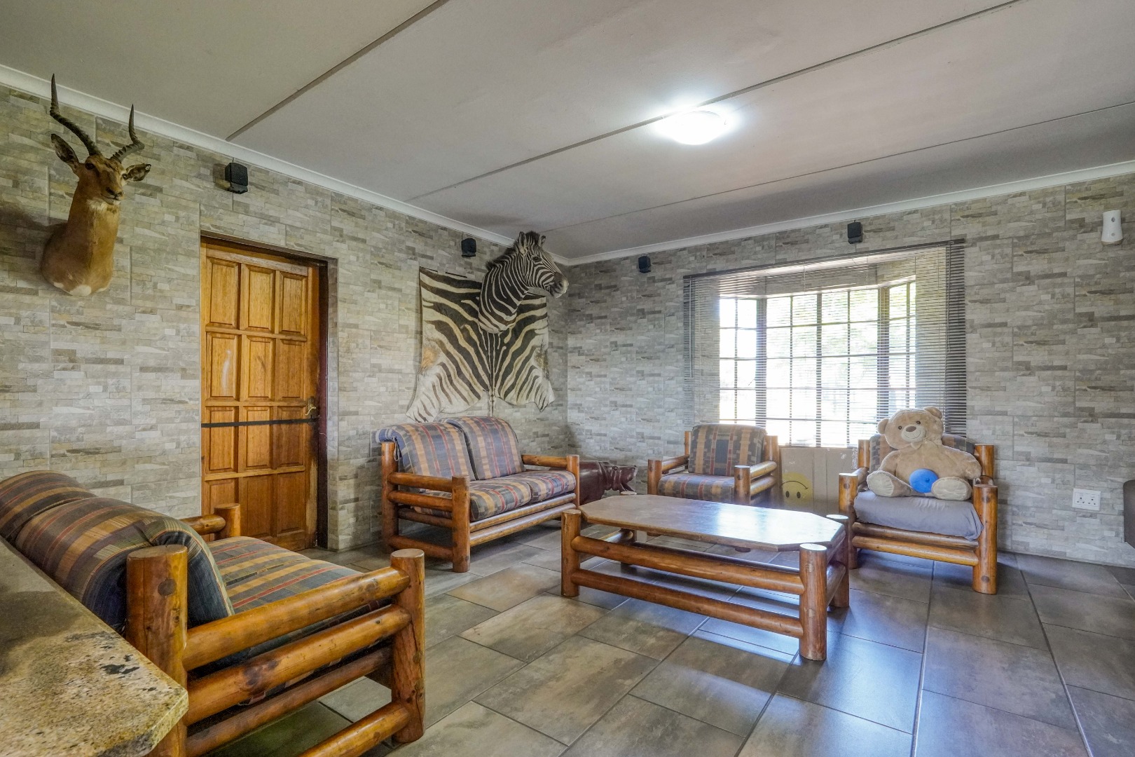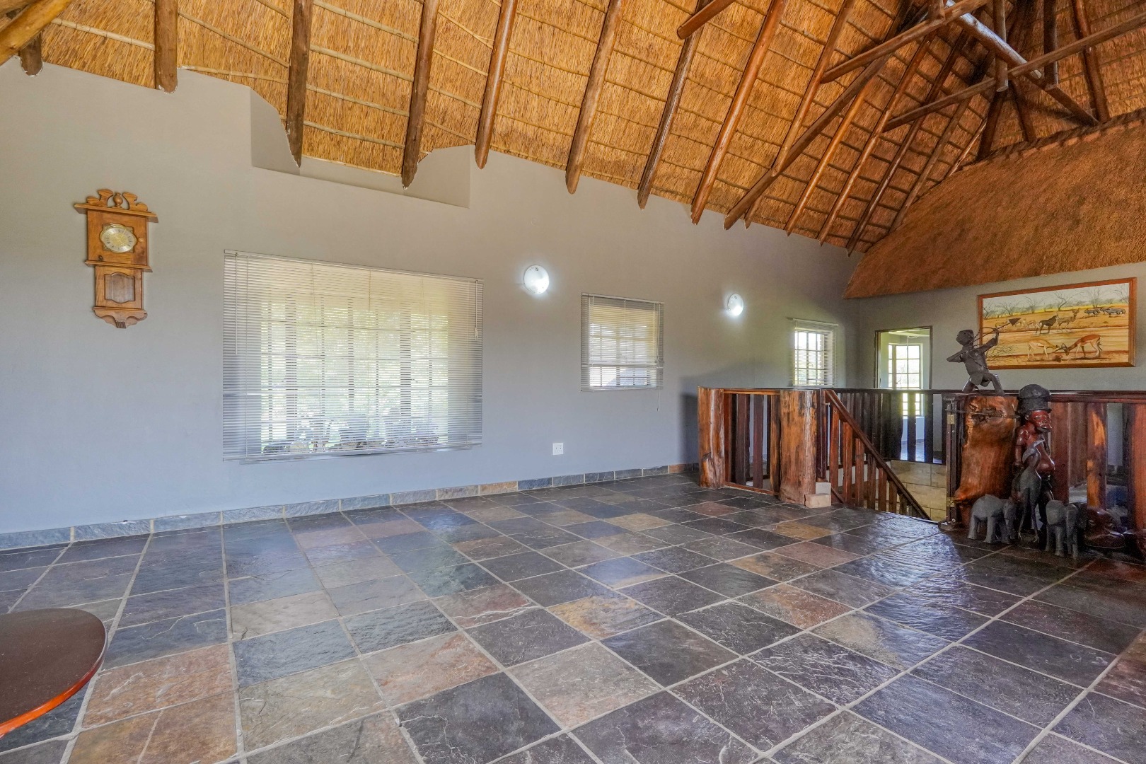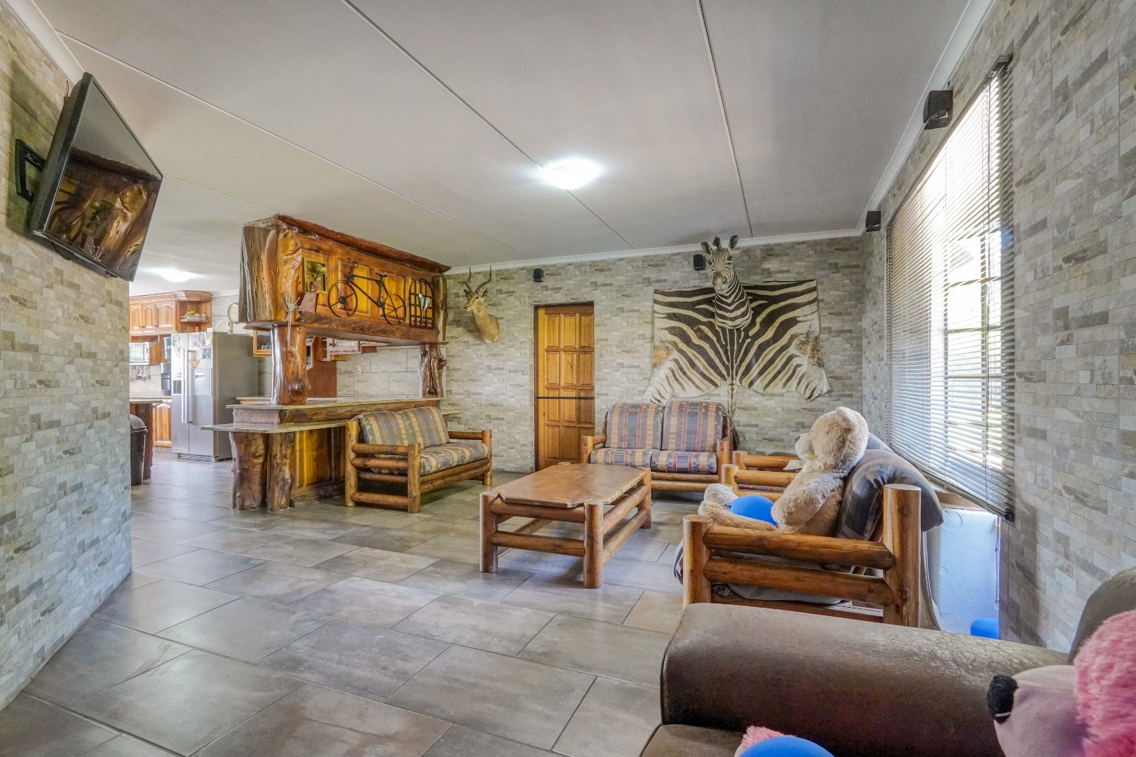 Nature flows directly into the home thanks to a striking indoor waterfall and fish pond feature. Outdoors, the setting is equally impressive, with landscaped gardens, abundant birdlife, and a large dam stocked with tilapia and carp. The front hectare is fully under irrigation, ideal for cultivation, hobby farming, or expanding food production. Two boreholes serve the property, with one currently in working order, supported by a French drain and grey-water pit for sustainable living.