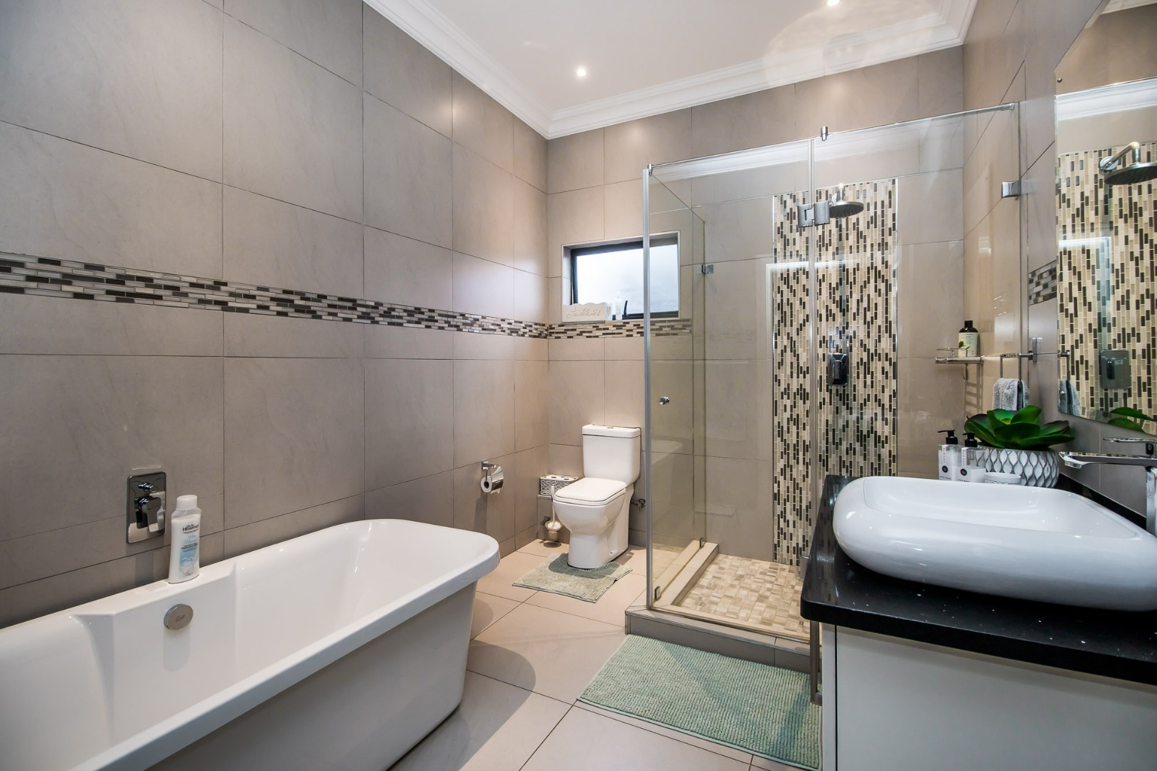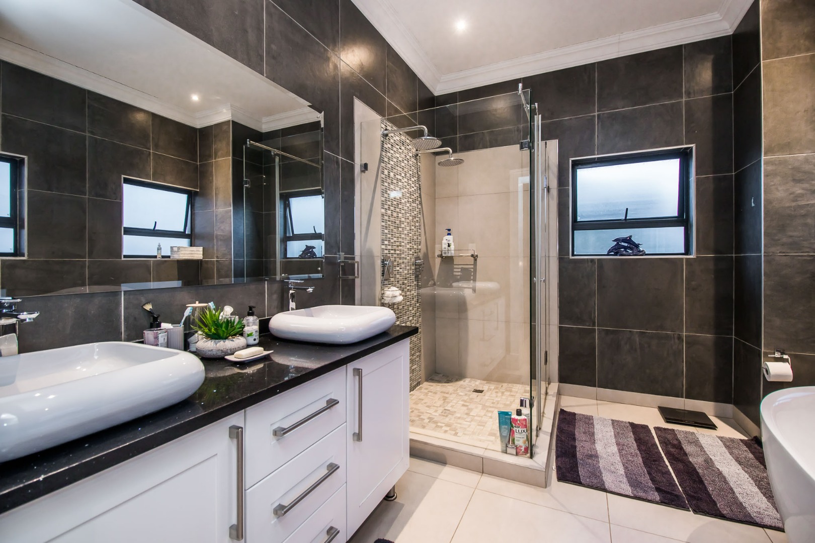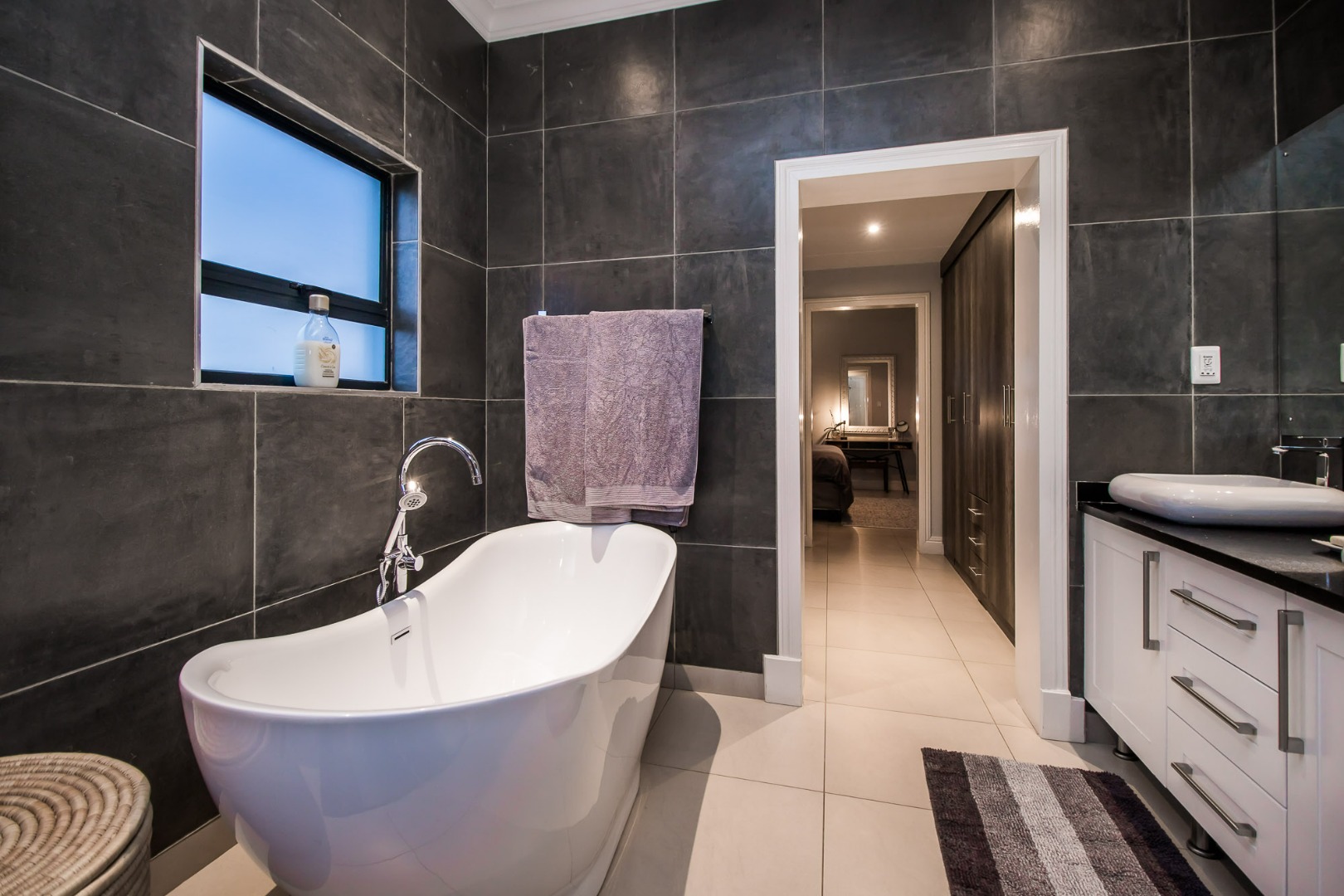 The spacious main bedroom has a full bathroom with double vanities and a free-standing bath. A walk-through closet with ample cupboard space.