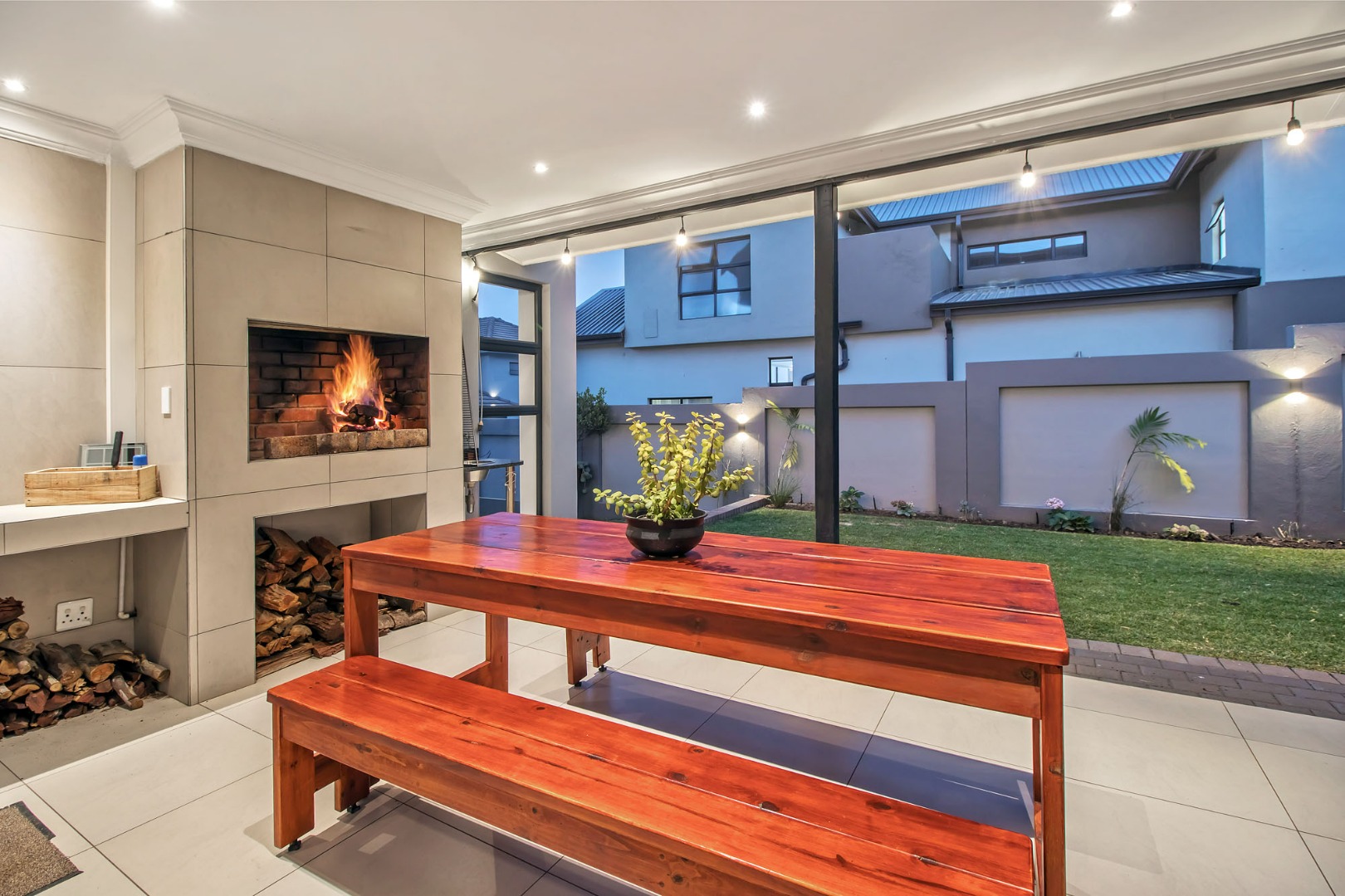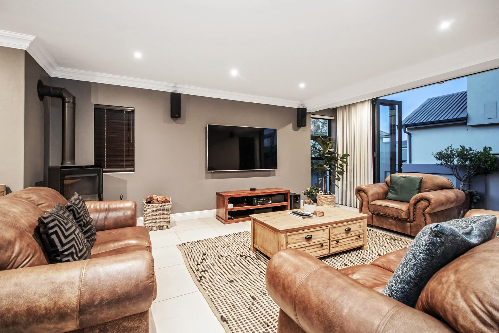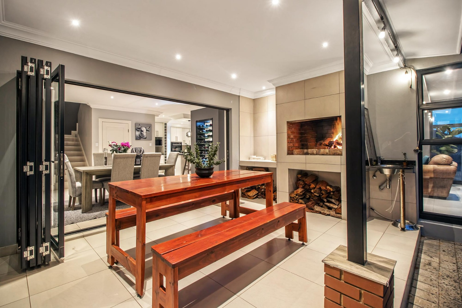 A Large open plan living area, and dining area open up onto a covered patio with stack and fold aluminium doors and built-in braai. The lounge has a wood fireplace ensuring a cosy and warm place to relax in the winter months.