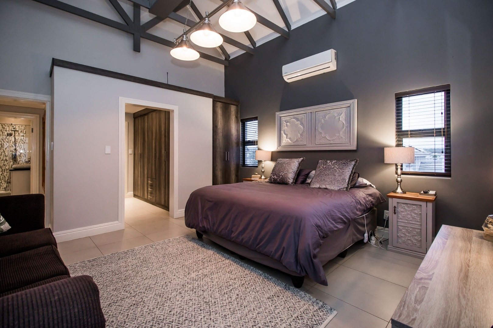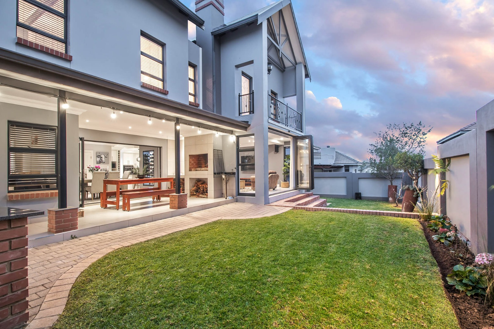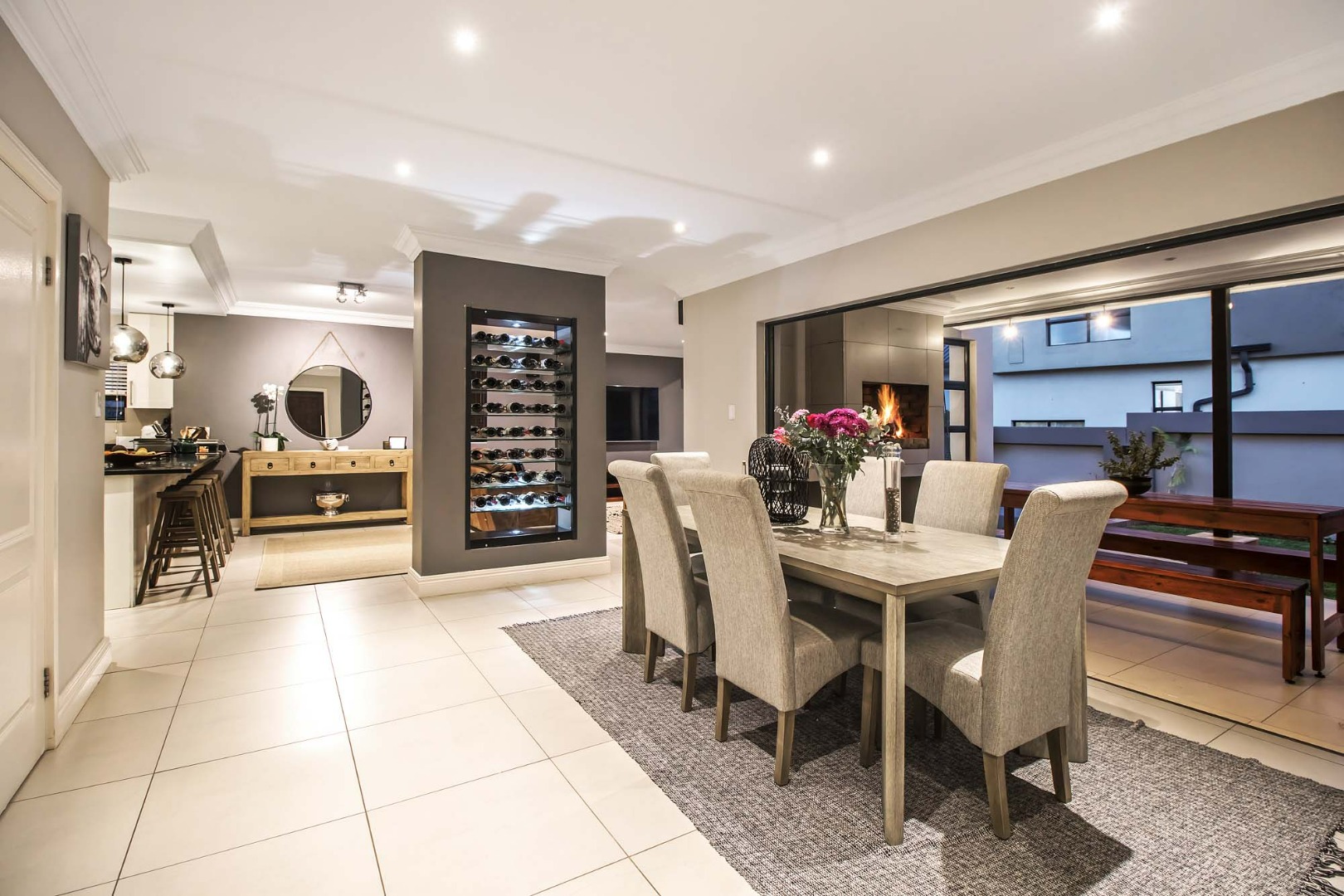 A Large open plan living area, and dining area open up onto a covered patio with stack and fold aluminium doors and built-in braai. The lounge has a wood fireplace ensuring a cosy and warm place to relax in the winter months.