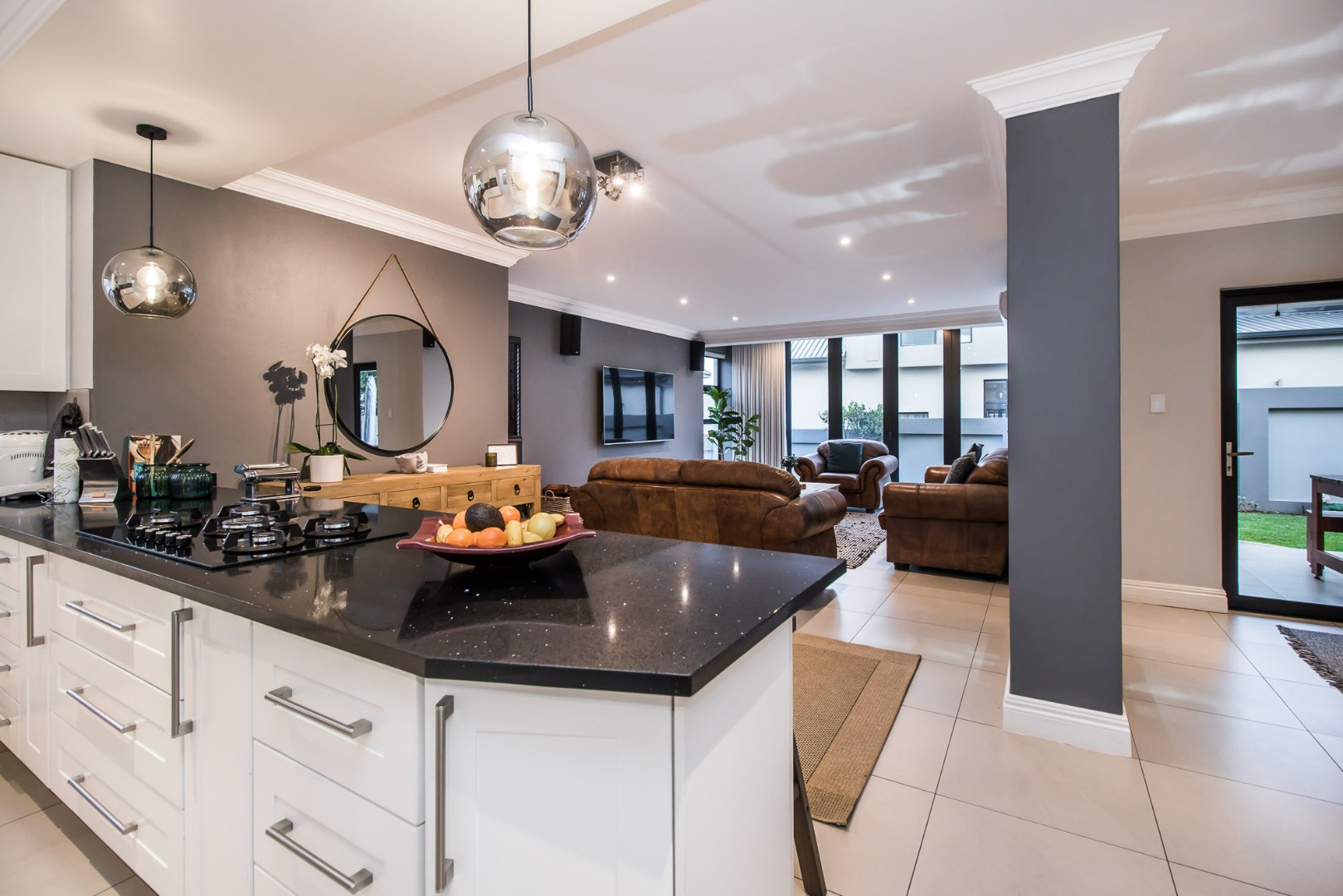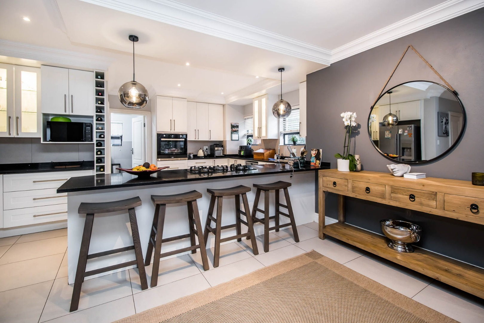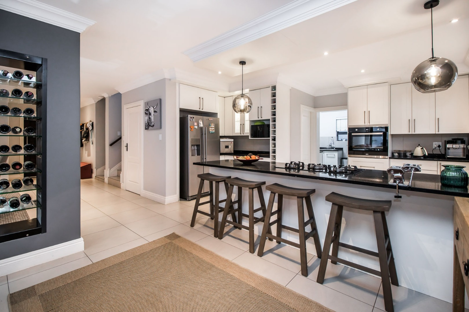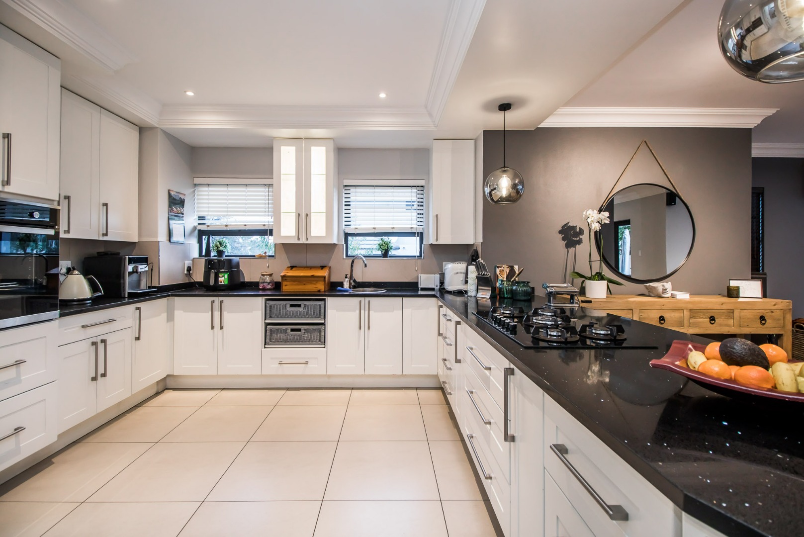 Upon entering the home the open flow of the home ensure a feeling of space and openness. A beautiful, well-designed kitchen equipped with a gas hob with a spacious scullery adds to the comfort of this home.