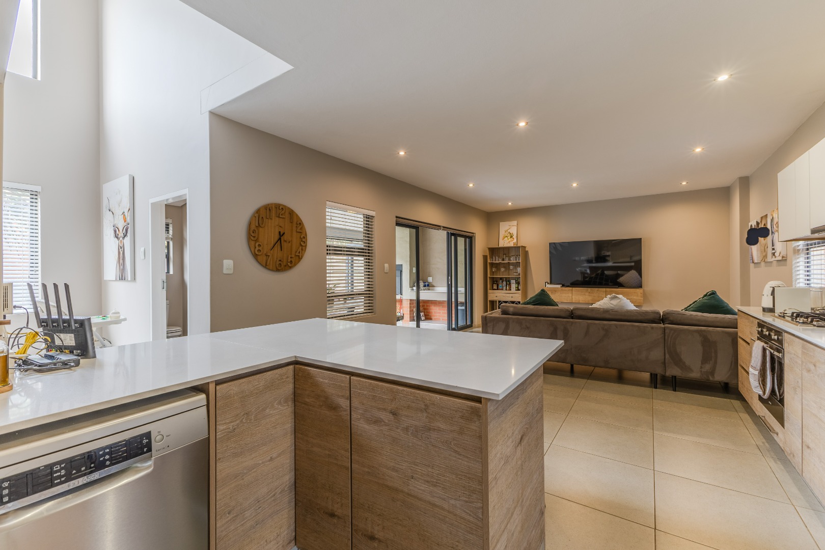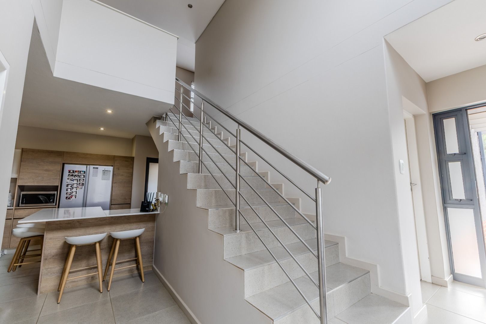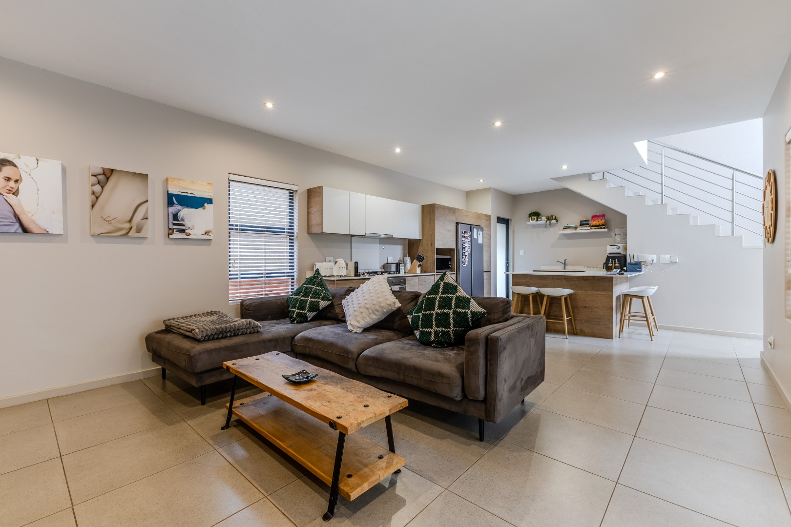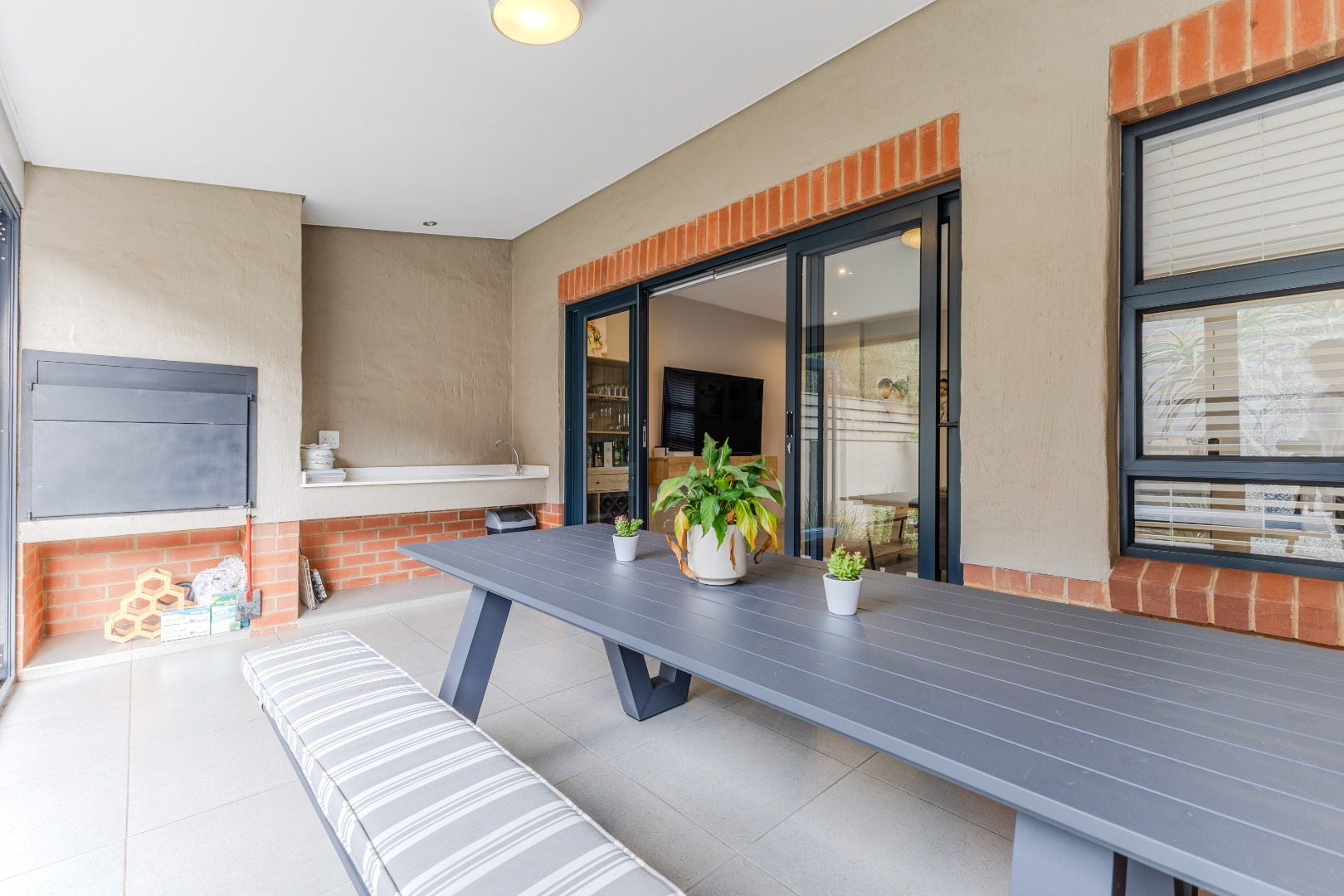 Discover modern living in this stylish 3-bedroom, 2.5-bathroom home located within the prestigious The Hills Game Reserve Estate in Pretoria. This contemporary residence boasts an inviting open-plan layout, seamlessly connecting the living, dining, and kitchen areas. The sleek kitchen features two-tone cabinetry, integrated stainless steel appliances including a gas hob and oven, a microwave, and a convenient breakfast bar, perfect for casual dining and entertaining. The property offers three well-appointed bedrooms, with the main bedroom benefiting from an en-suite bathroom, ensuring comfort and privacy. An additional full bathroom serves the remaining bedrooms, while a guest toilet on the ground floor adds to the home's practicality. High ceilings and tiled flooring throughout enhance the spacious and clean aesthetic. Step outside to a private, covered patio accessible via large sliding doors, creating an effortless indoor-outdoor flow. This area is ideal for relaxation and features a built-in braai with a prep sink, perfect for entertaining. The compact, landscaped garden provides a tranquil green space. A double garage offers secure parking and additional storage. Residents of this secure estate enjoy 24-hour security, access to a clubhouse, and the unique benefit of a nature reserve lifestyle. The home is equipped with fibre connectivity and solar panels, promoting a sustainable and connected living experience. Pets are also allowed, making it a perfect family home. Key Features: * Modern open-plan living areas * Contemporary kitchen with integrated appliances * Three bedrooms, 2.5 bathrooms (including en-suite) * Covered patio with built-in braai * Double garage * Fibre connectivity and solar panels * 24-hour security in a nature reserve estate * Access to clubhouse facilities