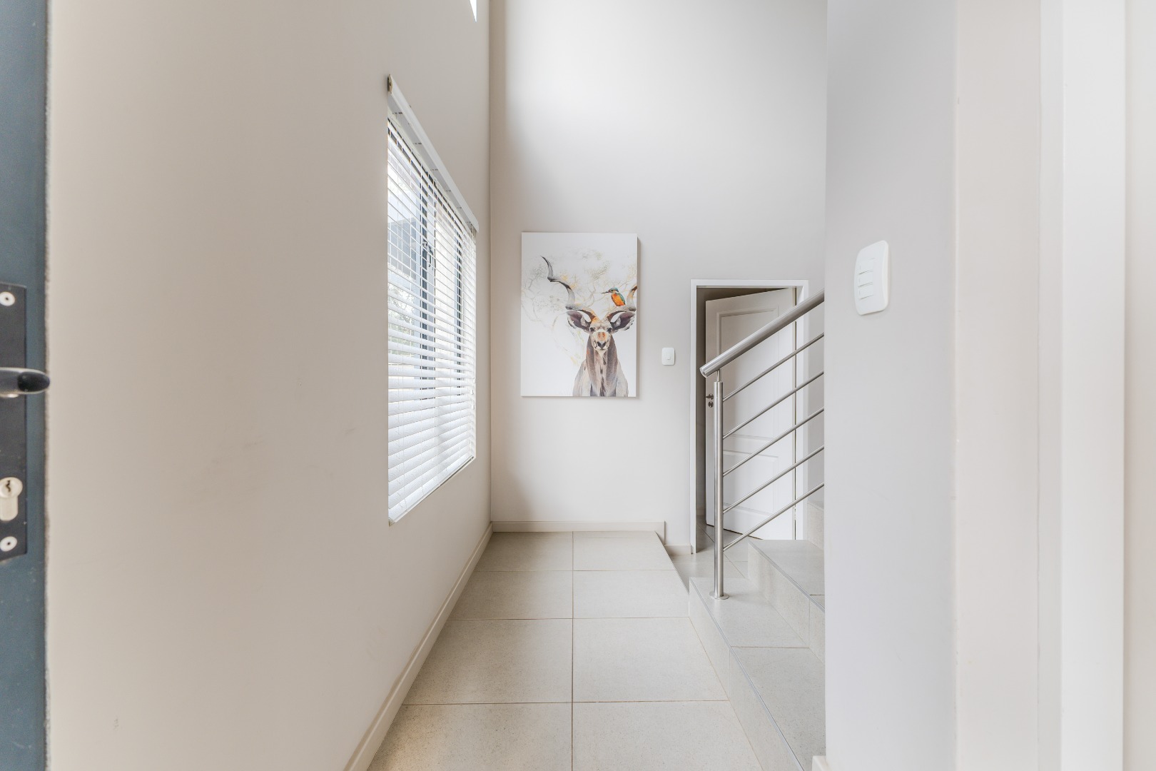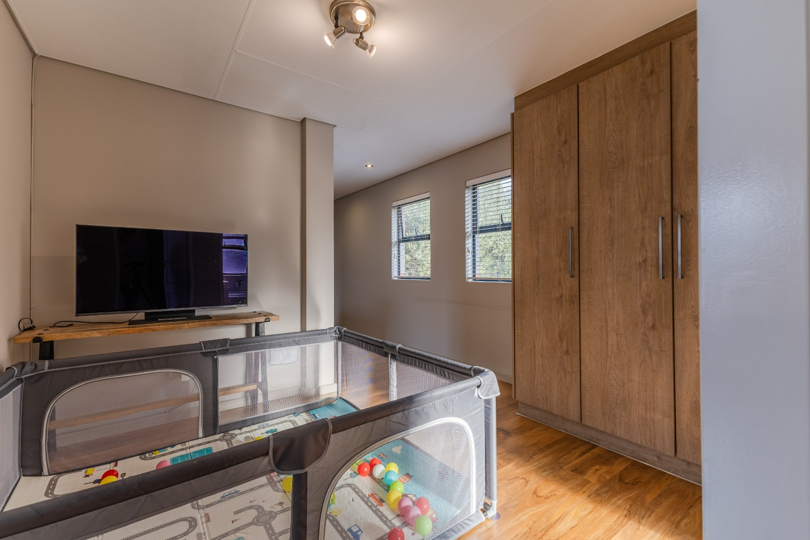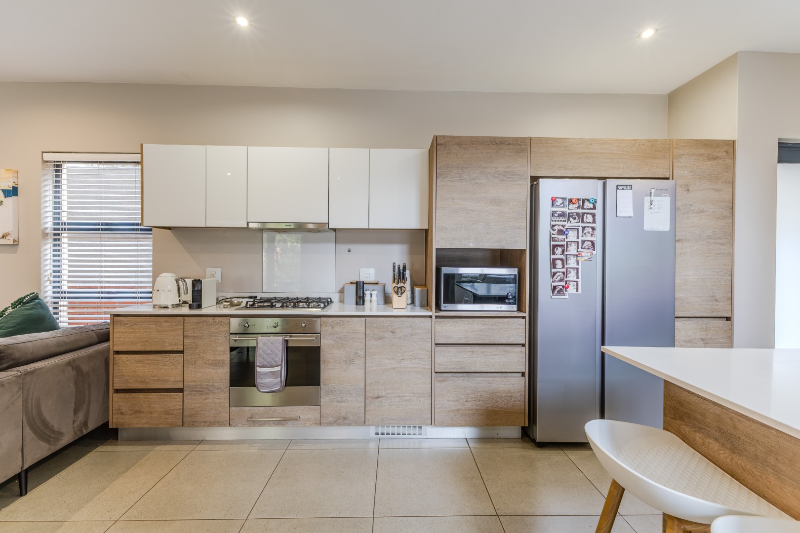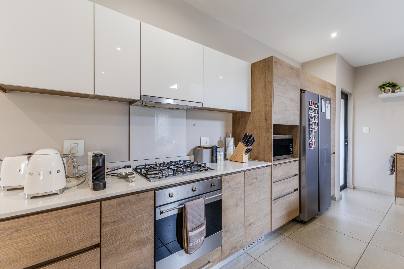 Discover modern living in this stylish 3-bedroom, 2.5-bathroom home located within the prestigious The Hills Game Reserve Estate in Pretoria. This contemporary residence boasts an inviting open-plan layout, seamlessly connecting the living, dining, and kitchen areas. The sleek kitchen features two-tone cabinetry, integrated stainless steel appliances including a gas hob and oven, a microwave, and a convenient breakfast bar, perfect for casual dining and entertaining. The property offers three well-appointed bedrooms, with the main bedroom benefiting from an en-suite bathroom, ensuring comfort and privacy. An additional full bathroom serves the remaining bedrooms, while a guest toilet on the ground floor adds to the home's practicality. High ceilings and tiled flooring throughout enhance the spacious and clean aesthetic. Step outside to a private, covered patio accessible via large sliding doors, creating an effortless indoor-outdoor flow. This area is ideal for relaxation and features a built-in braai with a prep sink, perfect for entertaining. The compact, landscaped garden provides a tranquil green space. A double garage offers secure parking and additional storage. Residents of this secure estate enjoy 24-hour security, access to a clubhouse, and the unique benefit of a nature reserve lifestyle. The home is equipped with fibre connectivity and solar panels, promoting a sustainable and connected living experience. Pets are also allowed, making it a perfect family home. Key Features: * Modern open-plan living areas * Contemporary kitchen with integrated appliances * Three bedrooms, 2.5 bathrooms (including en-suite) * Covered patio with built-in braai * Double garage * Fibre connectivity and solar panels * 24-hour security in a nature reserve estate * Access to clubhouse facilities
