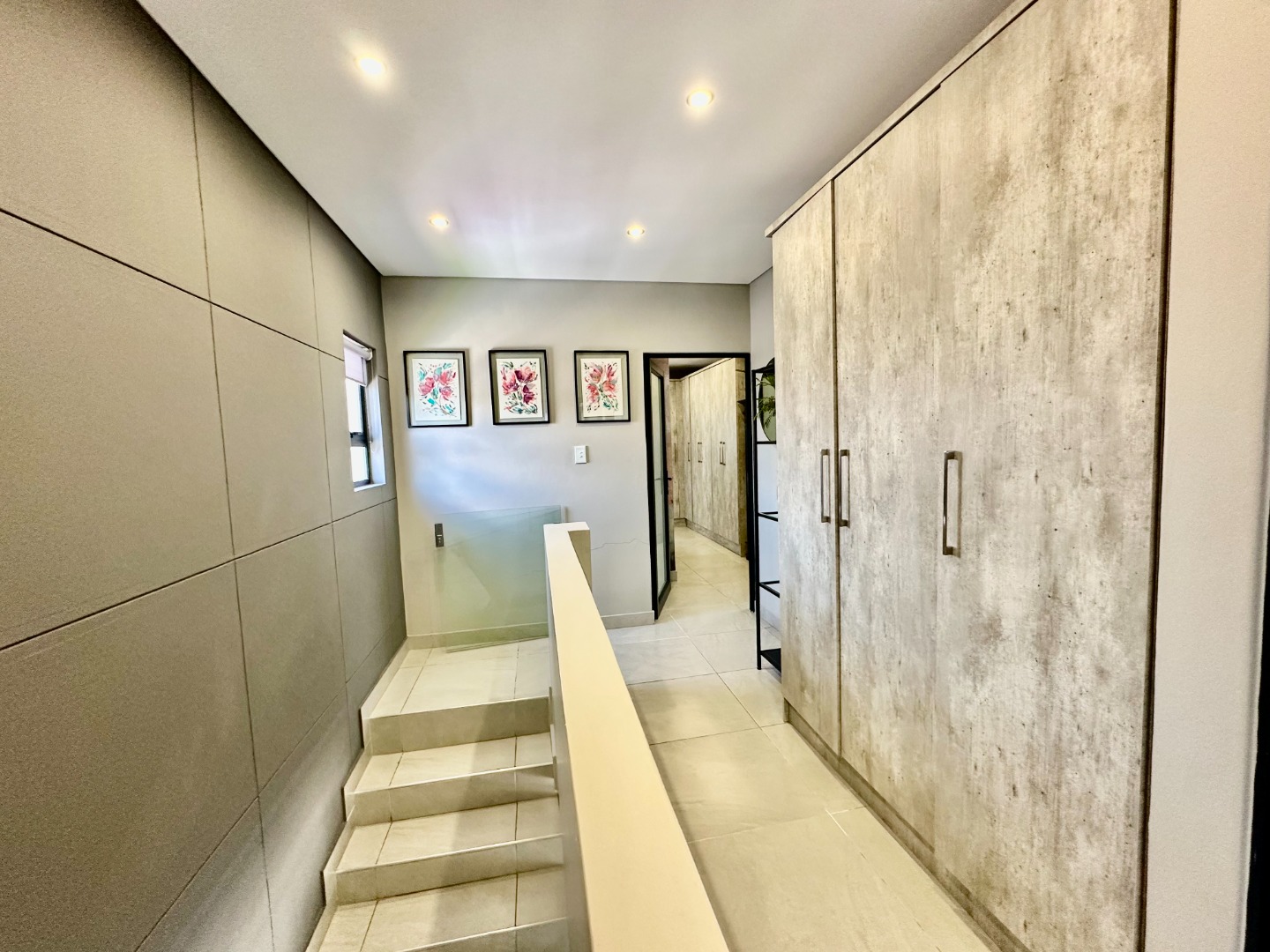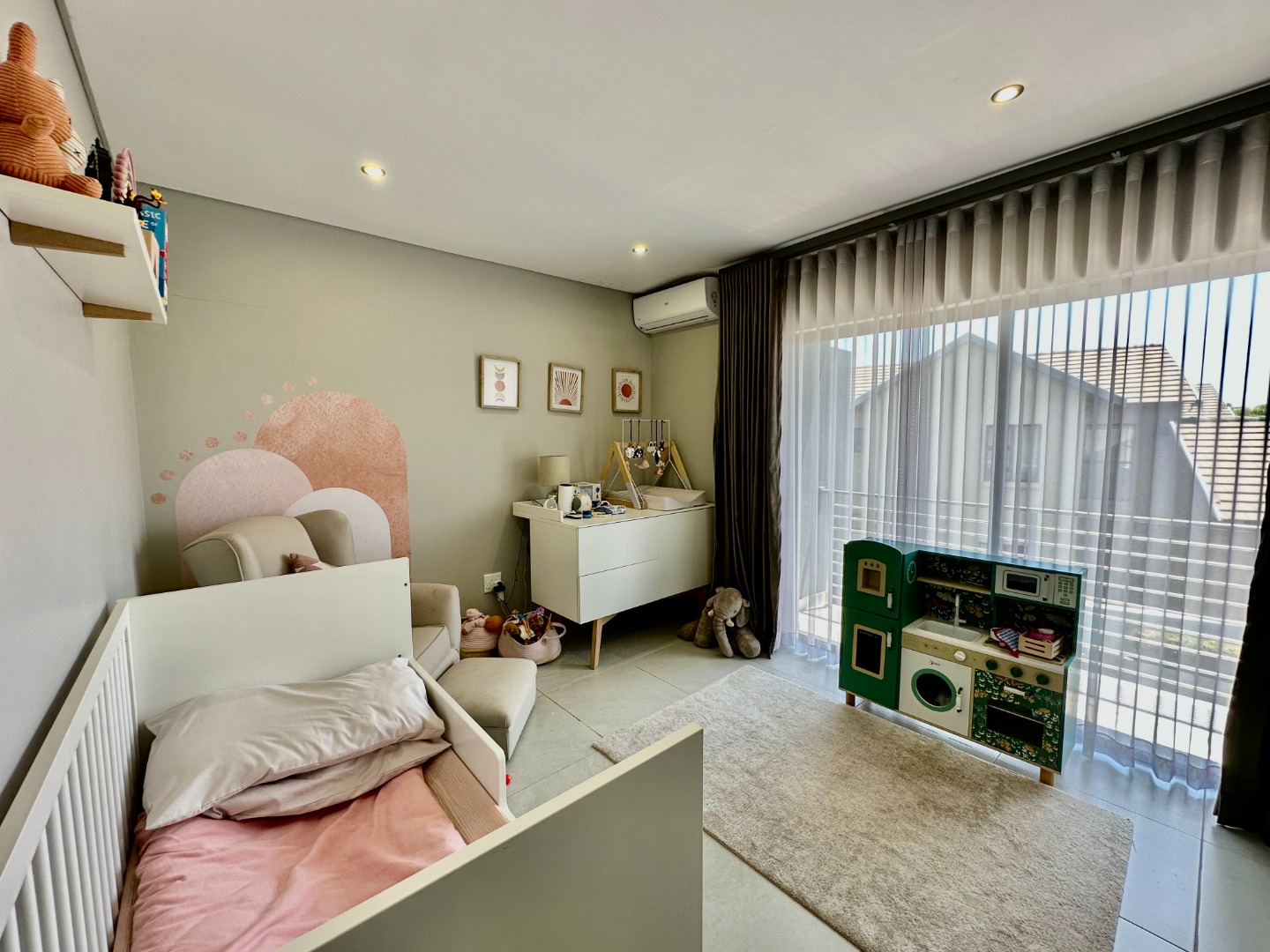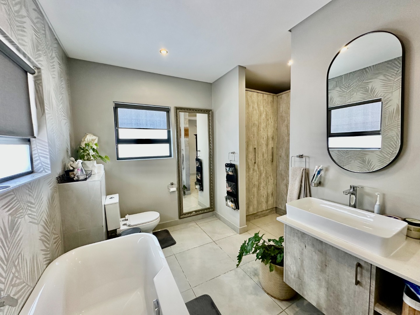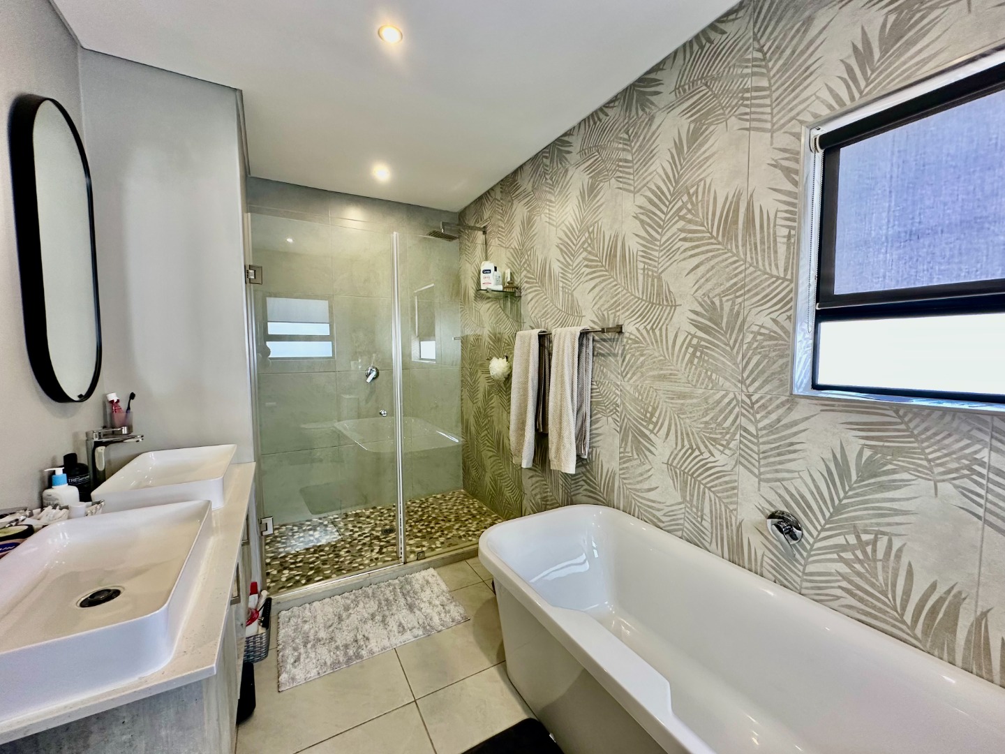 The home welcomes you with an elegant entrance hall leading into bright, open-plan living spaces. The lounge and dining area flow seamlessly into one another, with stacking doors opening to the entertainment patio. A built-in bar in the dining area makes it ideal for hosting guests or enjoying family time. A guest bedroom with an en-suite bathroom is conveniently located on the ground floor.