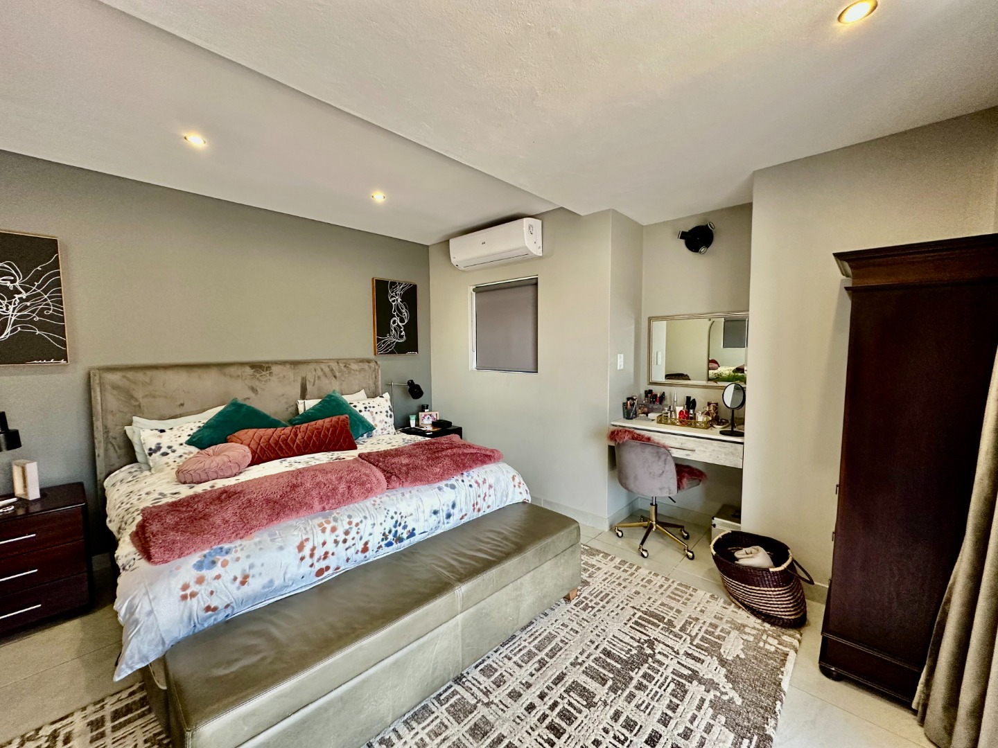 The upper level includes three generous bedrooms. The main suite offers a walk-in closet, full en-suite bathroom, and private balcony. The two additional bedrooms share a modern bathroom and also have access to a balcony. All bedrooms include air conditioning for year-round comfort.
