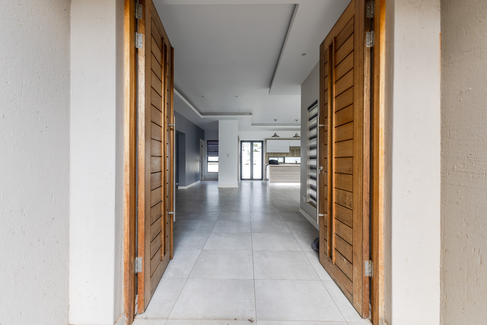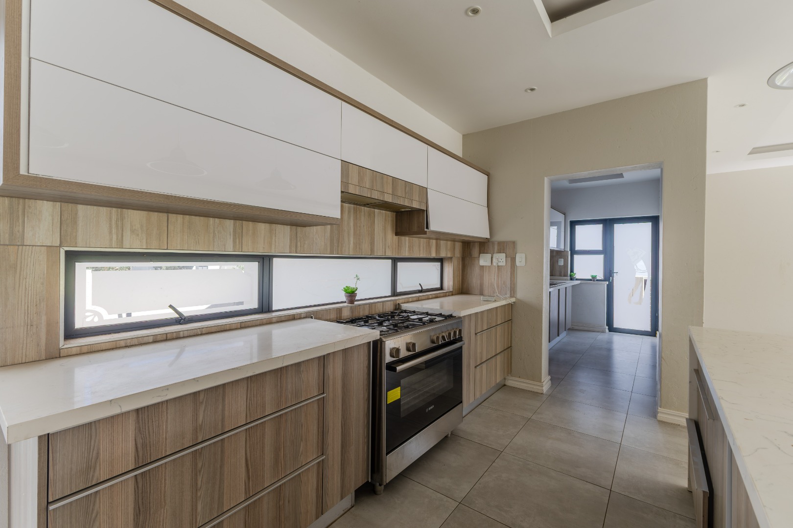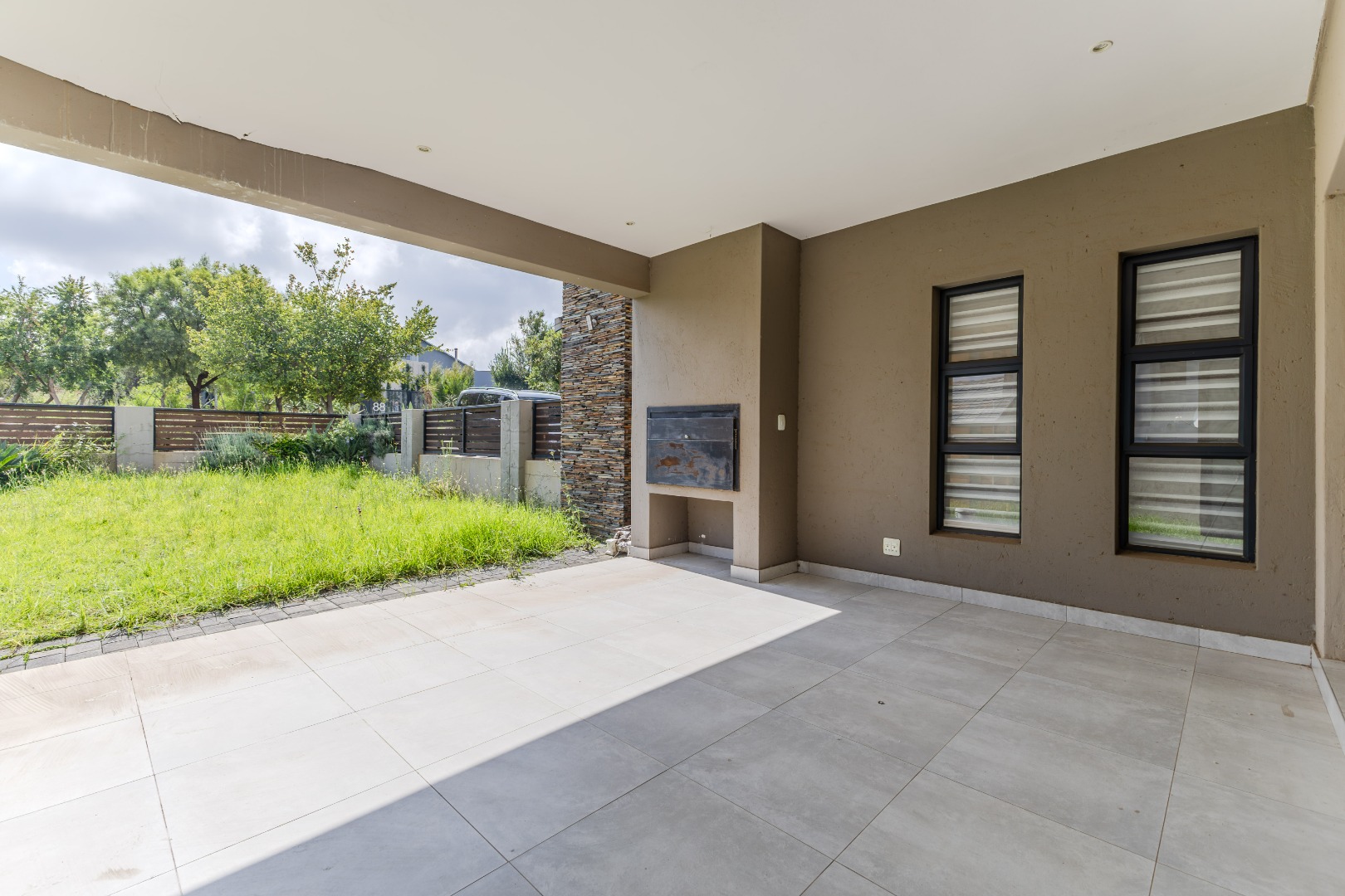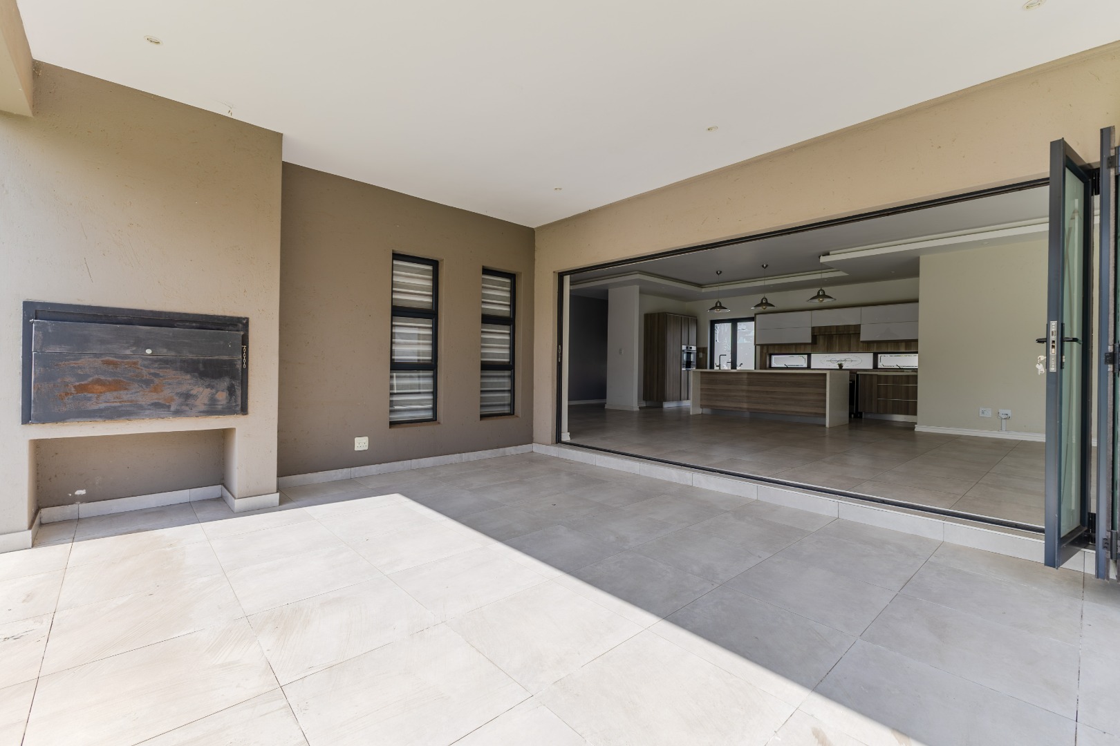 Step into a world of refined living with this beautifully designed 4-bedroom, 4-bathroom residence — a home where timeless elegance and modern convenience blend seamlessly. From the moment you arrive, the welcoming charm of wooden French-style double doors sets the tone for what lies beyond. The heart of the home reveals an expansive open-plan design where the TV lounge, dining area, and kitchen flow effortlessly together, creating an inviting space ideal for both relaxed family living and sophisticated entertaining. The kitchen, styled with natural wood finishes and a striking white island, is a true culinary centerpiece equipped with a gas hob and eye-level oven, perfectly suited for the aspiring home chef. Large stack doors lead to a covered patio with a built-in braai, offering a seamless indoor-outdoor lifestyle complemented by a manicured garden — an entertainer’s dream in any season.