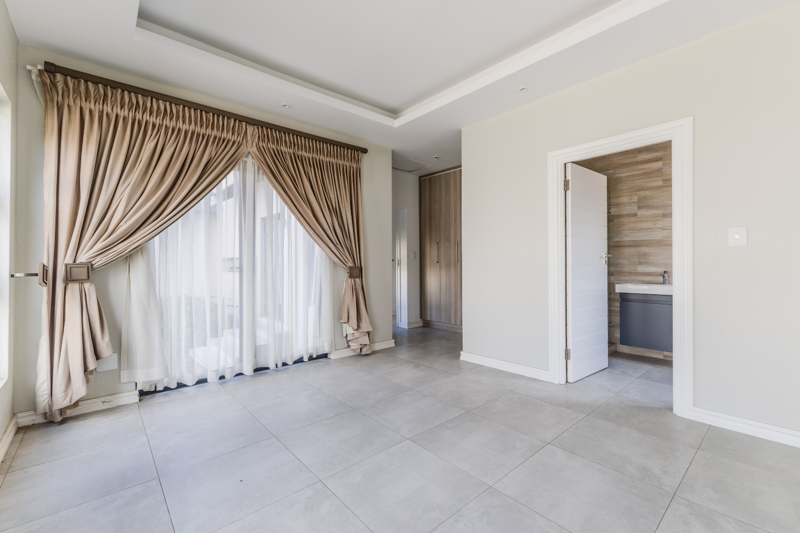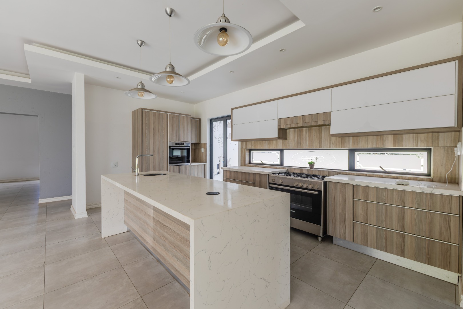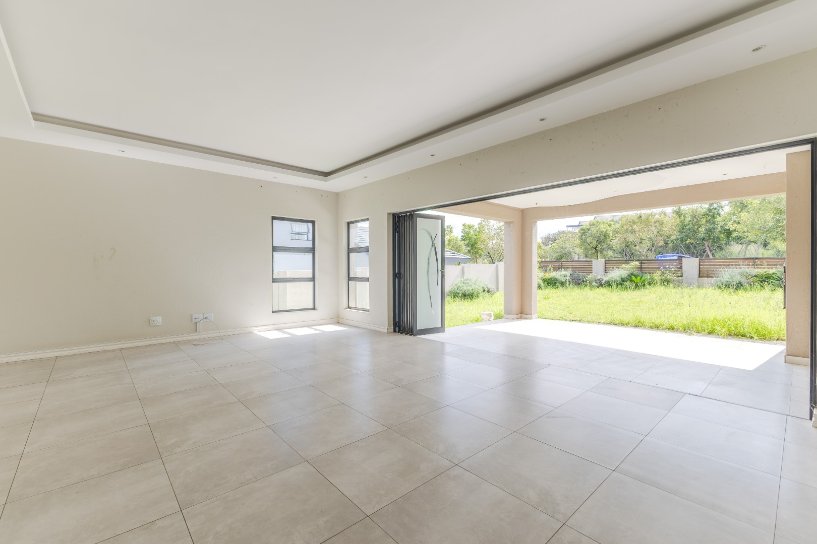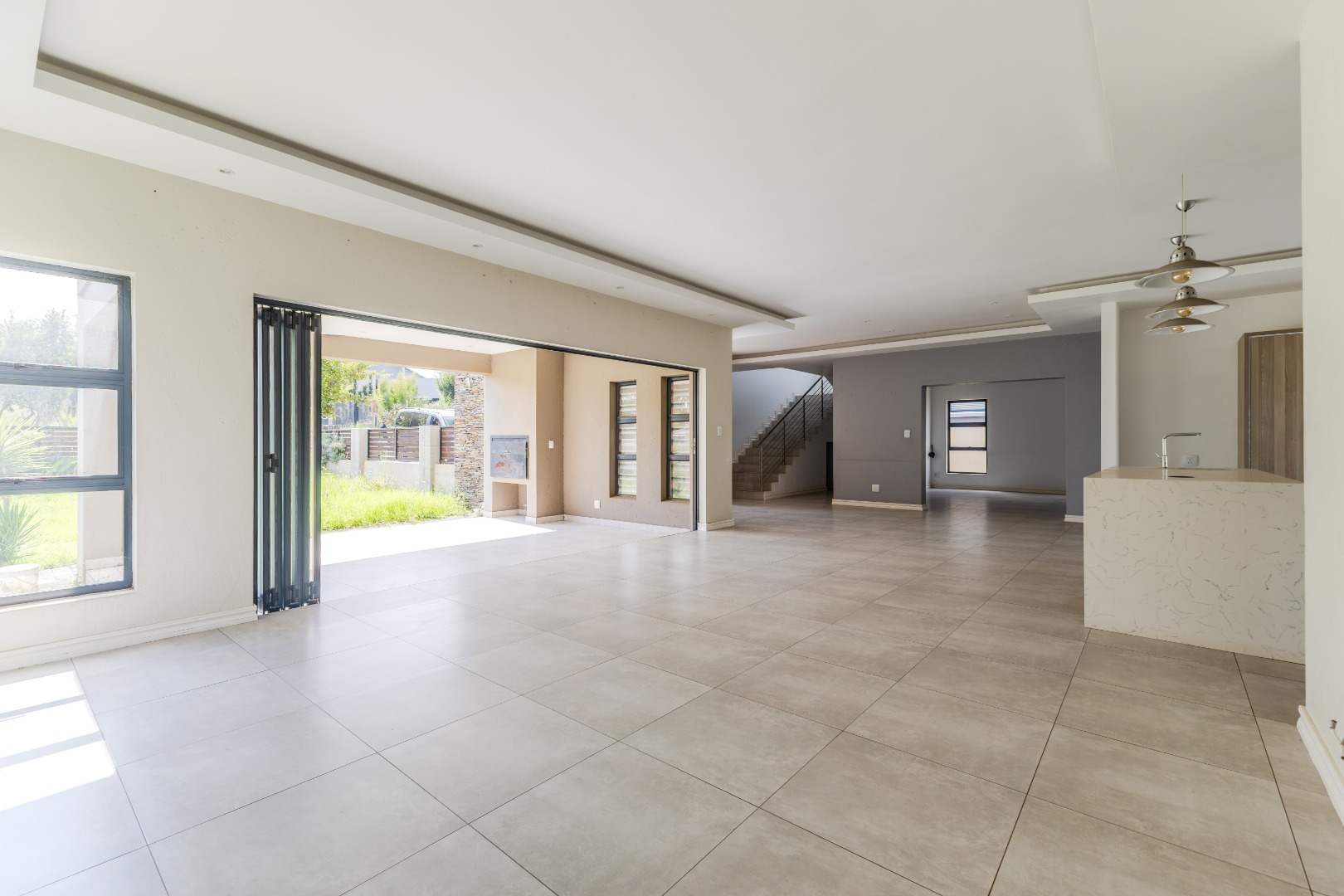Step into a world of refined living with this beautifully designed 4-bedroom, 4-bathroom residence — a home where timeless elegance and modern convenience blend seamlessly. From the moment you arrive, the welcoming charm of wooden French-style double doors sets the tone for what lies beyond. The heart of the home reveals an expansive open-plan design where the TV lounge, dining area, and kitchen flow effortlessly together, creating an inviting space ideal for both relaxed family living and sophisticated entertaining. The kitchen, styled with natural wood finishes and a striking white island, is a true culinary centerpiece equipped with a gas hob and eye-level oven, perfectly suited for the aspiring home chef. Large stack doors lead to a covered patio with a built-in braai, offering a seamless indoor-outdoor lifestyle complemented by a manicured garden — an entertainer’s dream in any season.