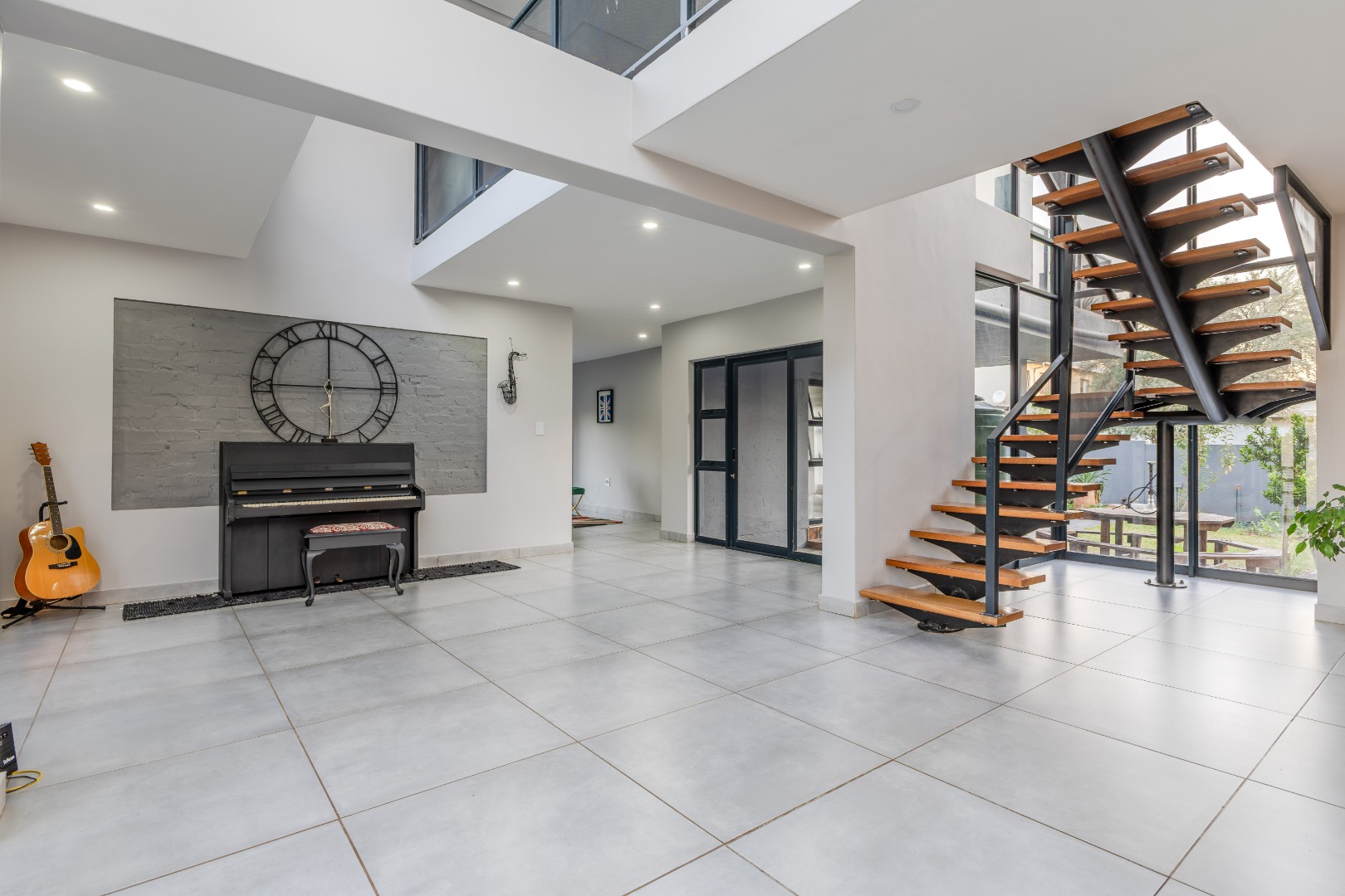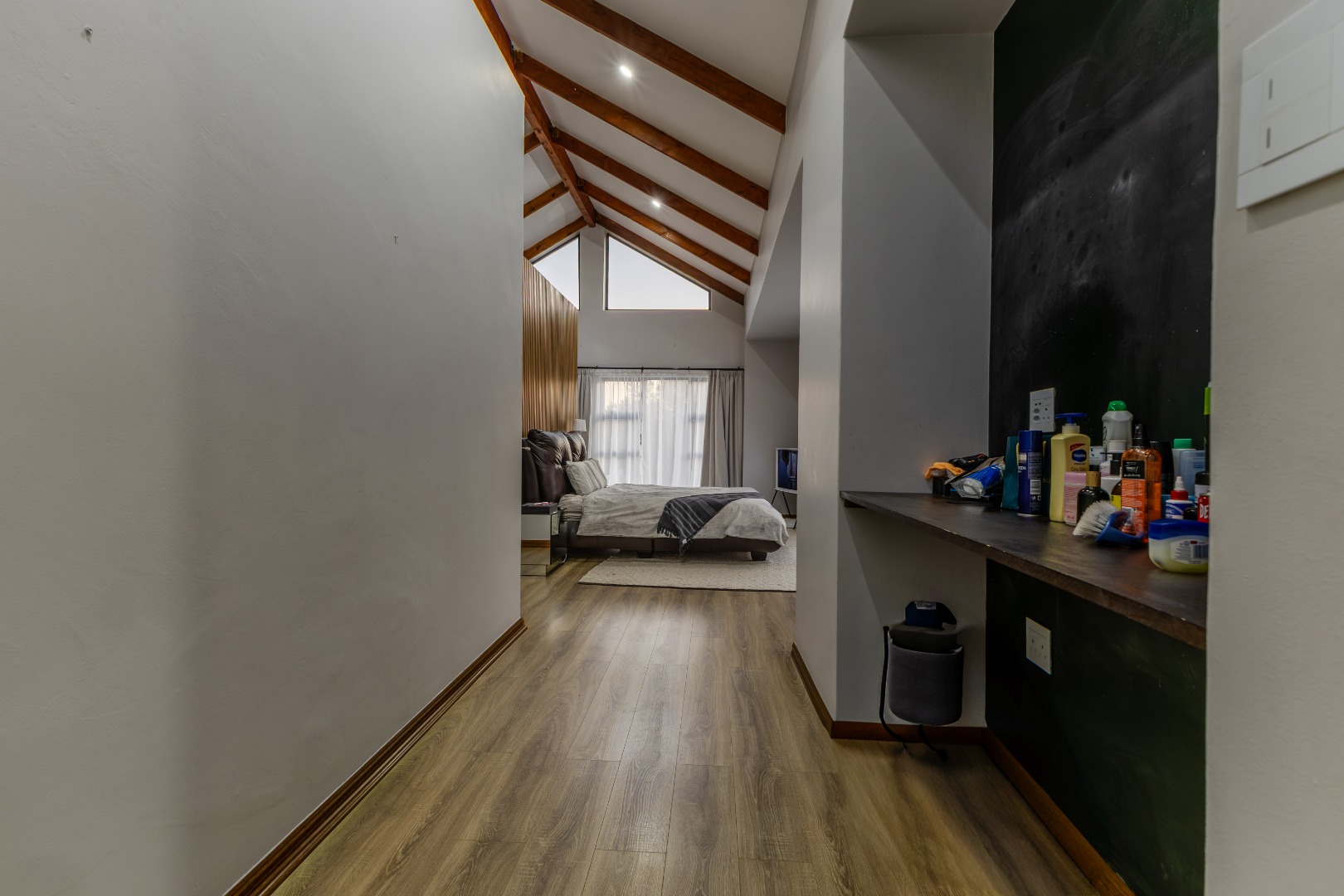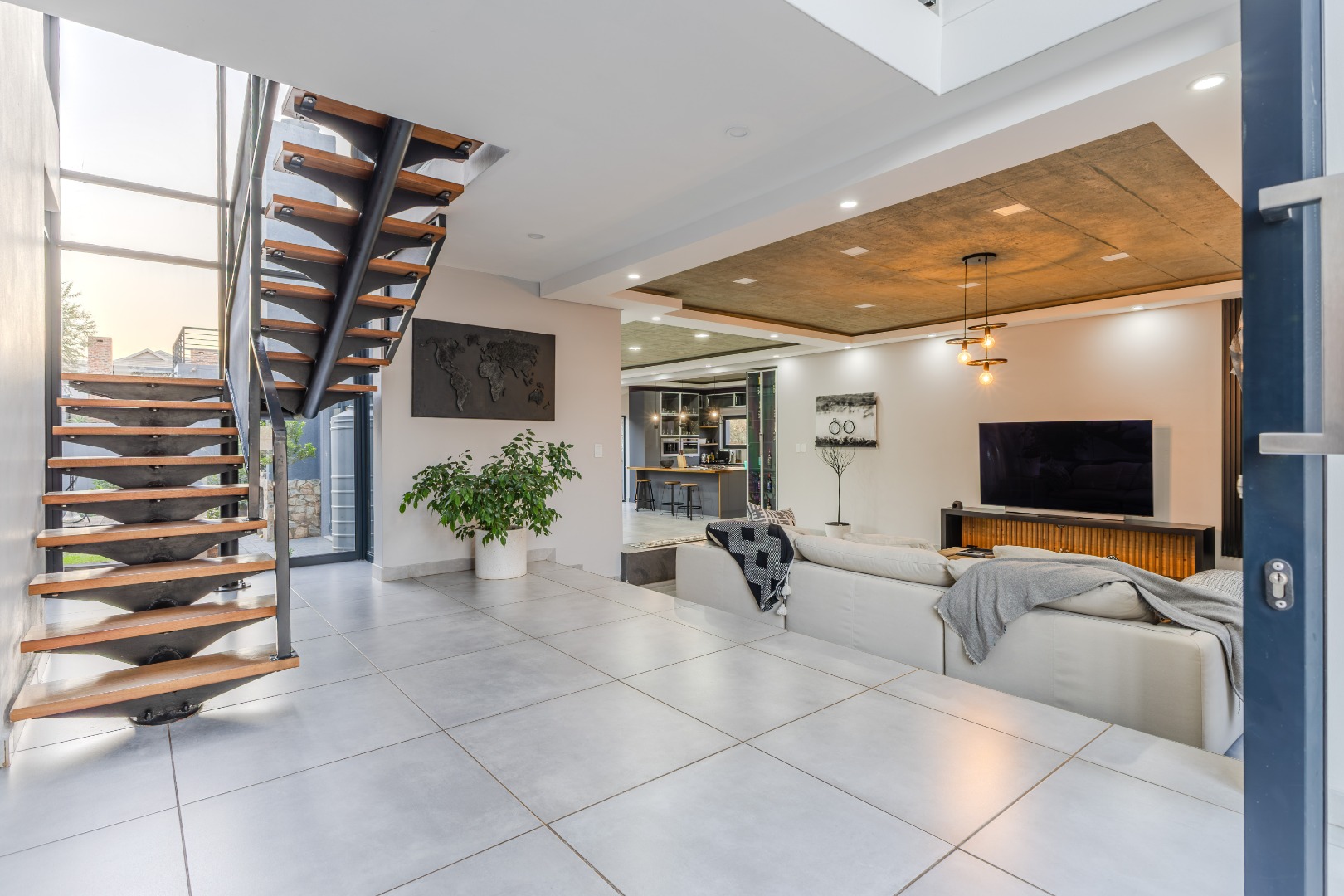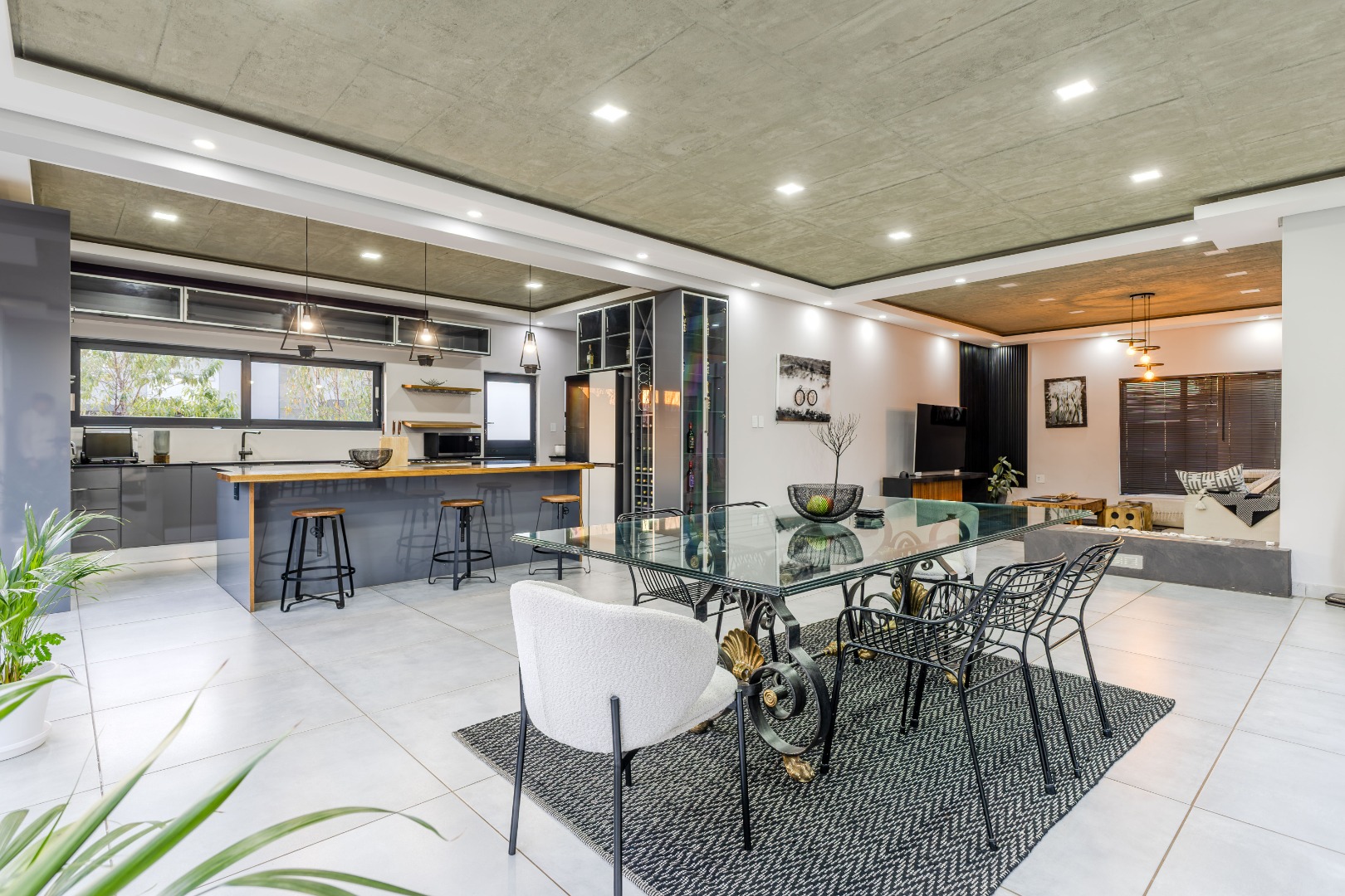 On the right, the expansive open-plan living area is thoughtfully laid out for both family living and social gatherings. The living and dining areas flow effortlessly into the modern kitchen, featuring ample counter space, generous storage, and a separate scullery to maintain a clean and organized space. Large stack doors open out to a covered braai area, ideal for outdoor dining and year-round entertaining. Additional features include double automated garages with direct access to the home, as well as energy-efficient living supported by two solar geysers. Upstairs, the luxurious main suite offers a spacious en-suite bathroom and walk-in wardrobe, creating a serene private retreat. Four additional bedrooms and two well-appointed bathrooms complete the upper level, providing ample accommodation for a growing family or guests. This home offers the perfect blend of style, space, and sustainability—crafted for modern family living in every sense. Contact me today to arrange your exclusive viewing of this remarkable home.