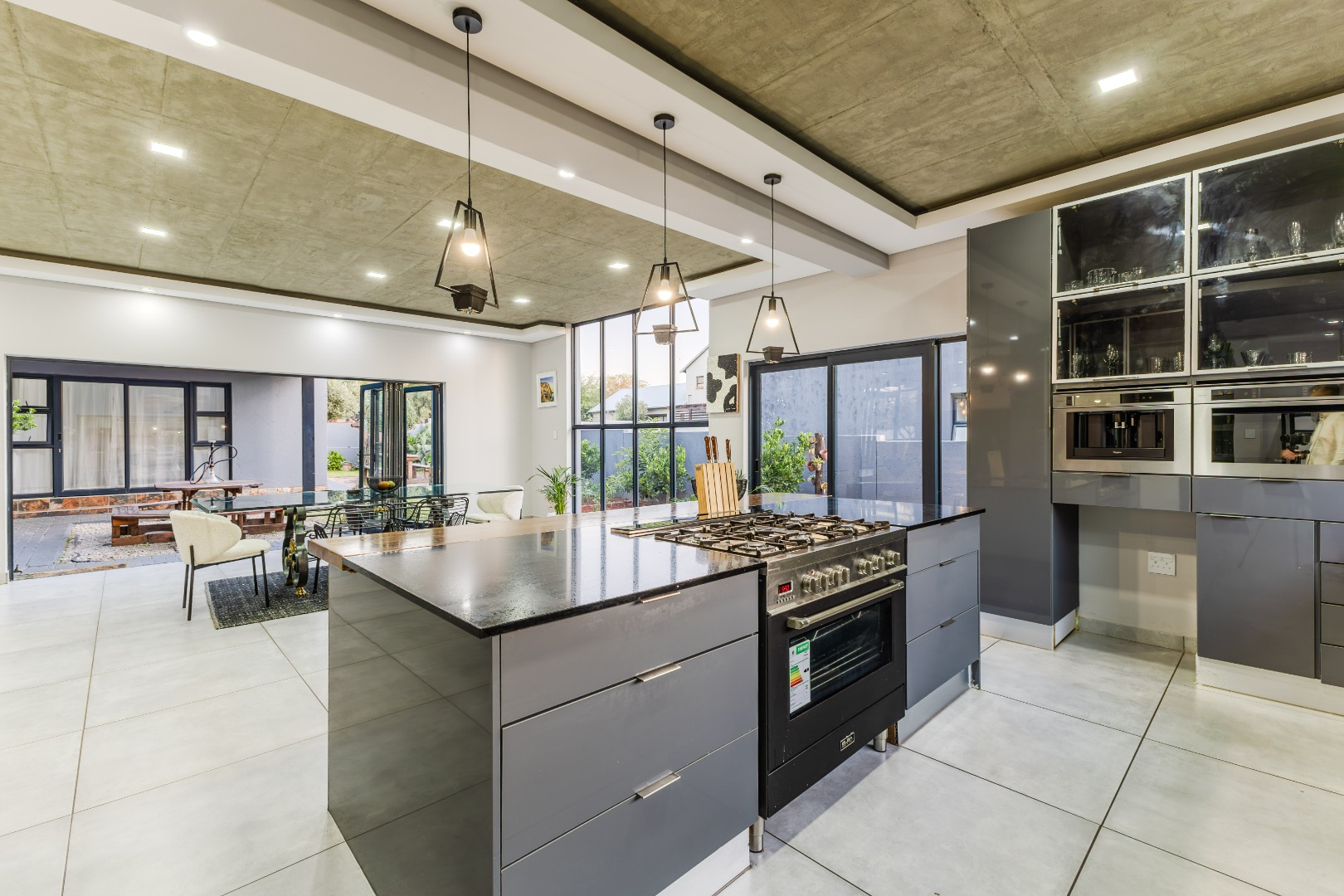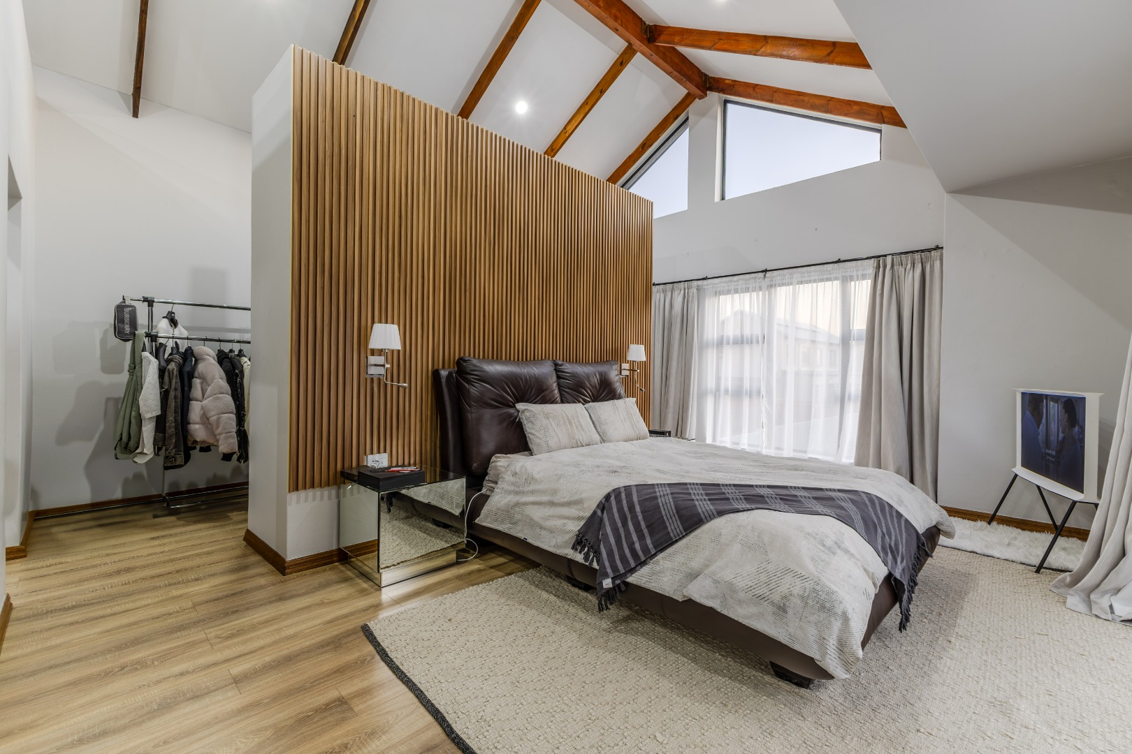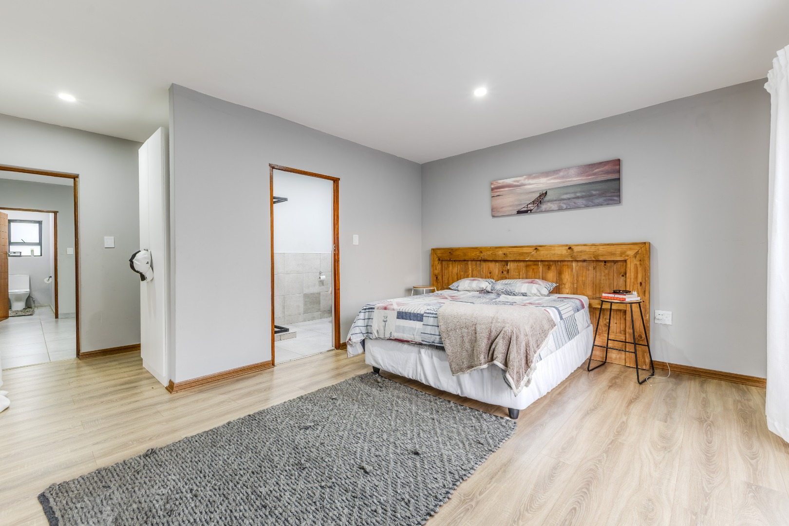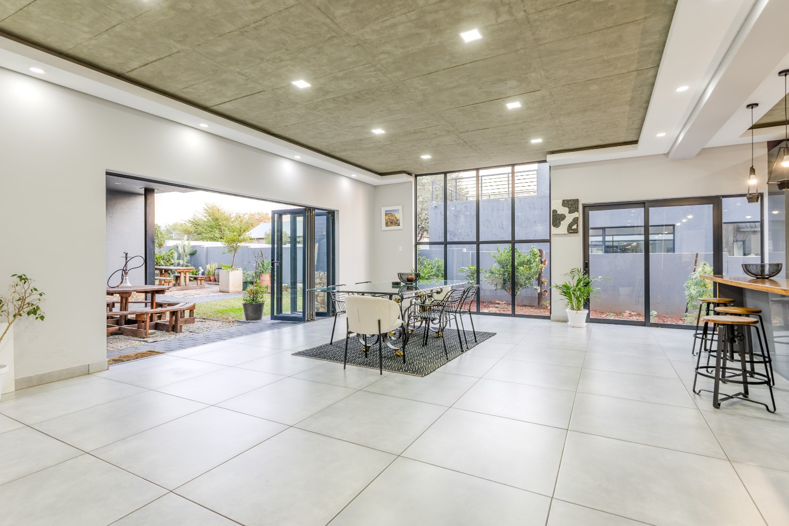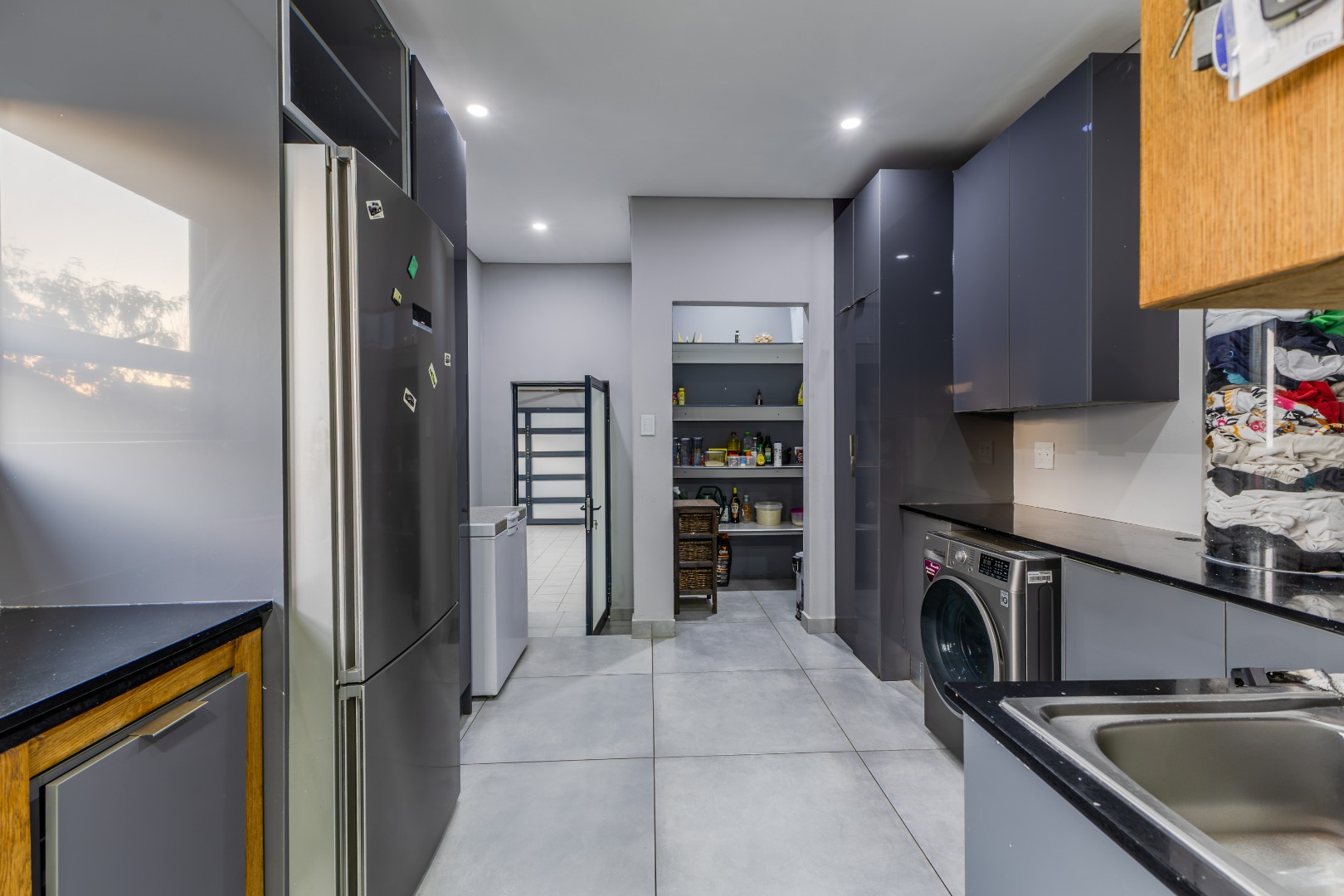 On the right, the expansive open-plan living area is thoughtfully laid out for both family living and social gatherings. The living and dining areas flow effortlessly into the modern kitchen, featuring ample counter space, generous storage, and a separate scullery to maintain a clean and organized space. Large stack doors open out to a covered braai area, ideal for outdoor dining and year-round entertaining. Additional features include double automated garages with direct access to the home, as well as energy-efficient living supported by two solar geysers. Upstairs, the luxurious main suite offers a spacious en-suite bathroom and walk-in wardrobe, creating a serene private retreat. Four additional bedrooms and two well-appointed bathrooms complete the upper level, providing ample accommodation for a growing family or guests. This home offers the perfect blend of style, space, and sustainability—crafted for modern family living in every sense. Contact me today to arrange your exclusive viewing of this remarkable home.