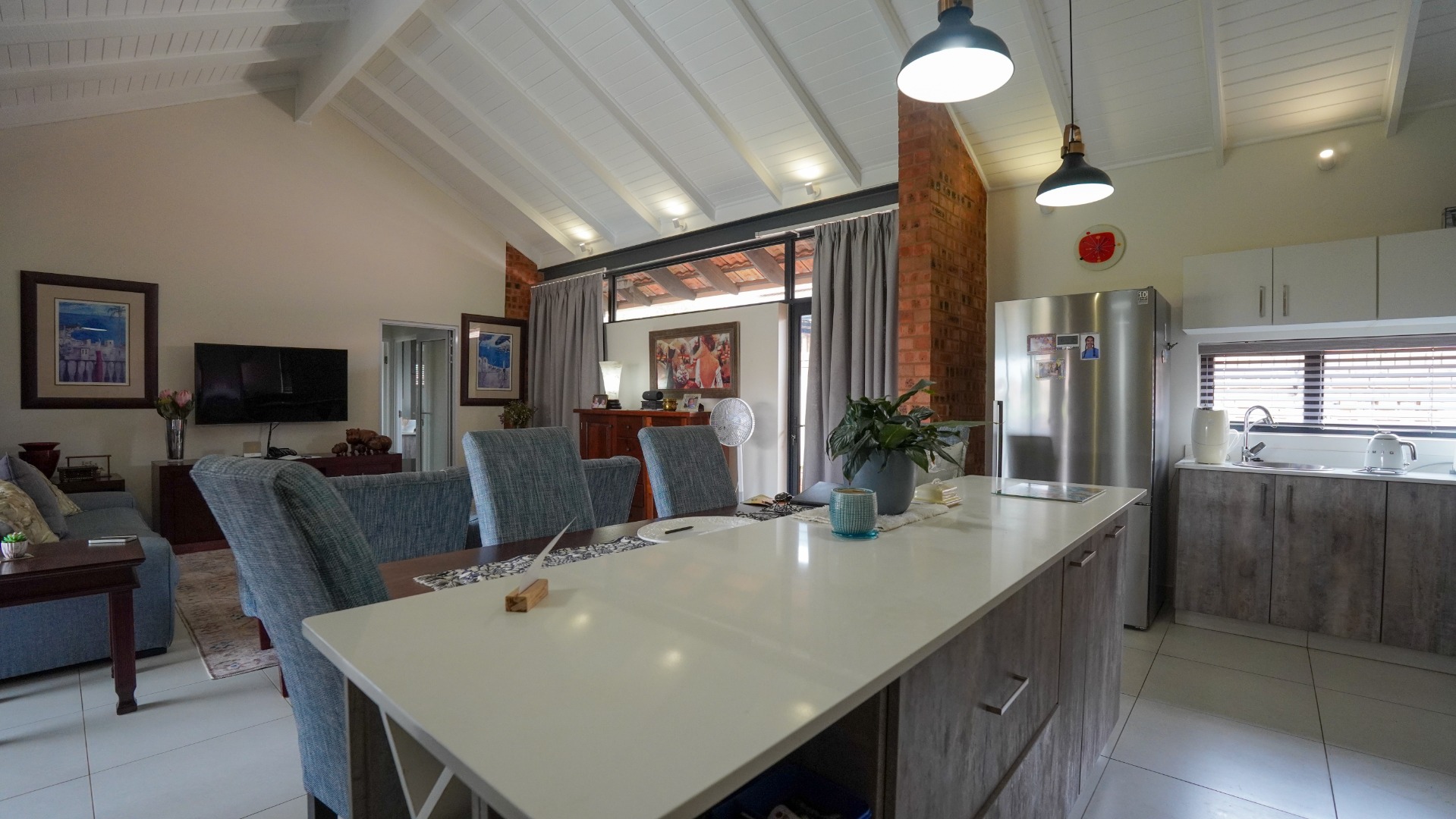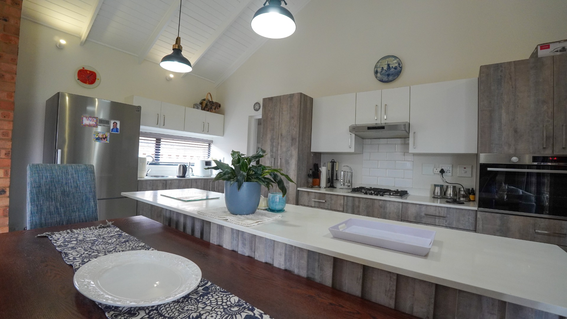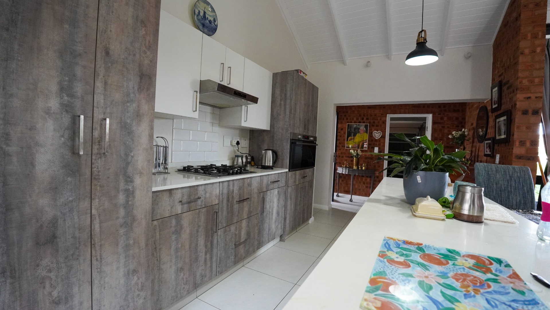The lounge and dining area create a warm, welcoming atmosphere, enhanced by high ceilings with a modern wooden beam finish that adds both character and a sense of openness. This inviting space flows seamlessly into the kitchen fitted with a gas stove and ample cupboard space, while a separate scullery and laundry area provide added practicality and convenience.