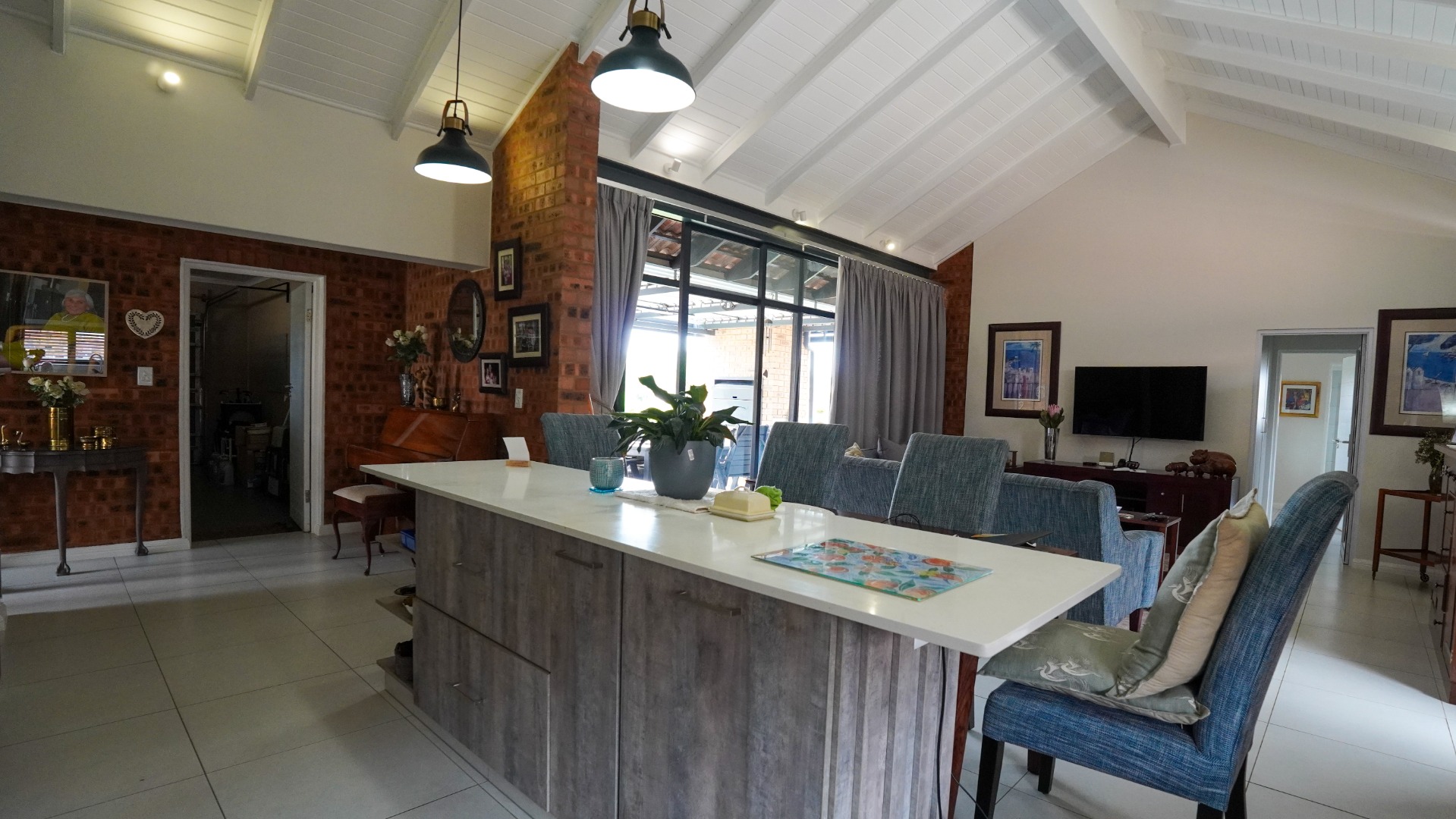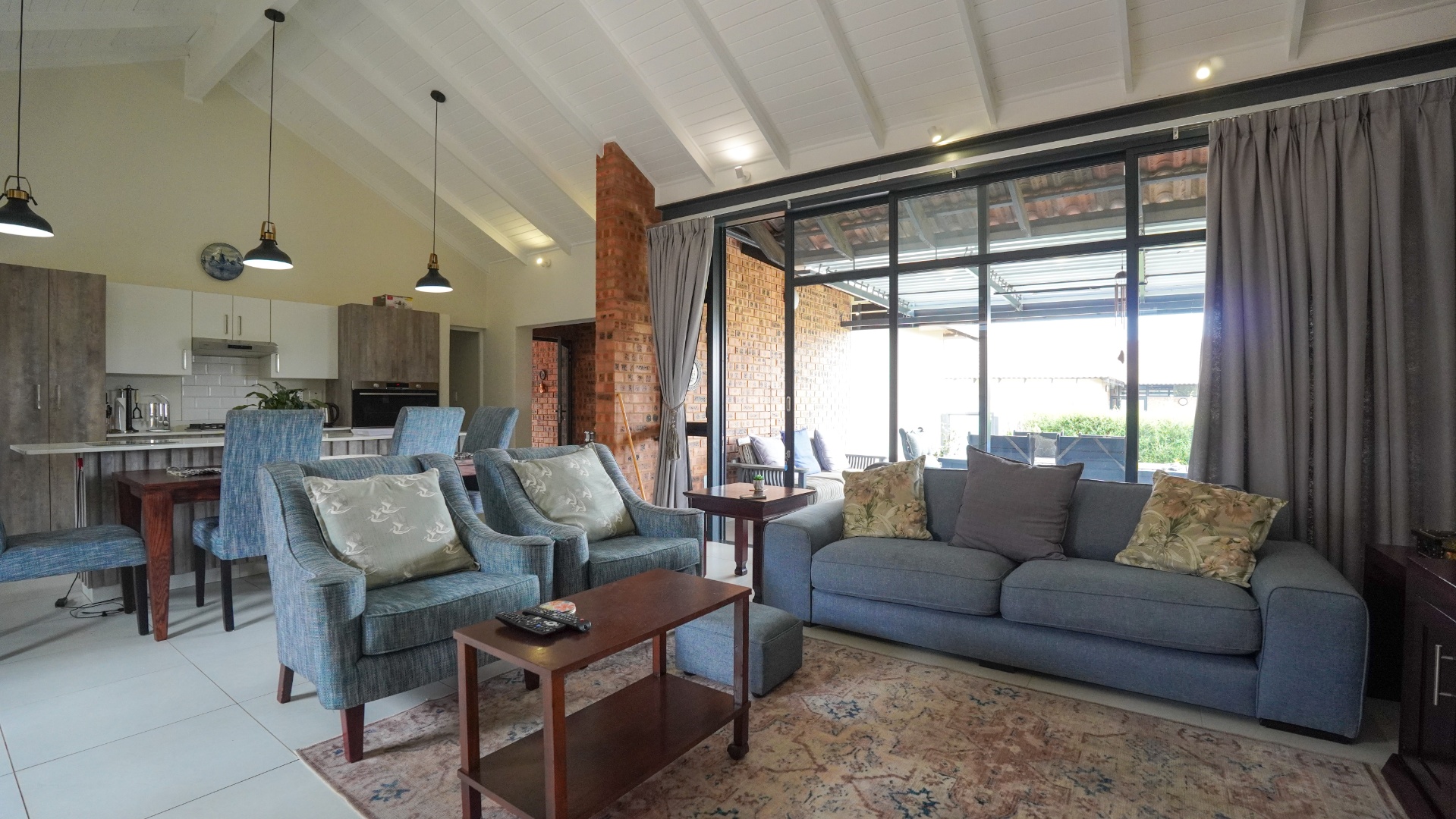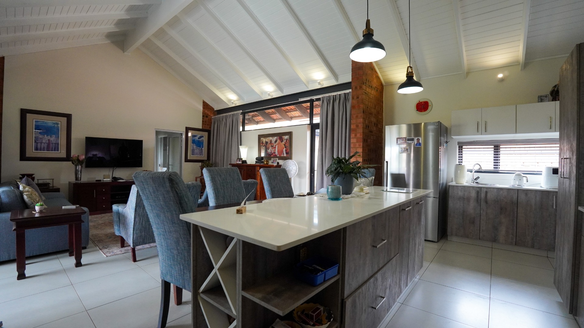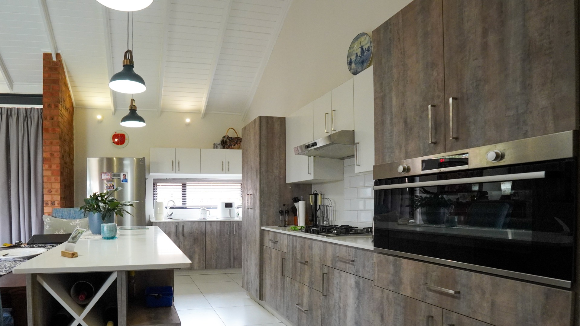 The lounge and dining area create a warm, welcoming atmosphere, enhanced by high ceilings with a modern wooden beam finish that adds both character and a sense of openness. This inviting space flows seamlessly into the kitchen fitted with a gas stove and ample cupboard space, while a separate scullery and laundry area provide added practicality and convenience.