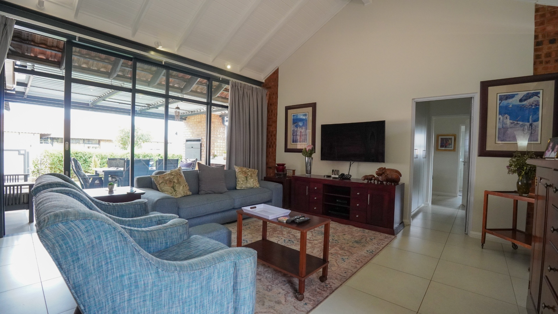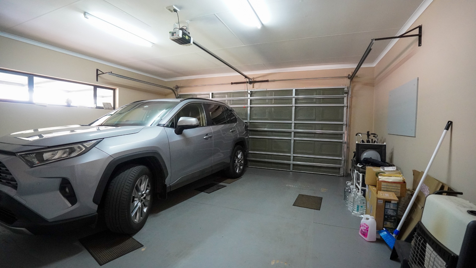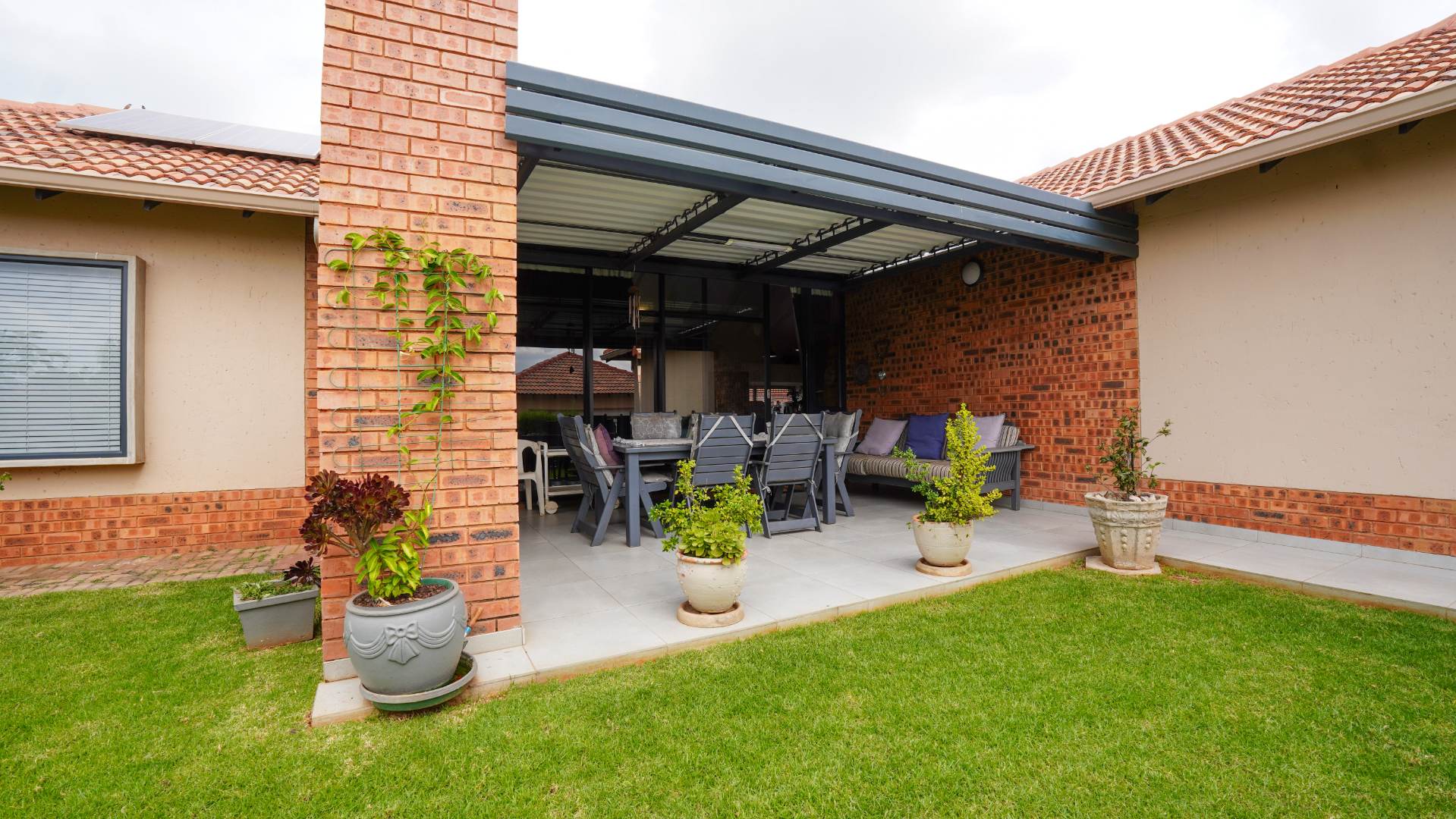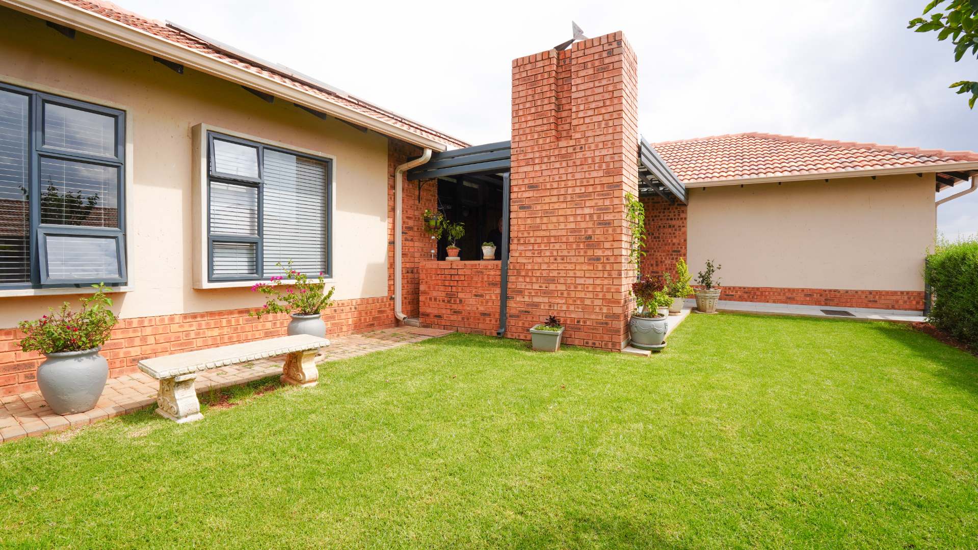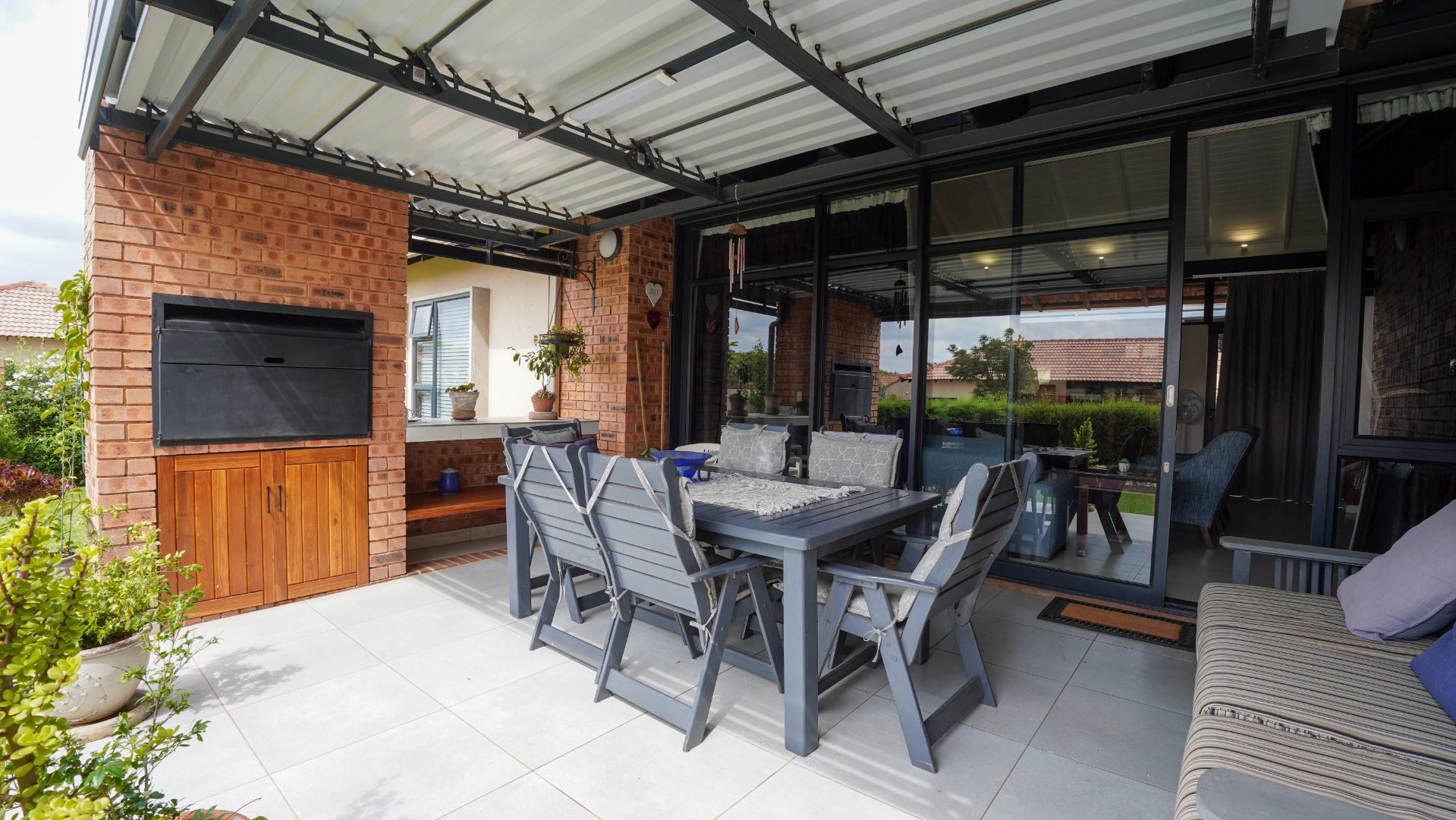 The property also boasts a double garage with an additional covered carport, ensuring ample parking space. Outdoor living is a highlight, with a covered patio and built-in braai overlooking a well-maintained garden.
