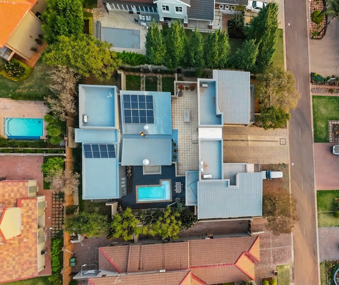 Sustainability meets sophistication with a complete solar system including 2x 5kW inverters, 2x 5kWh batteries, and 12 solar panels, complemented by a 4,440-liter water storage system for added self-sufficiency. Practical amenities include two double automated garages and an exterior toilet.