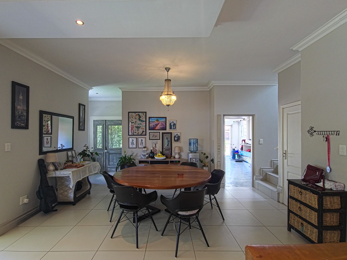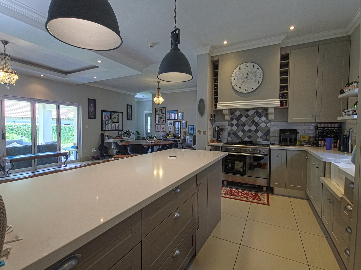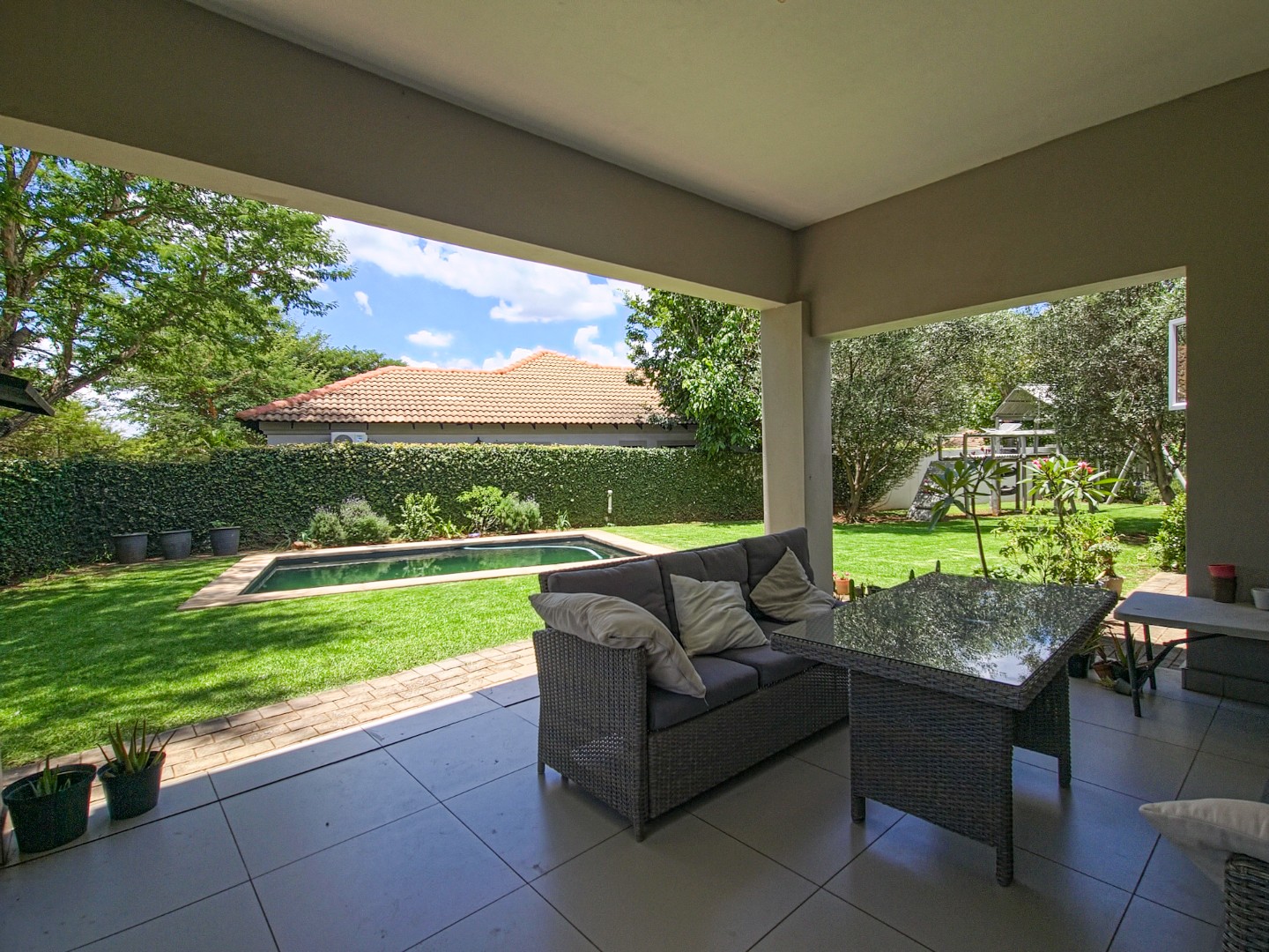Downstairs, a welcoming entrance hall leads into the open-plan living and dining areas, complemented by a convenient guest toilet. The modern kitchen features granite countertops and a separate scullery. The lounge opens beautifully with stack doors onto a covered patio with a built-in braai, overlooking a spacious garden, sparkling swimming pool, and jungle gym, perfect for family living and entertaining. Additional features include staff quarters and a double automated garage with direct access into the home, all set within a secure and well-maintained estate.