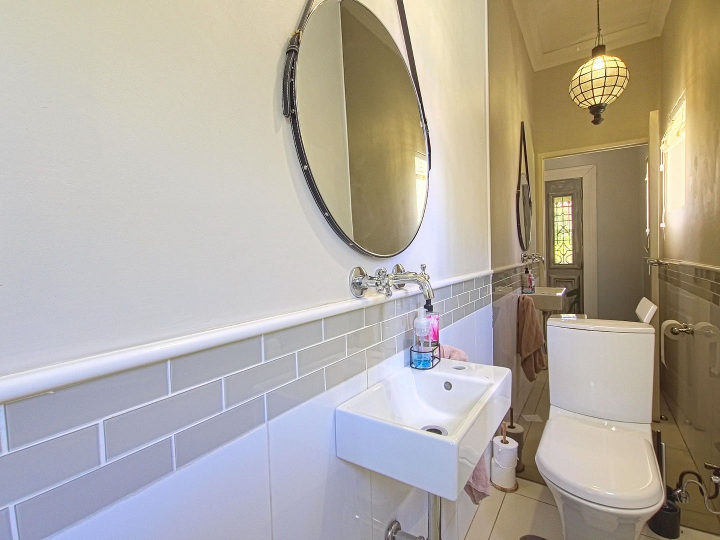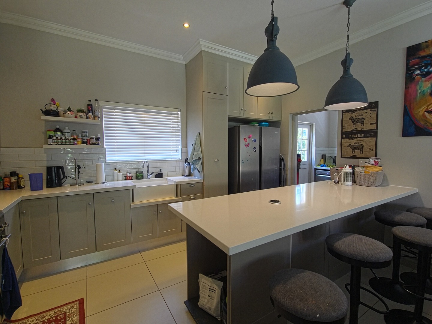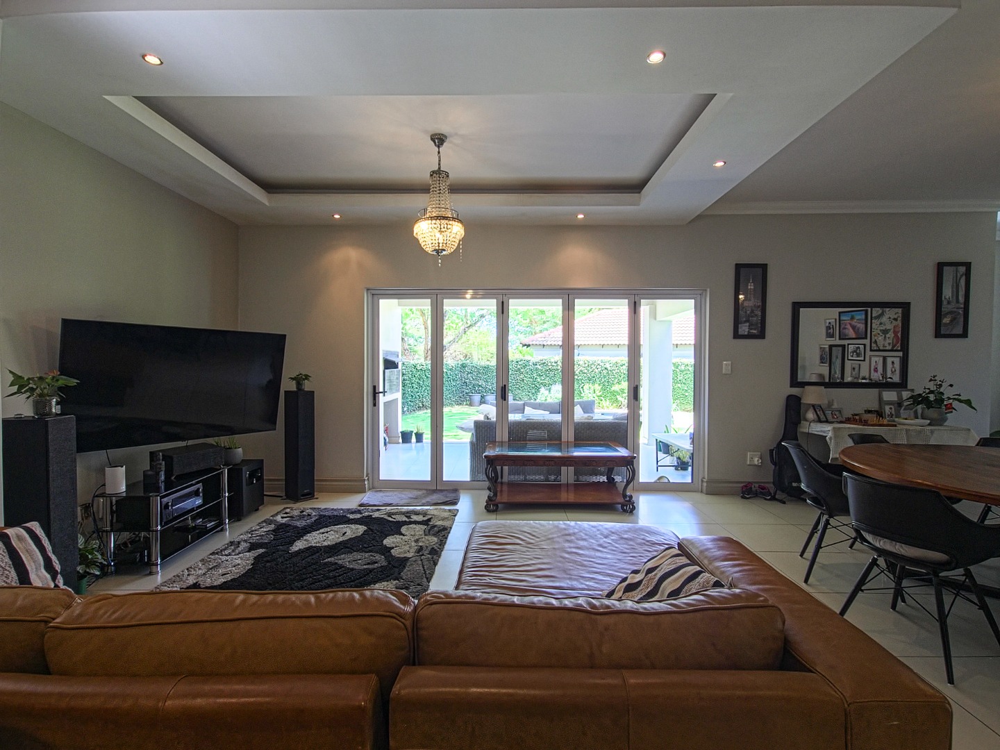 Downstairs, a welcoming entrance hall leads into the open-plan living and dining areas, complemented by a convenient guest toilet. The modern kitchen features granite countertops and a separate scullery. The lounge opens beautifully with stack doors onto a covered patio with a built-in braai, overlooking a spacious garden, sparkling swimming pool, and jungle gym, perfect for family living and entertaining. Additional features include staff quarters and a double automated garage with direct access into the home, all set within a secure and well-maintained estate.