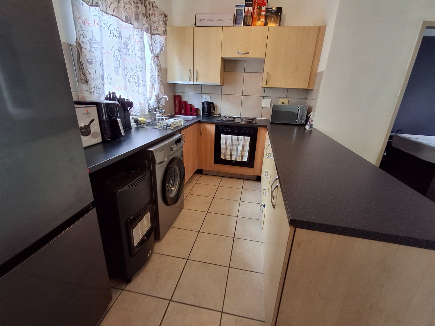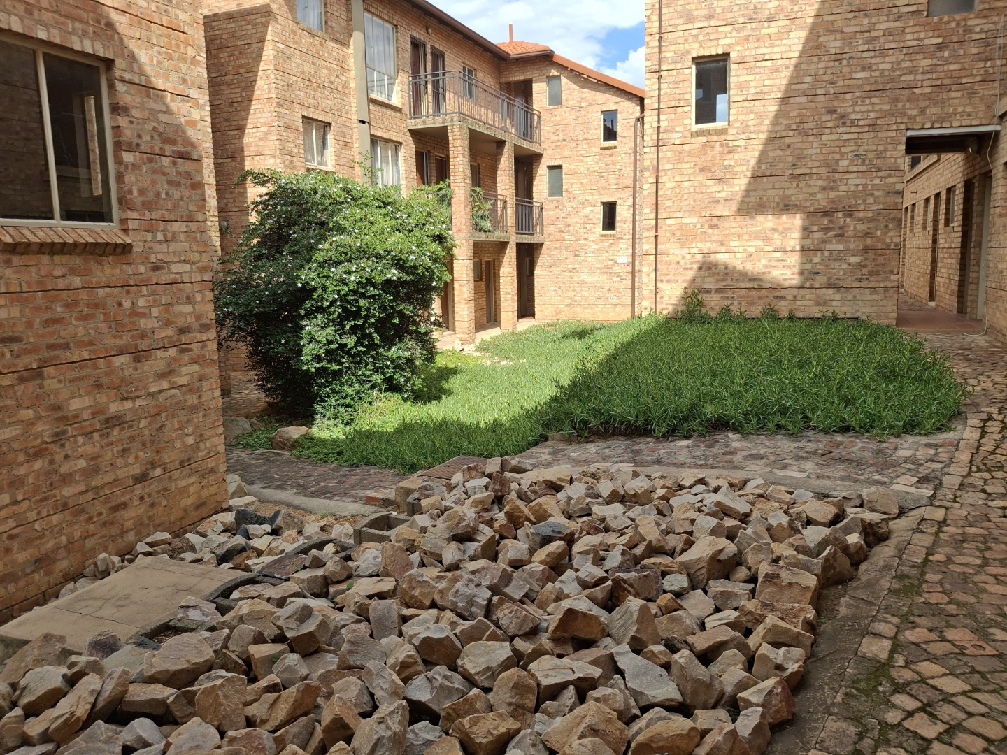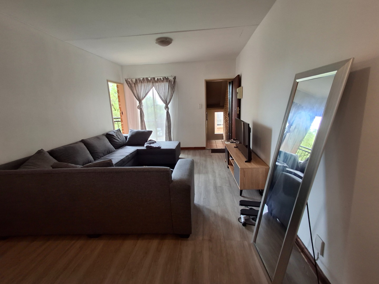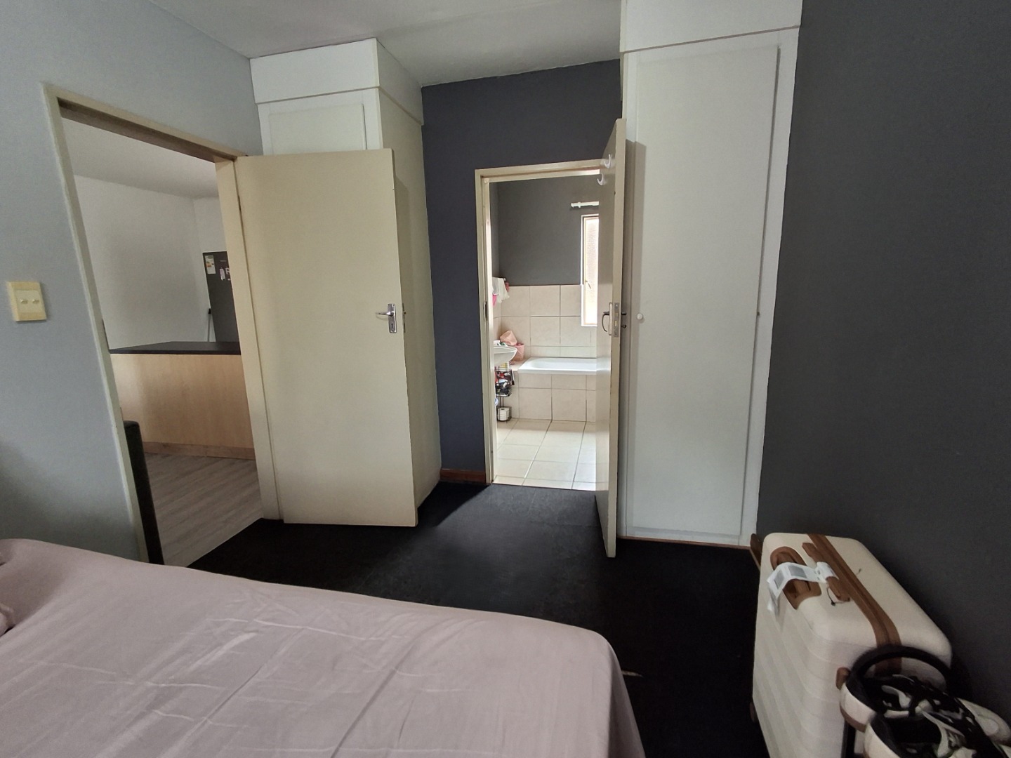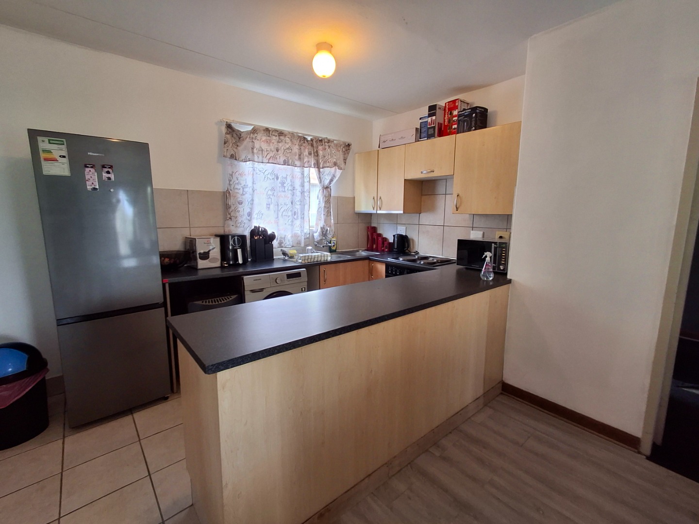 This inviting 71 sqm apartment offers a comfortable and secure living experience in Pretoria's desirable Wapadrand suburb. The open-plan layout features a lounge with modern laminate flooring, flowing into a compact kitchen equipped with light wood cabinetry, dark countertops, and a convenient breakfast bar. The unit comprises one well-proportioned bedroom with built-in cupboard and a single bathroom with bath. Enjoy private outdoor space on the balcony, overlooking communal areas. A dedicated garage provides secure parking. Situated within a security complex, residents benefit from 24-hour security, electric fencing, and access gates, ensuring peace of mind.