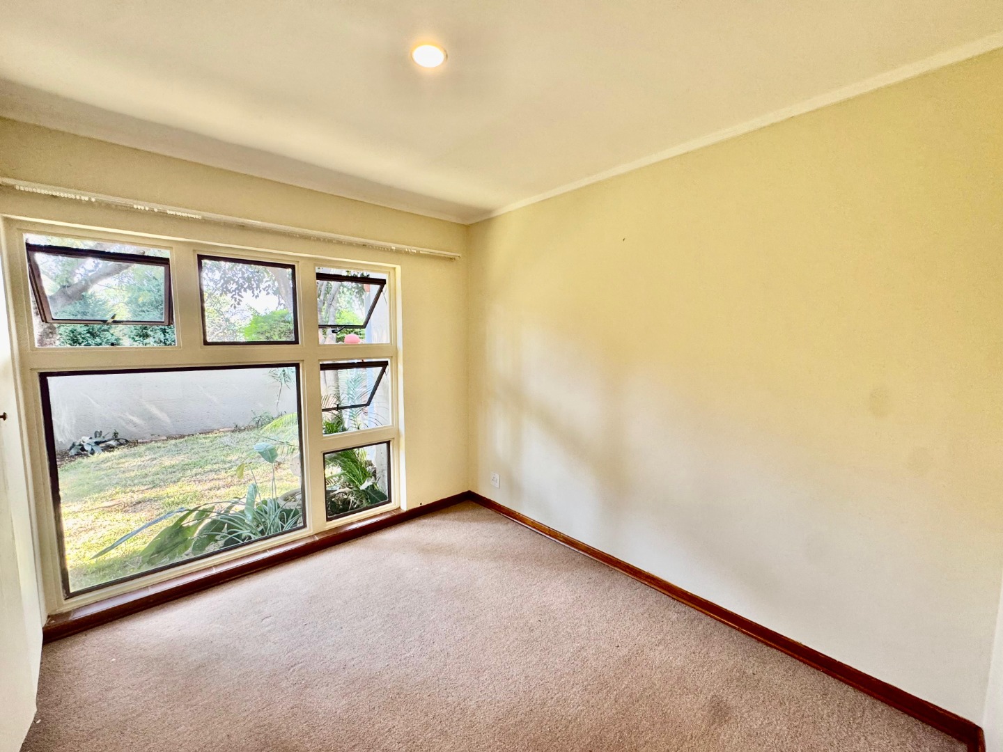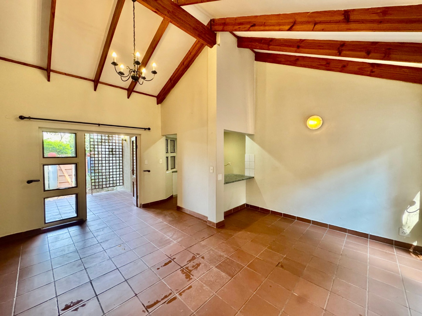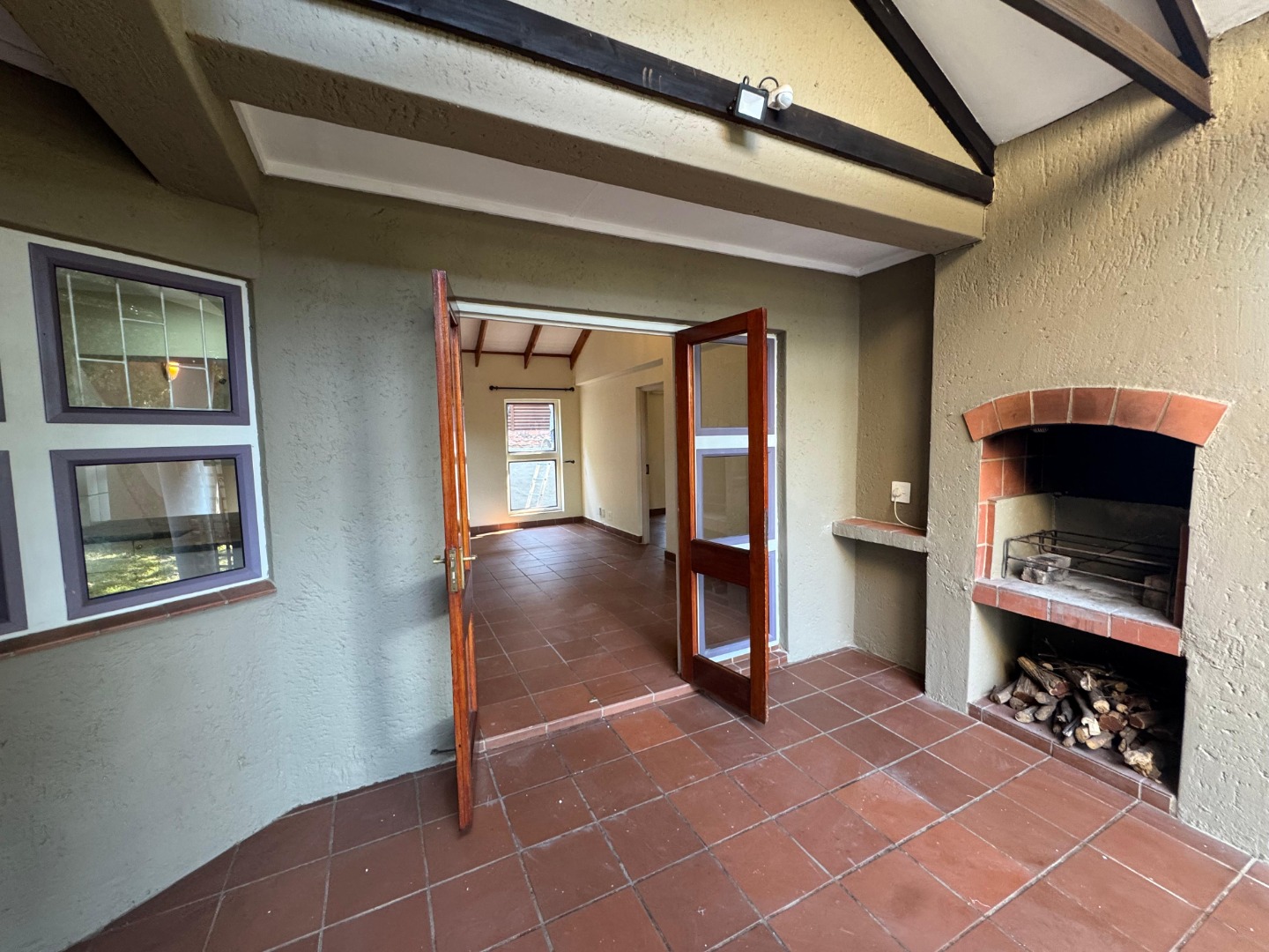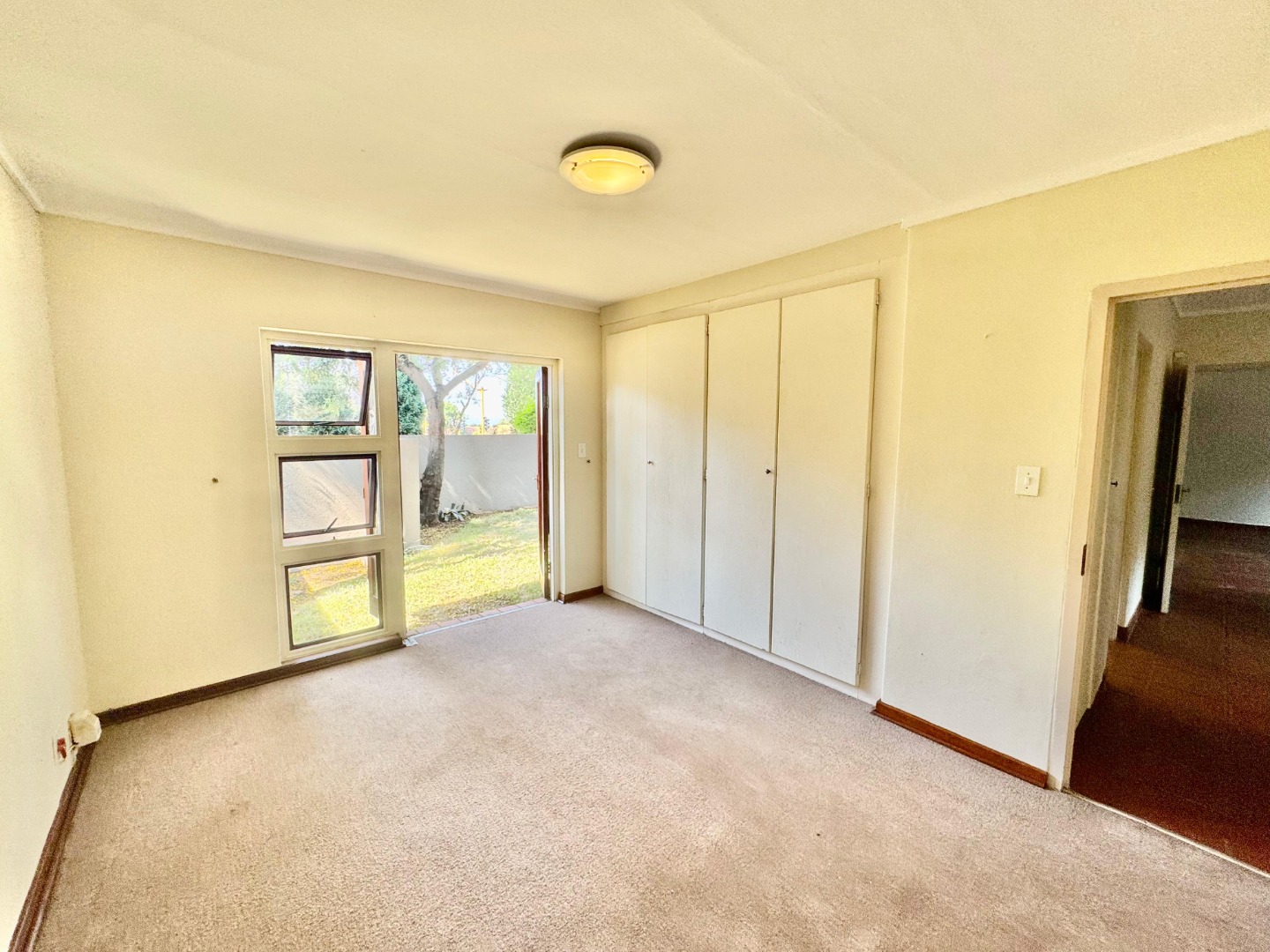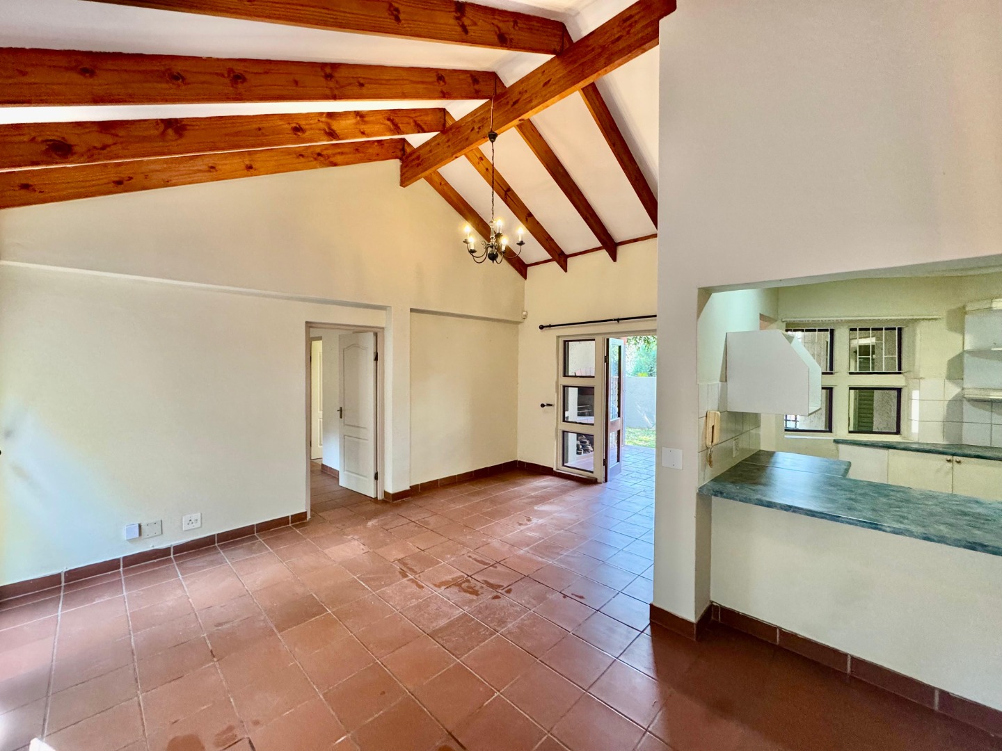 A glass door leads out to the patio and large, private walled garden with a built-in braai area—ideal for entertainment.