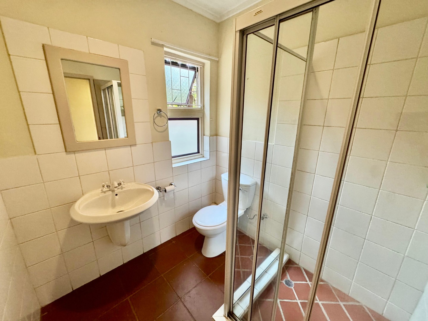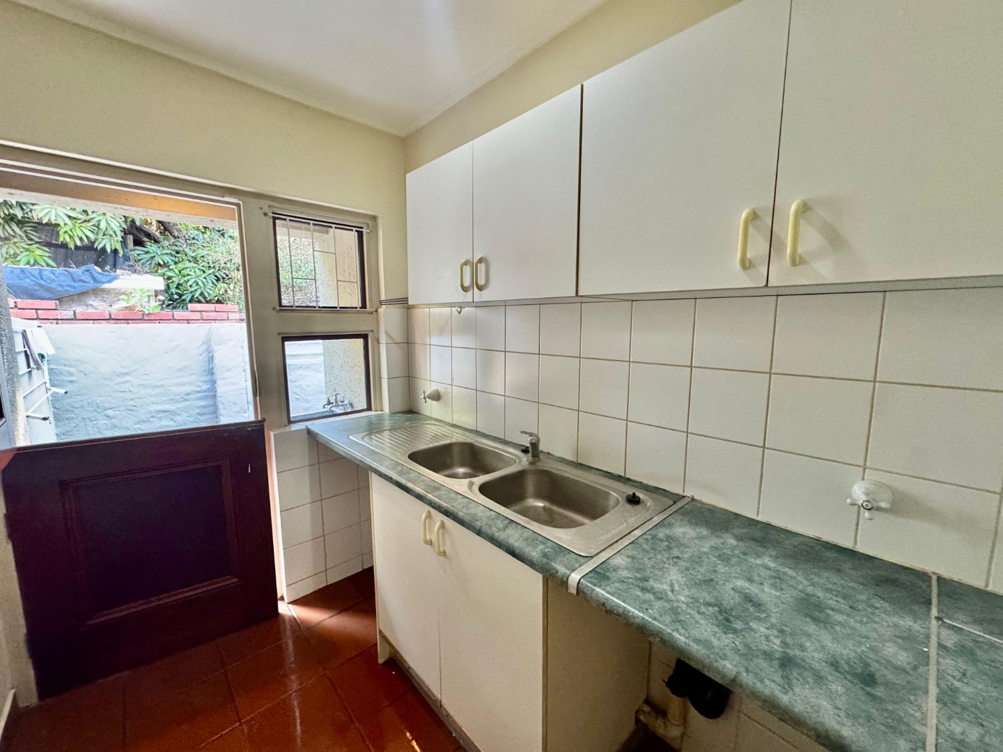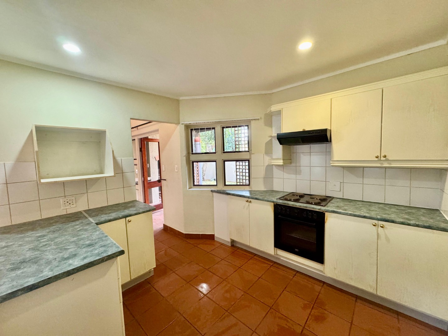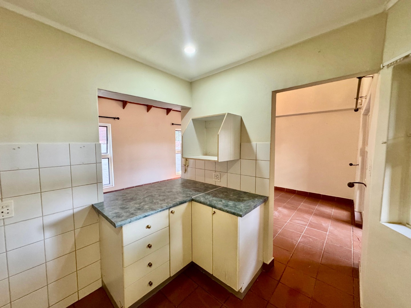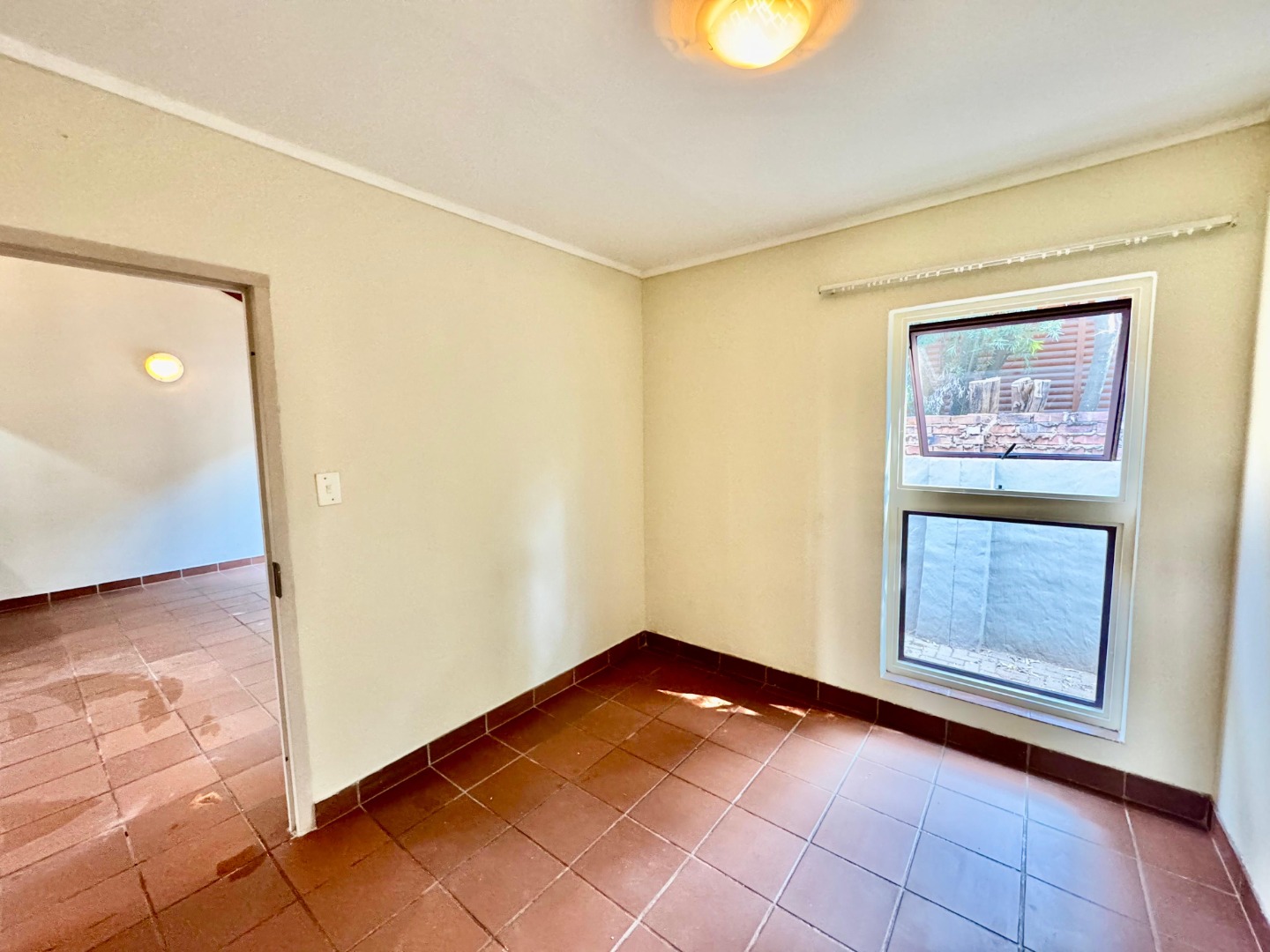 A glass door leads out to the patio and large, private walled garden with a built-in braai area—ideal for entertainment.