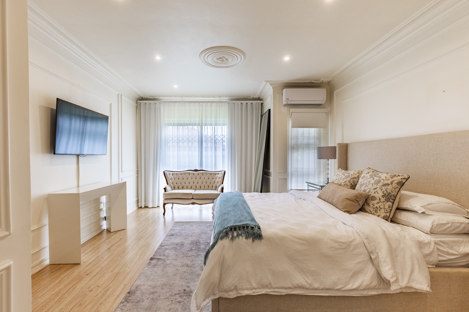The home boasts three generously proportioned bedrooms fitted with laminated flooring, including a lavish en-suite master. The 2nd bathroom services the other 2 bedrooms, promising serene personal havens for all occupants. Every detail has been considered to create an atmosphere of refined luxury and comfort.
