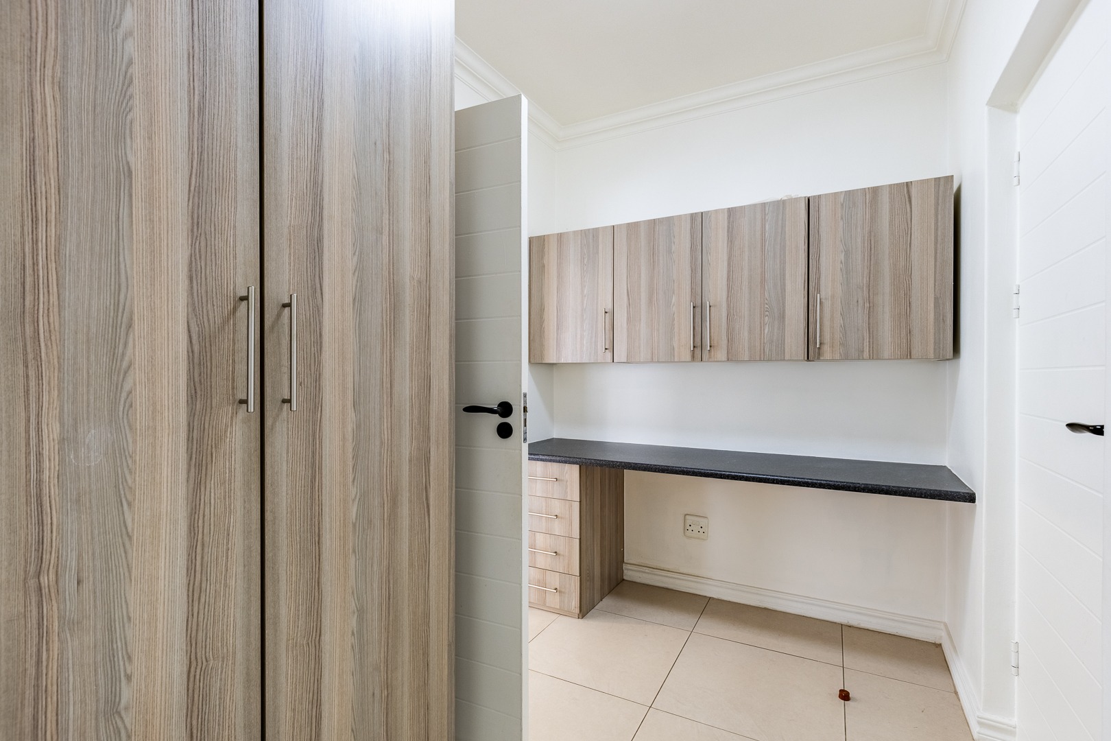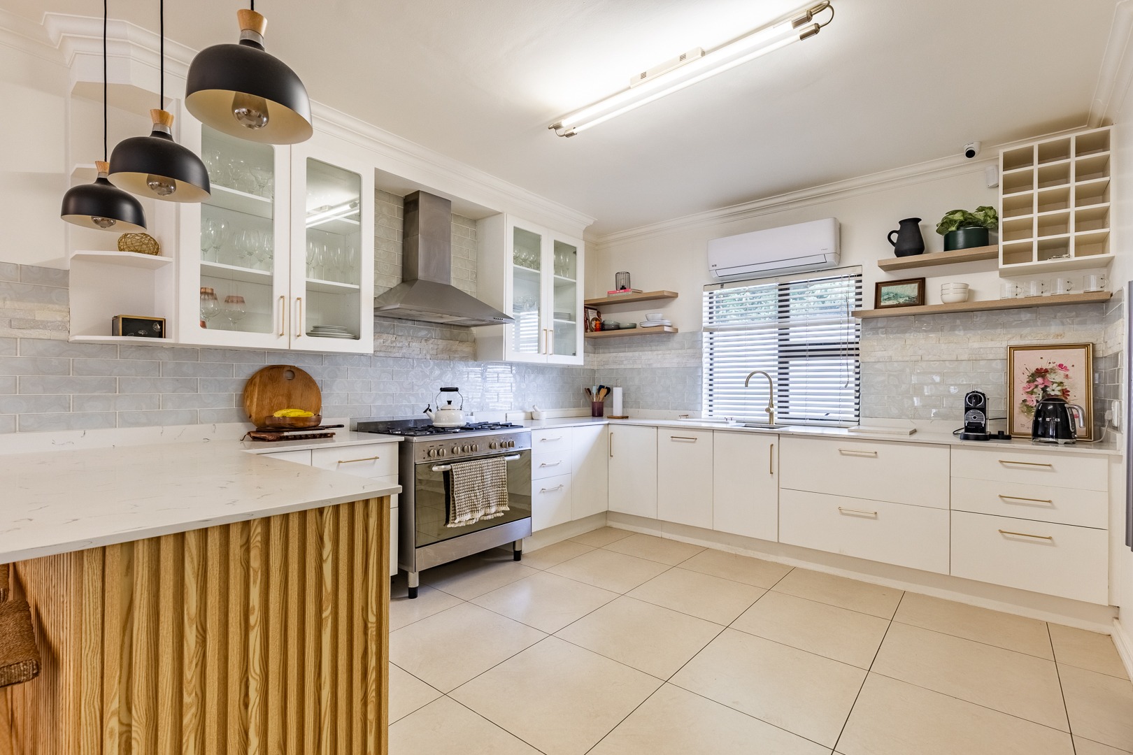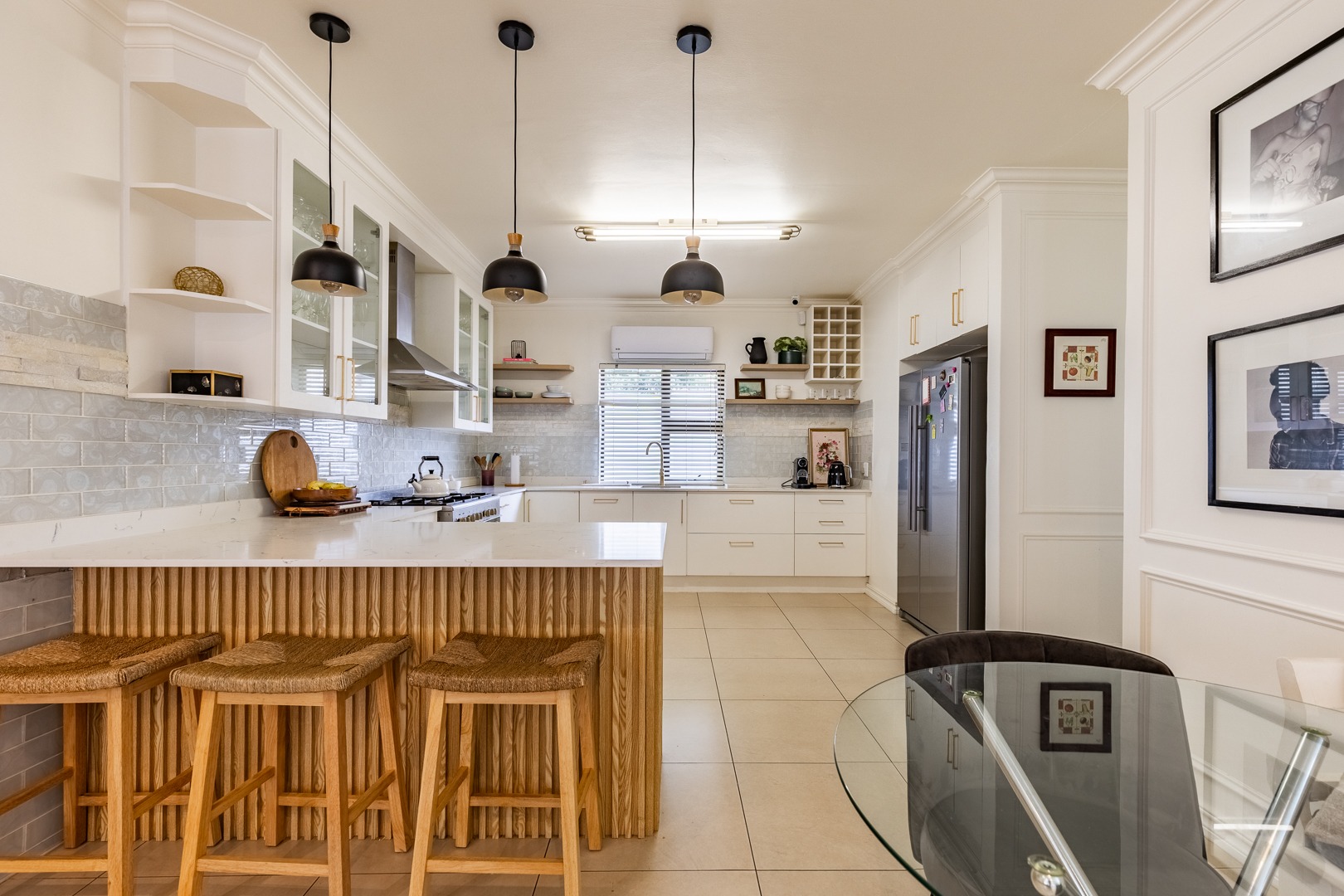 The well-appointed kitchen offers ample cupboard space and granite work surfaces as well as a gas hob and a breakfast counter, catering to culinary requirements. The separate scullery / laundry offers space for 3 appliances with lots of storage space.