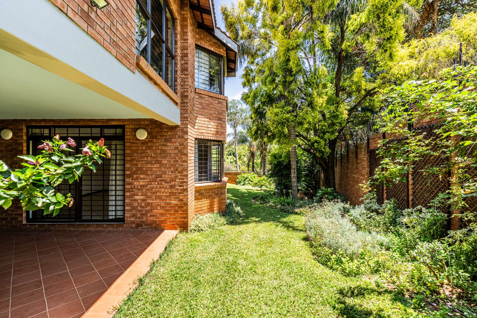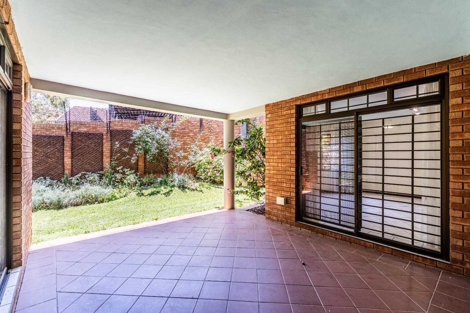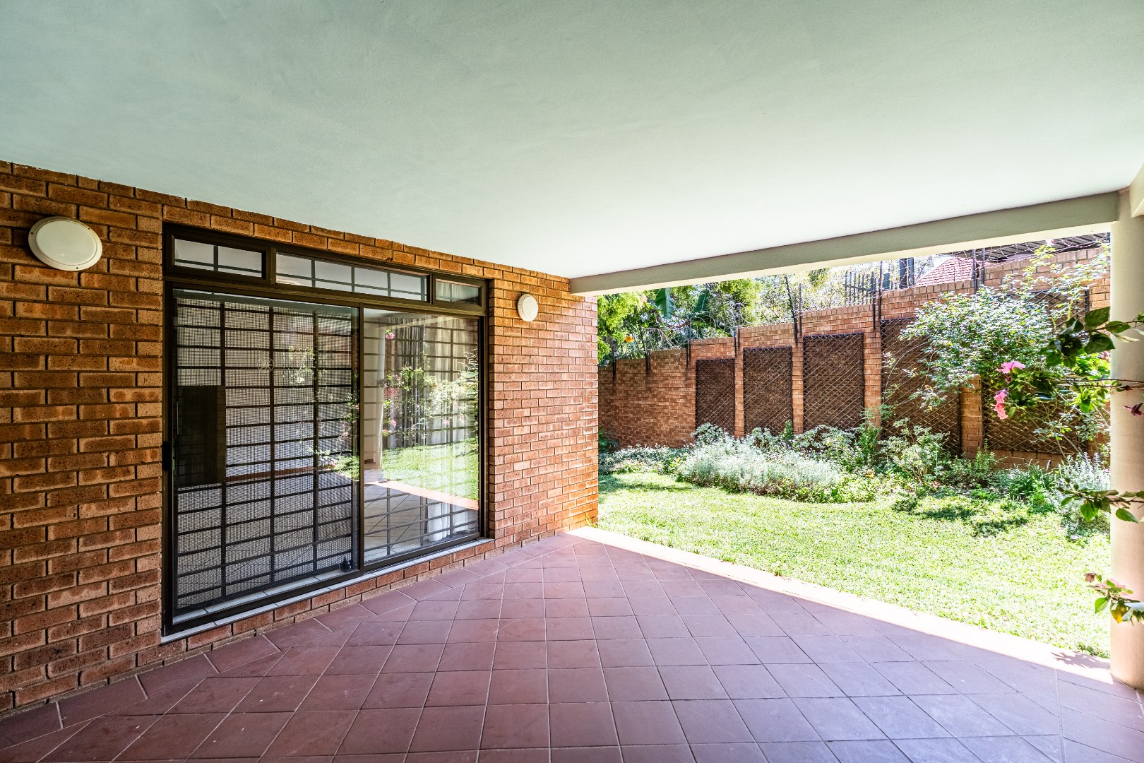 - Covered patio overlooking plush garden