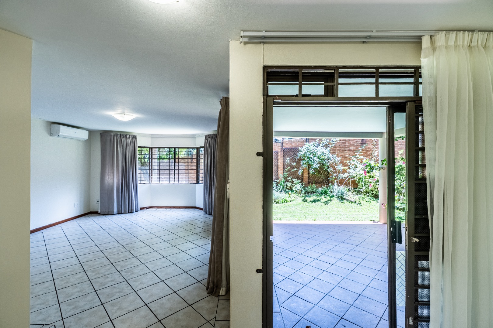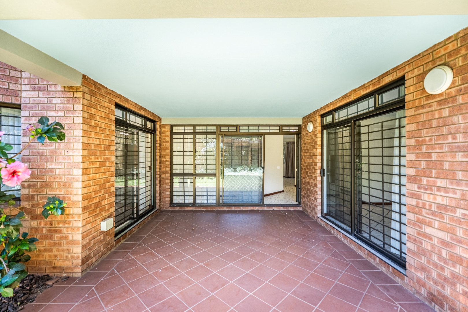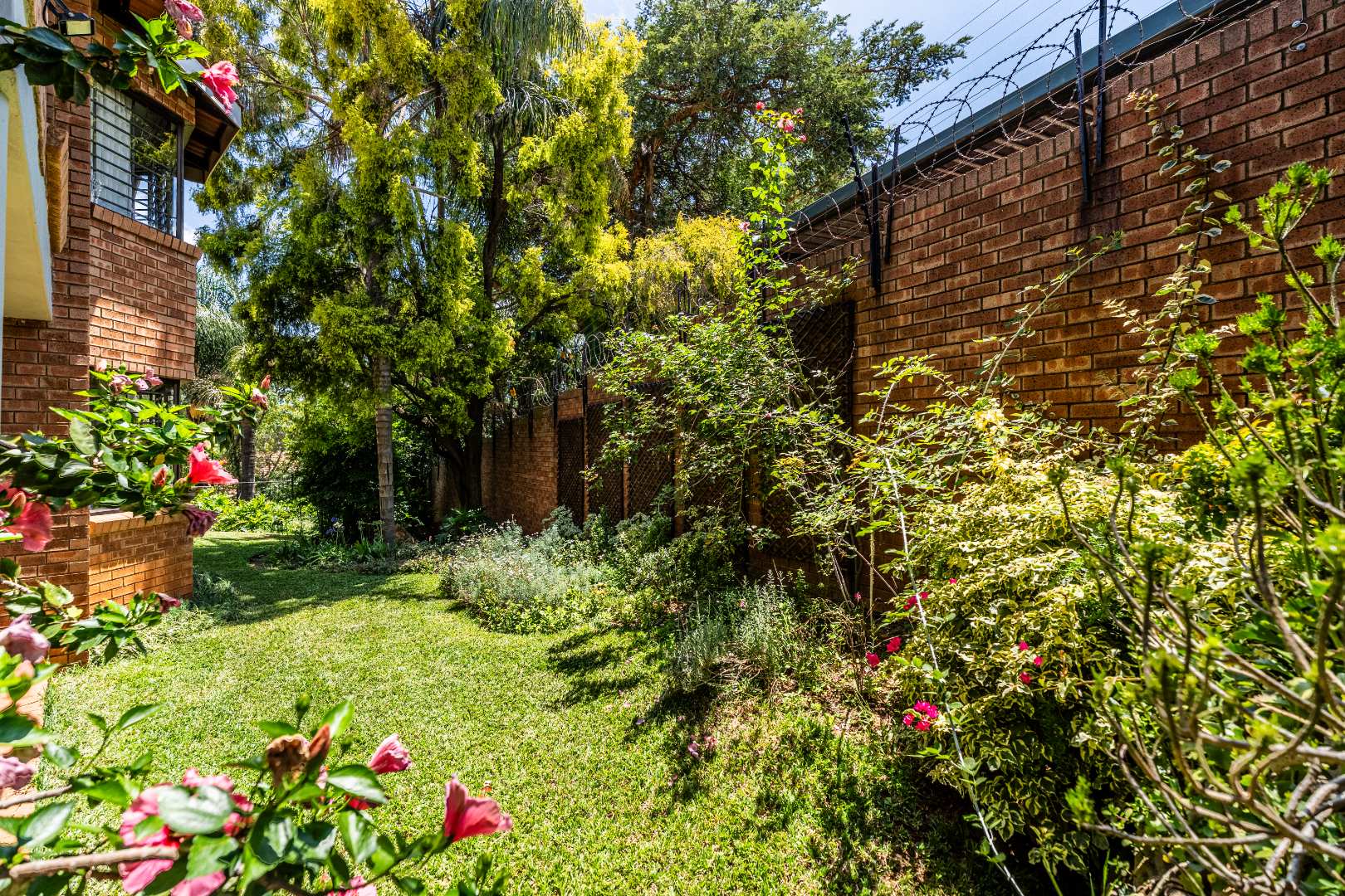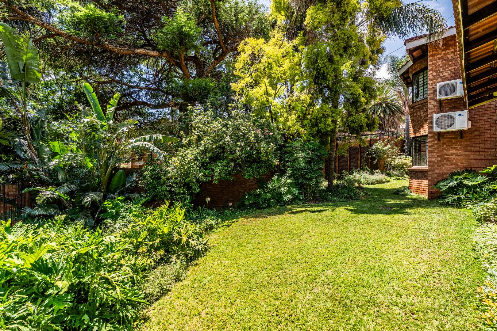 - Covered patio overlooking plush garden