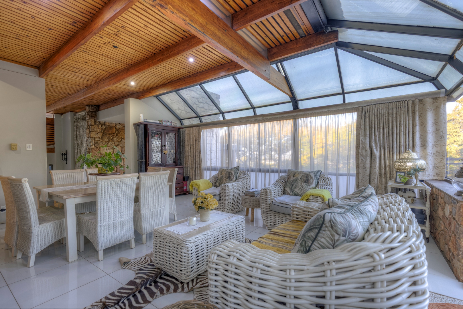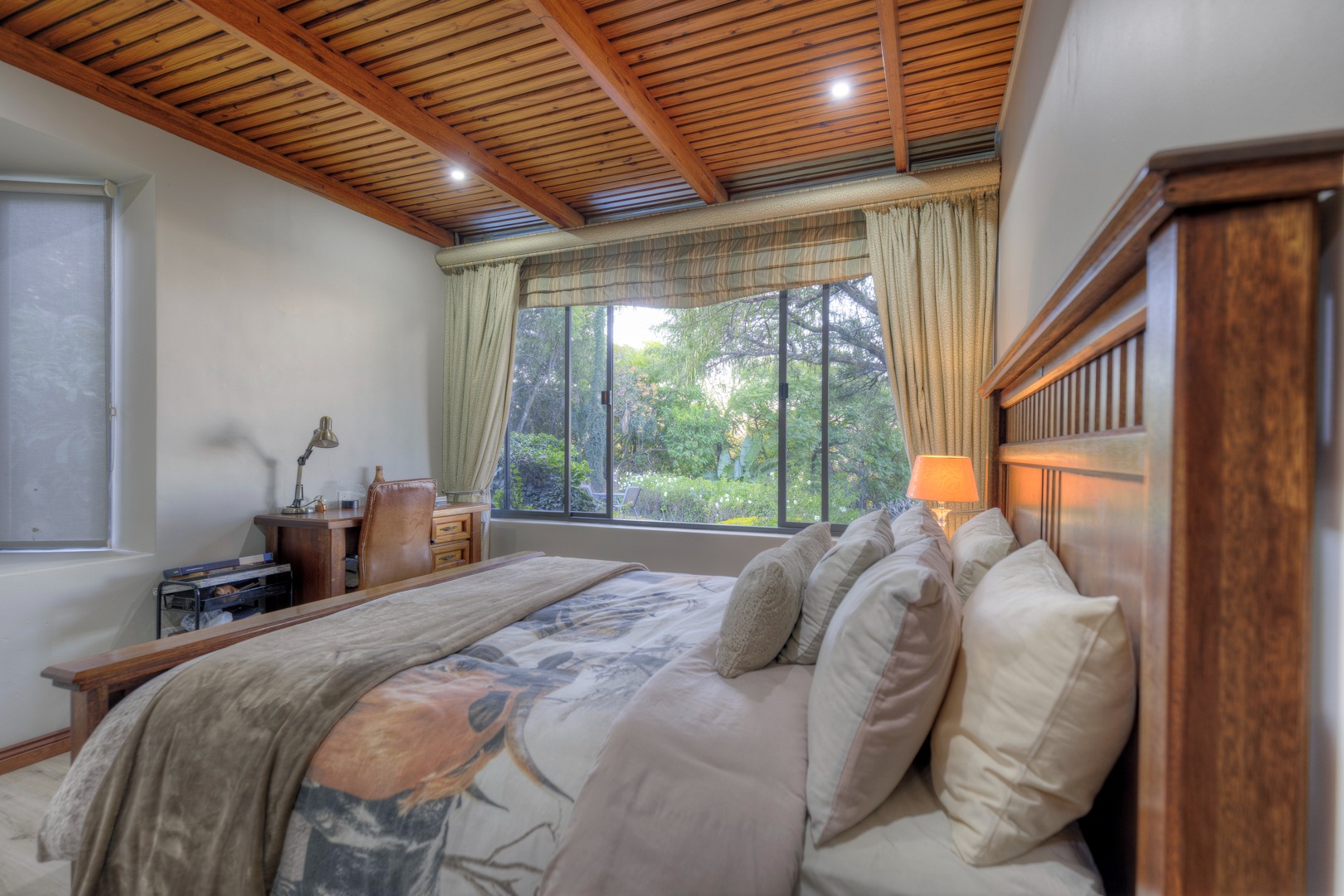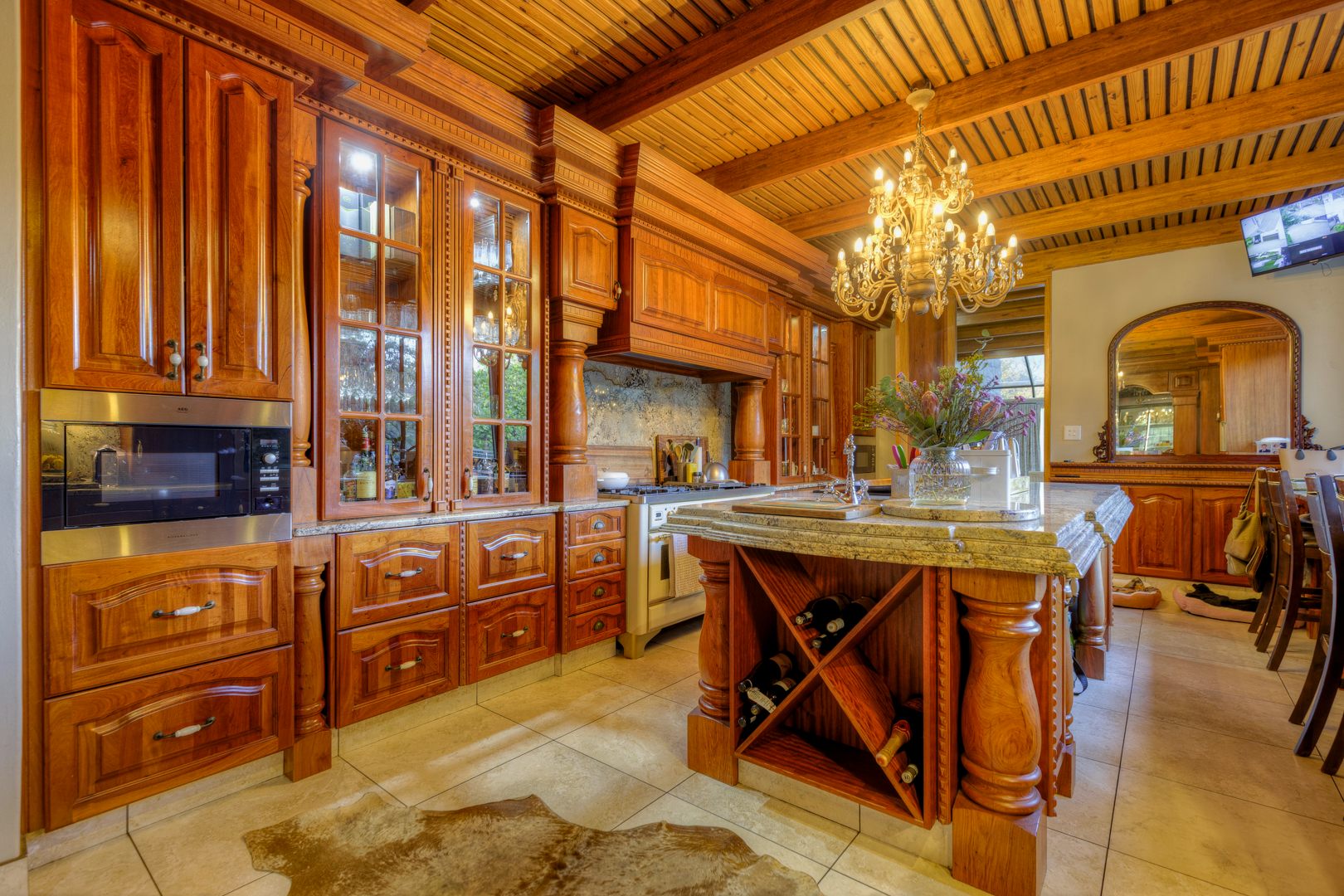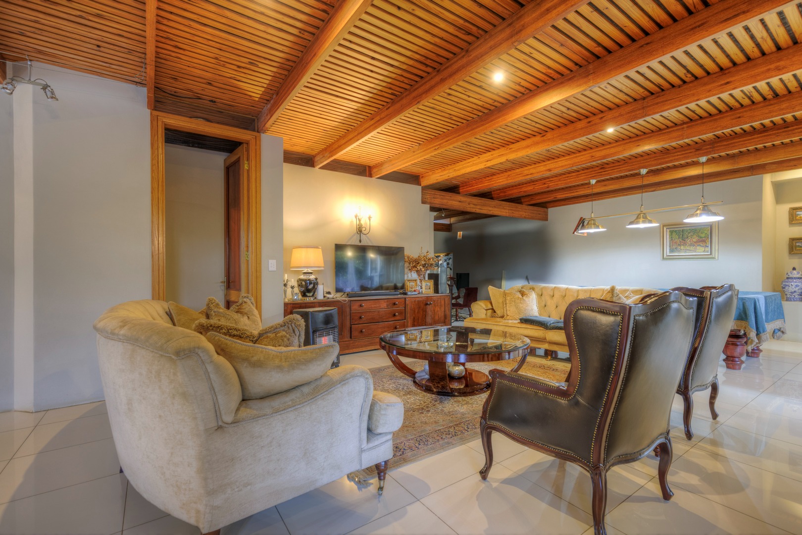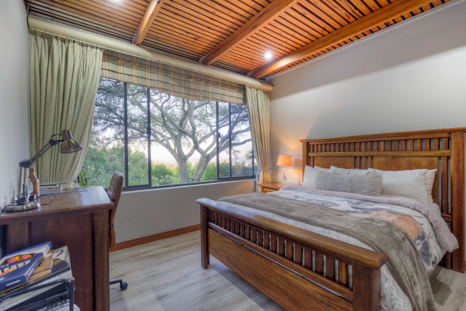 The main house is designed around generous open-plan living spaces, including a dining area, a welcoming lounge, and a separate TV room. A striking kitchen finished in cherry wood cabinetry features a large island, scullery, and a built-in bar area, making entertaining a pleasure. The flow extends outdoors to a covered patio with a built-in braai, overlooking tranquil views and a sparkling chlorine pool—ideal for relaxed weekends or hosting.