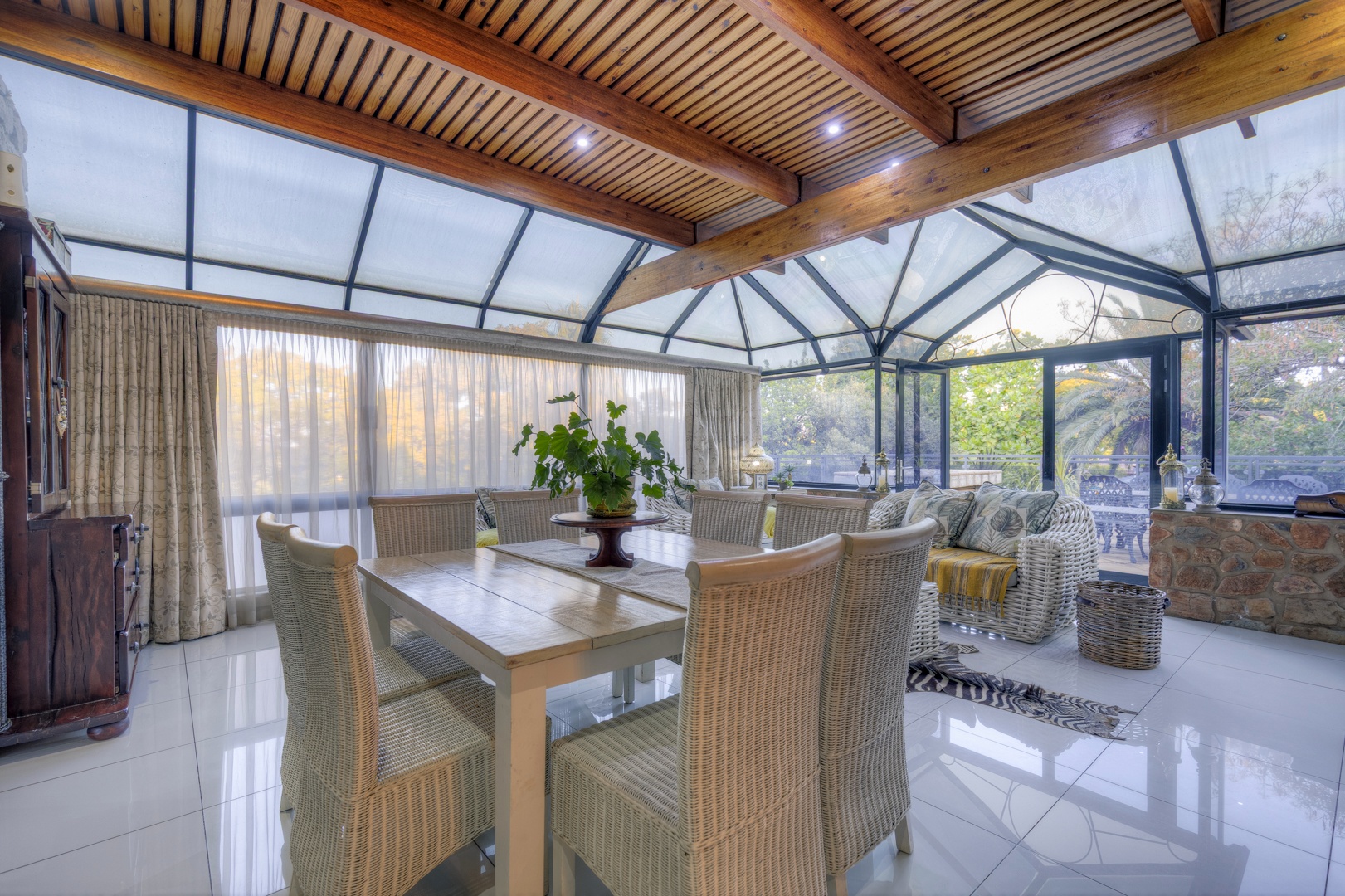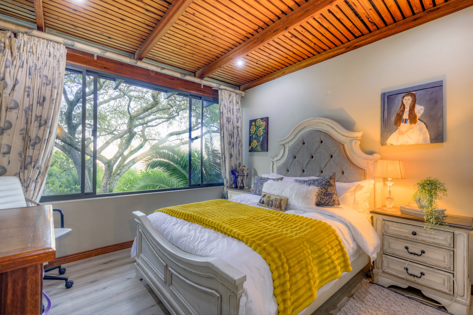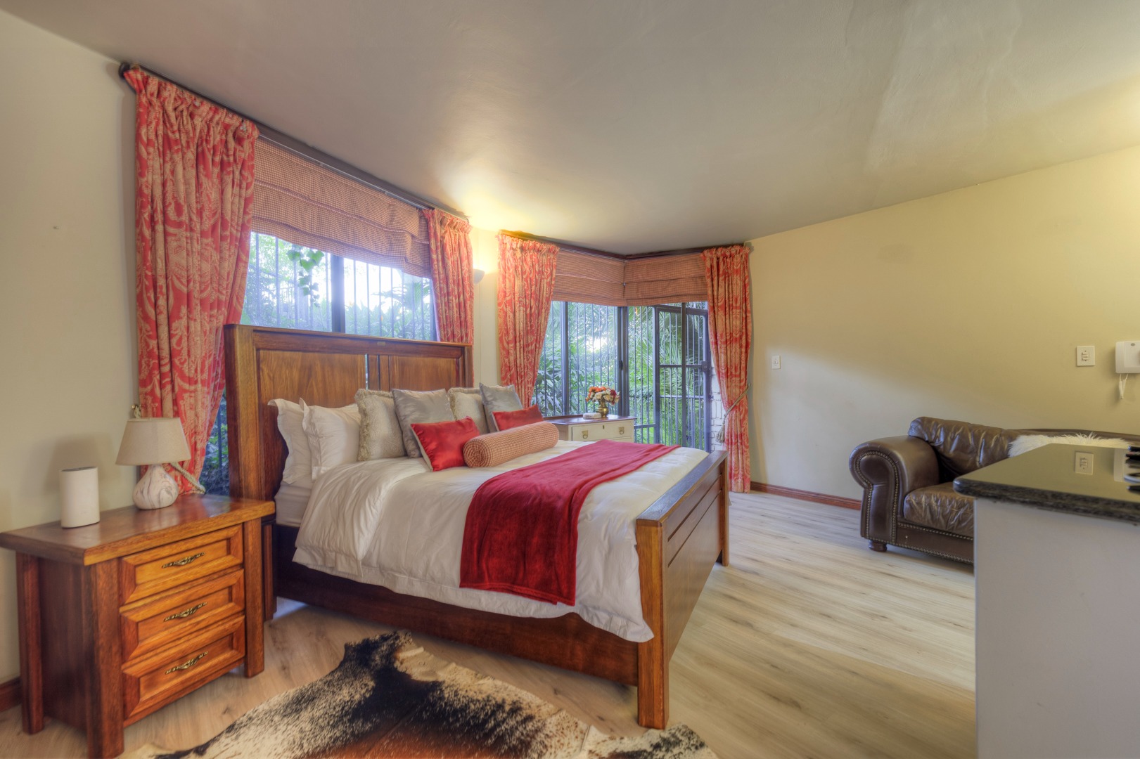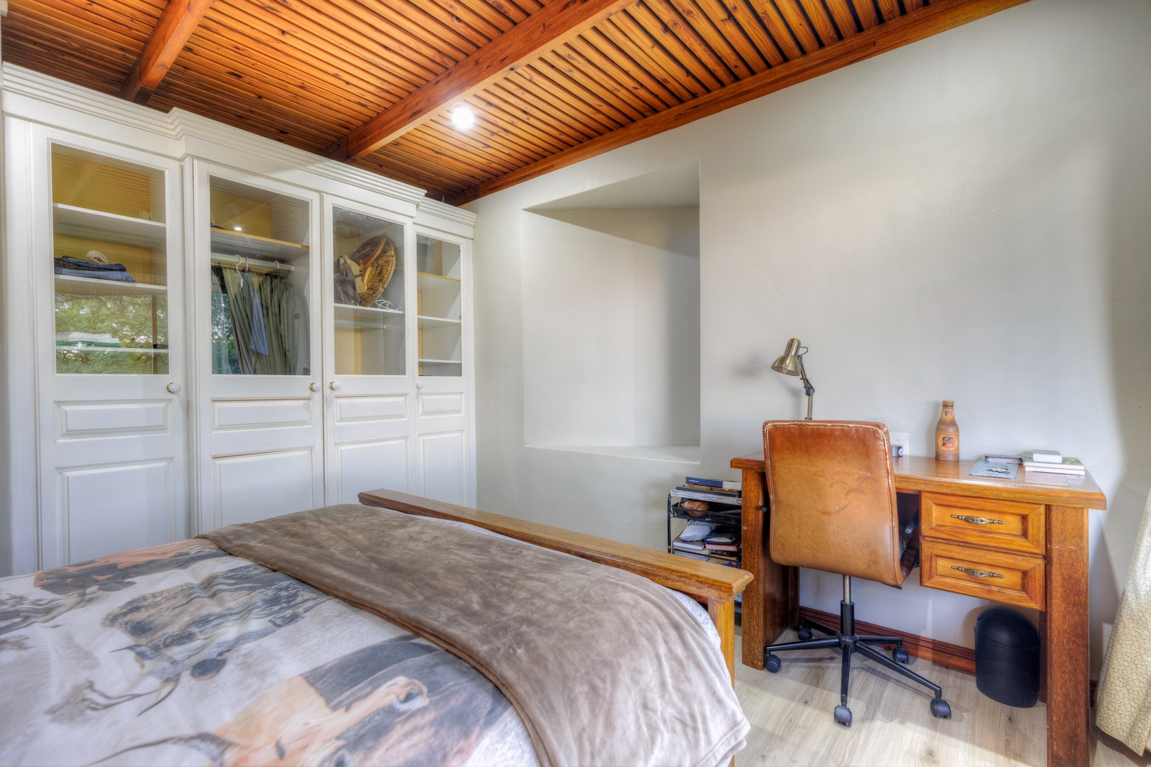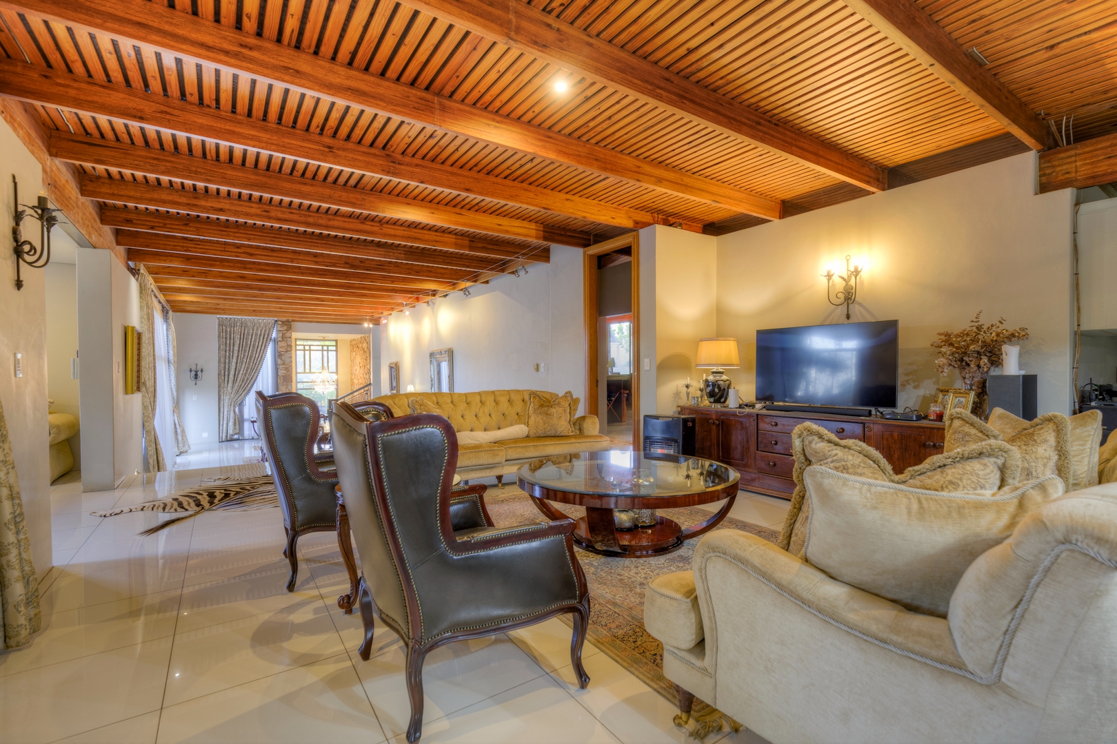The main house is designed around generous open-plan living spaces, including a dining area, a welcoming lounge, and a separate TV room. A striking kitchen finished in cherry wood cabinetry features a large island, scullery, and a built-in bar area, making entertaining a pleasure. The flow extends outdoors to a covered patio with a built-in braai, overlooking tranquil views and a sparkling chlorine pool—ideal for relaxed weekends or hosting.