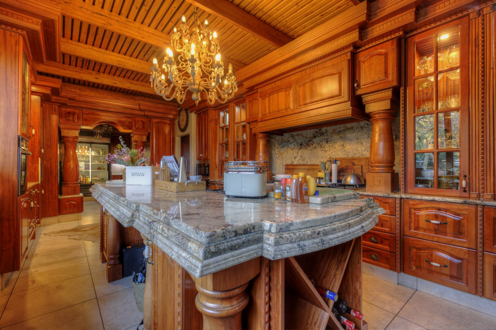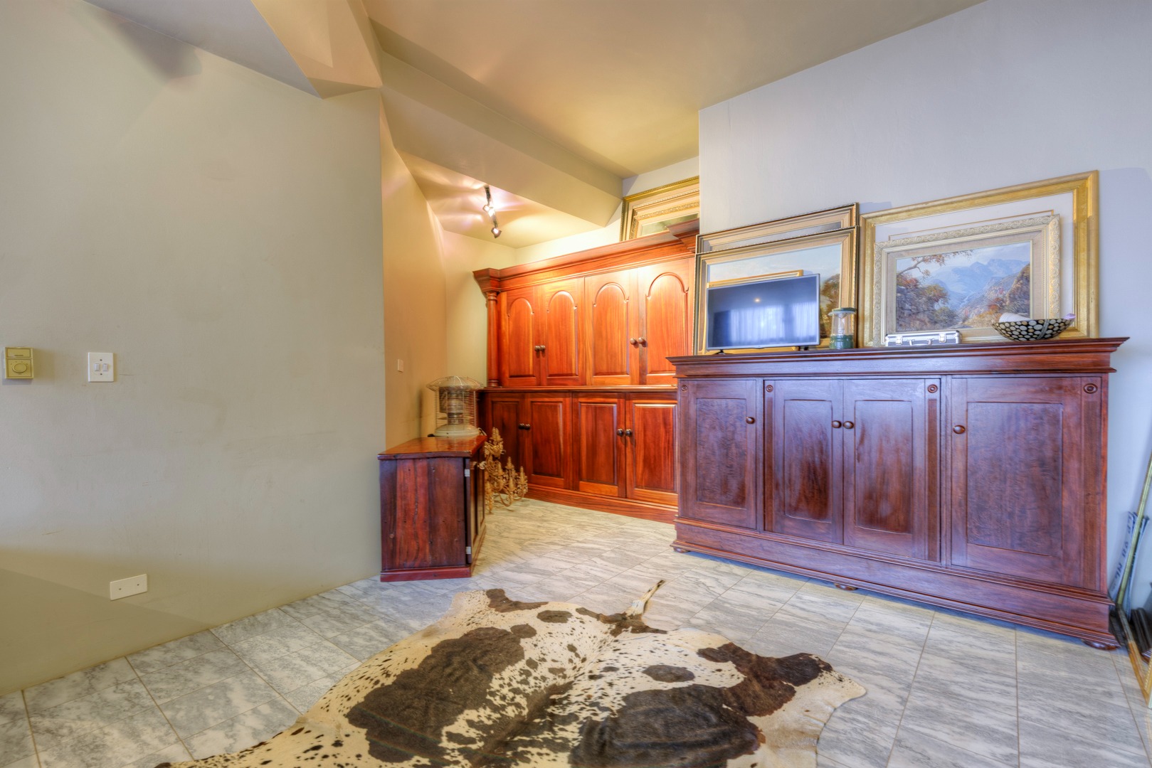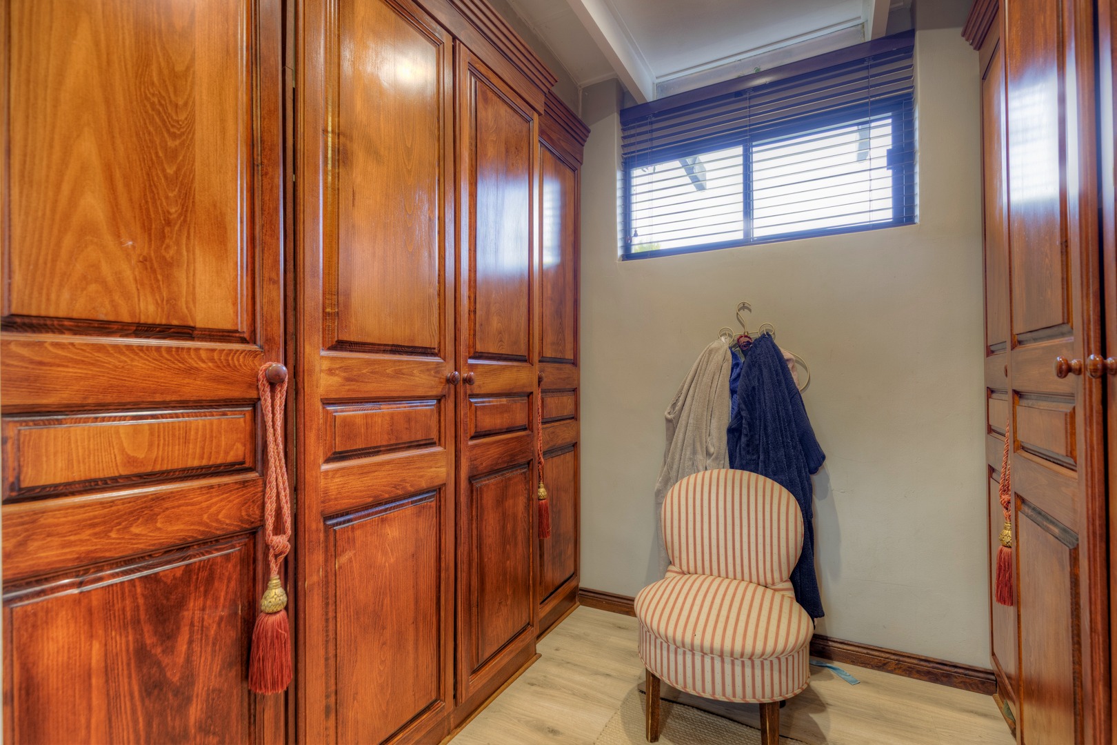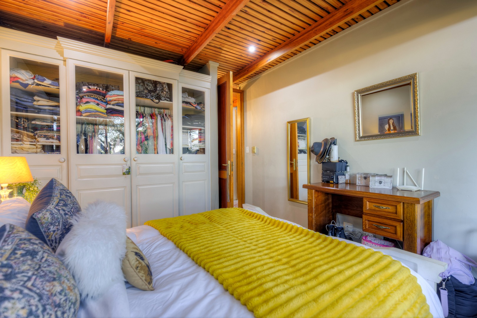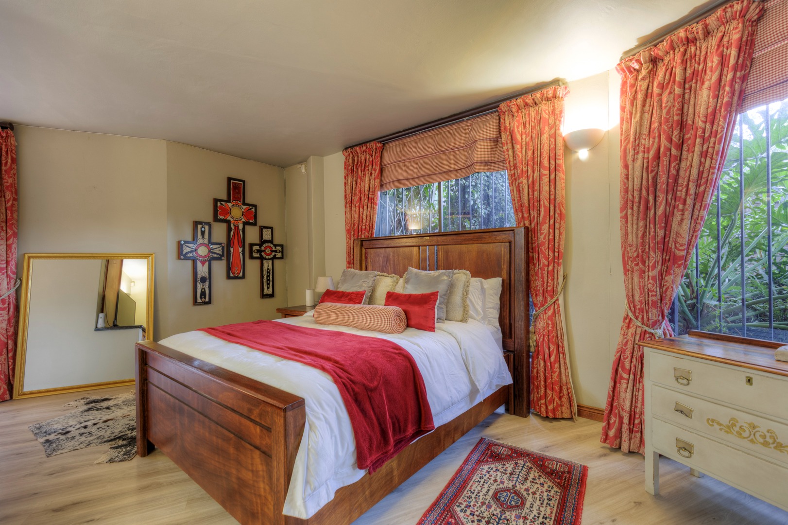 The main house is designed around generous open-plan living spaces, including a dining area, a welcoming lounge, and a separate TV room. A striking kitchen finished in cherry wood cabinetry features a large island, scullery, and a built-in bar area, making entertaining a pleasure. The flow extends outdoors to a covered patio with a built-in braai, overlooking tranquil views and a sparkling chlorine pool—ideal for relaxed weekends or hosting.