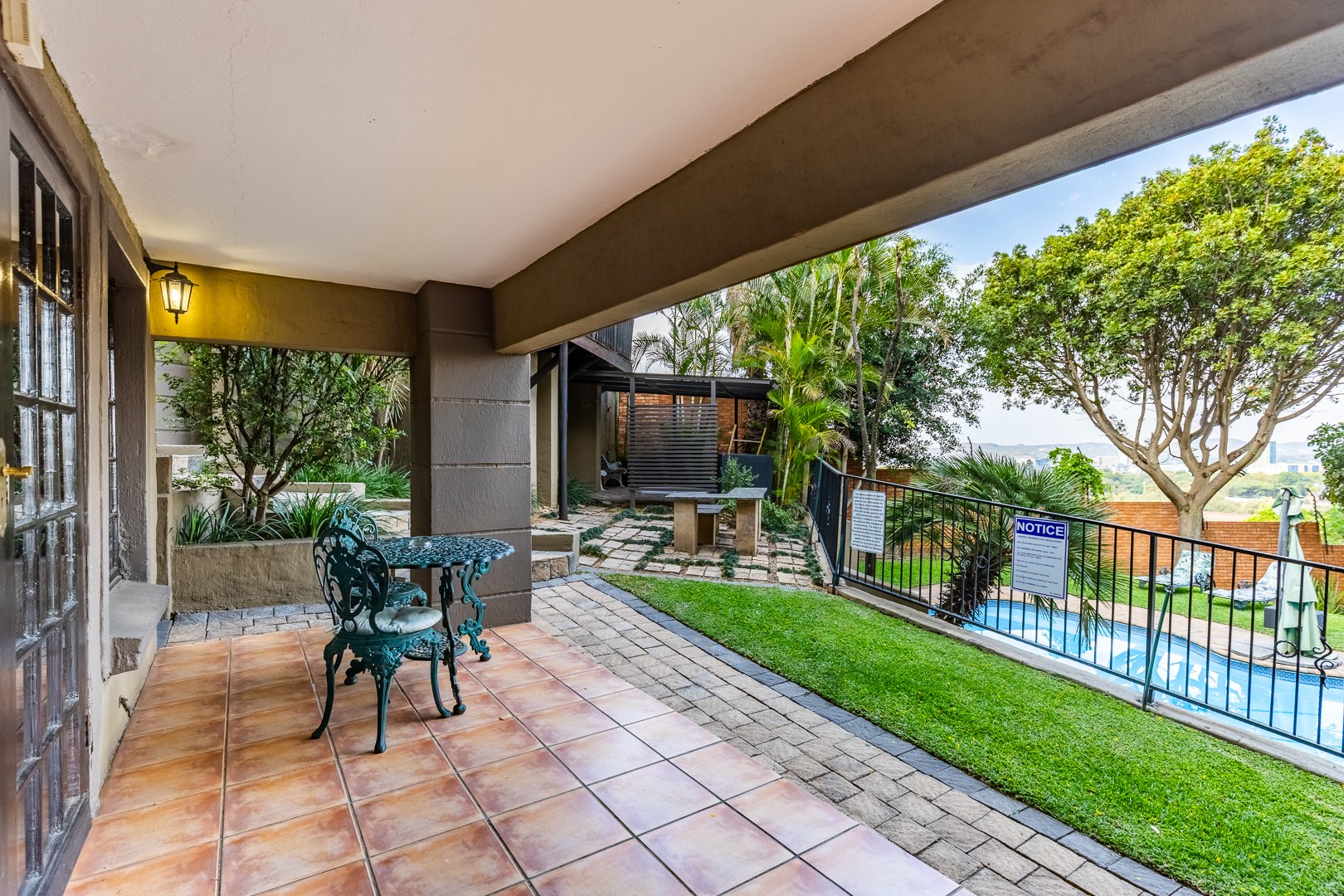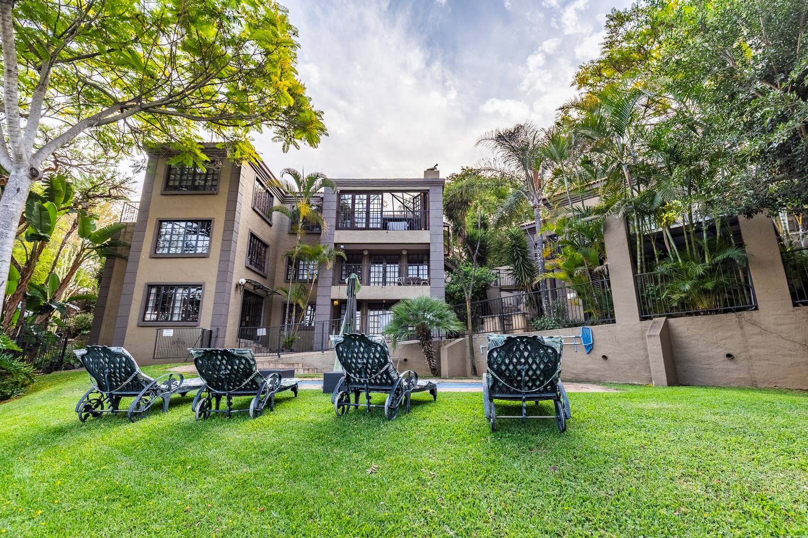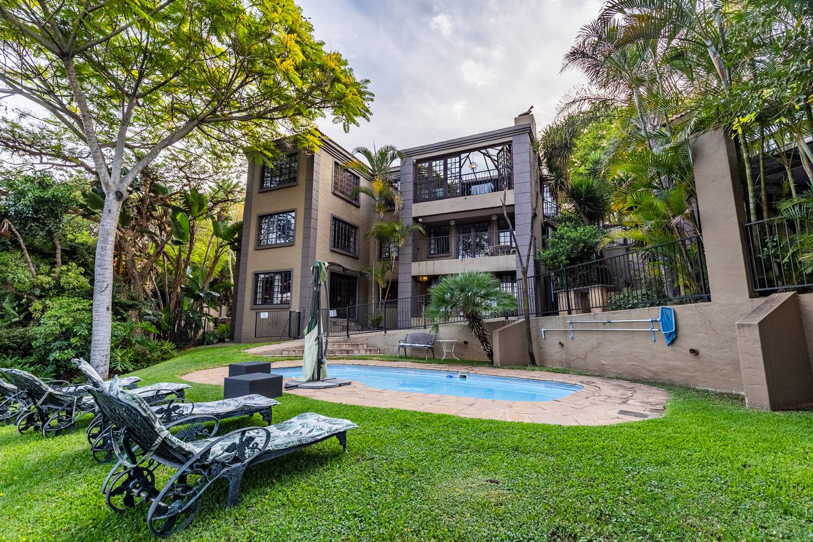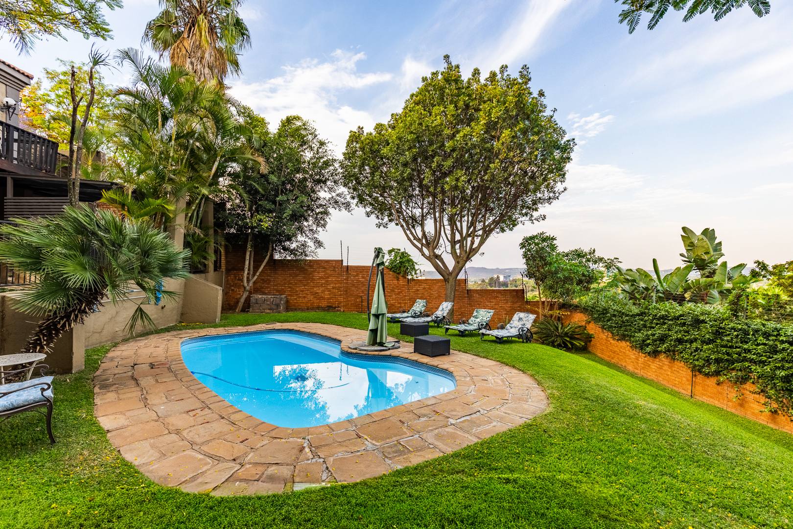 Swimming pool, manicured gardens, and multiple outdoor relaxation zones