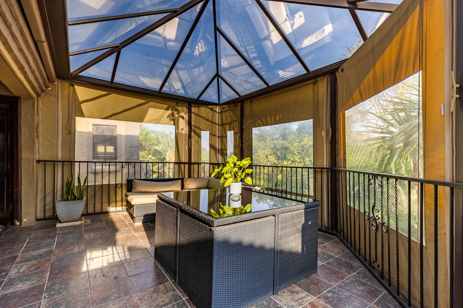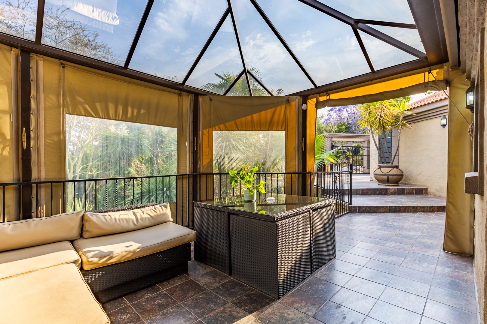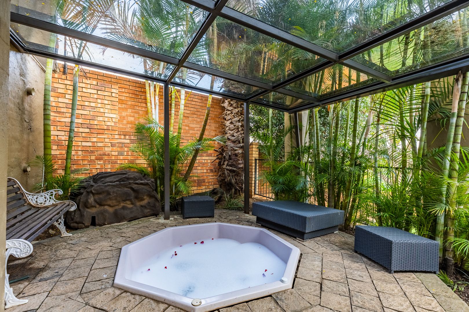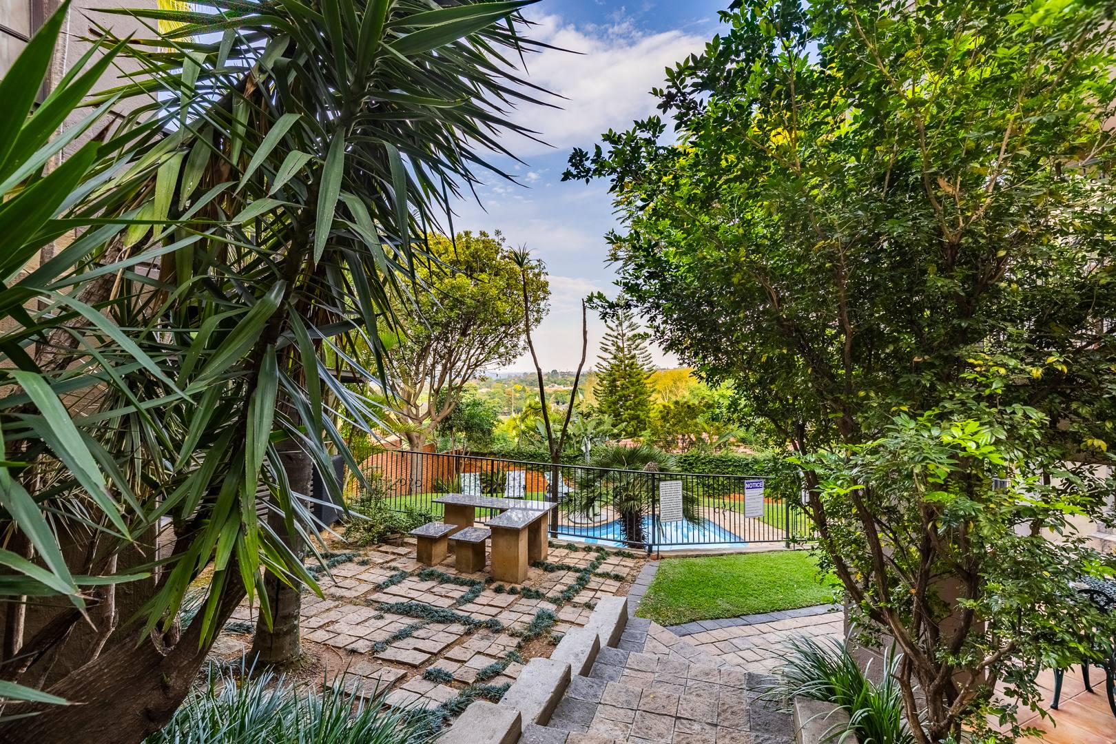 Swimming pool, manicured gardens, and multiple outdoor relaxation zones