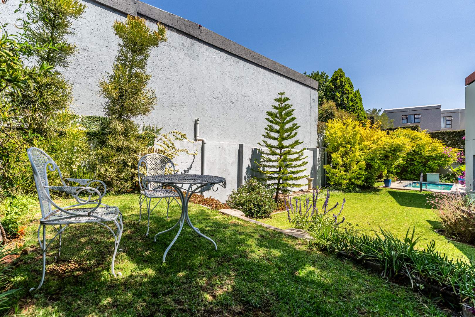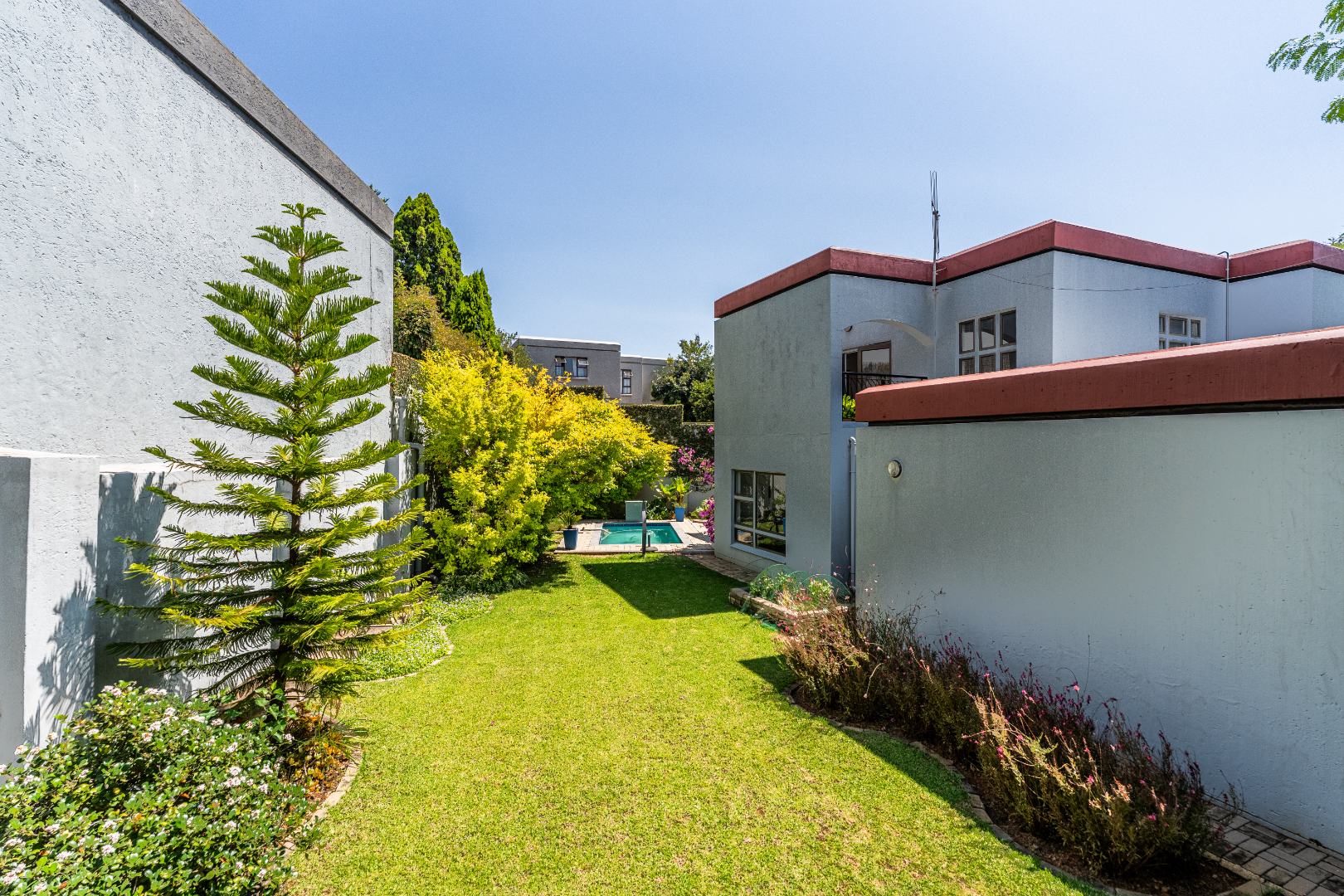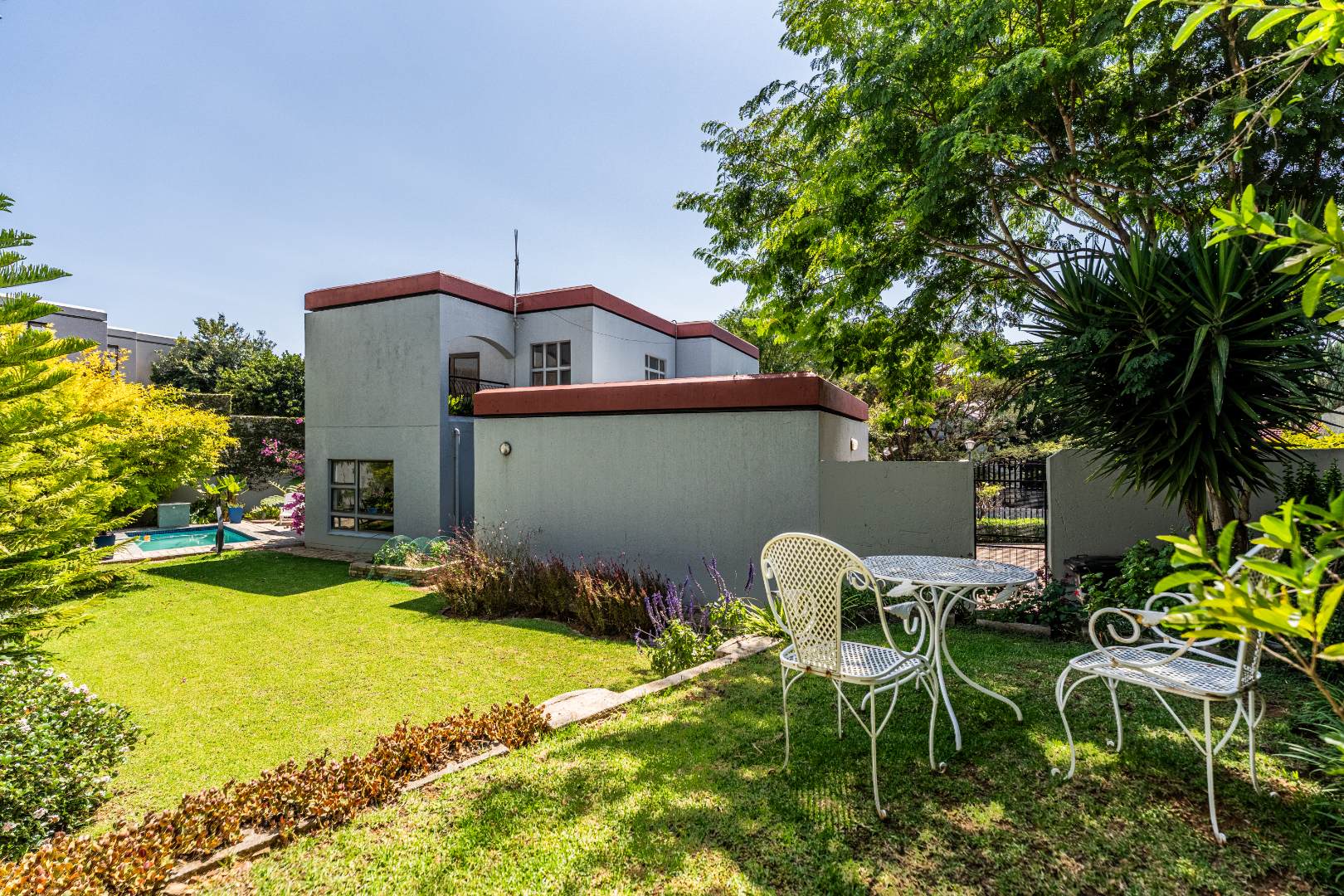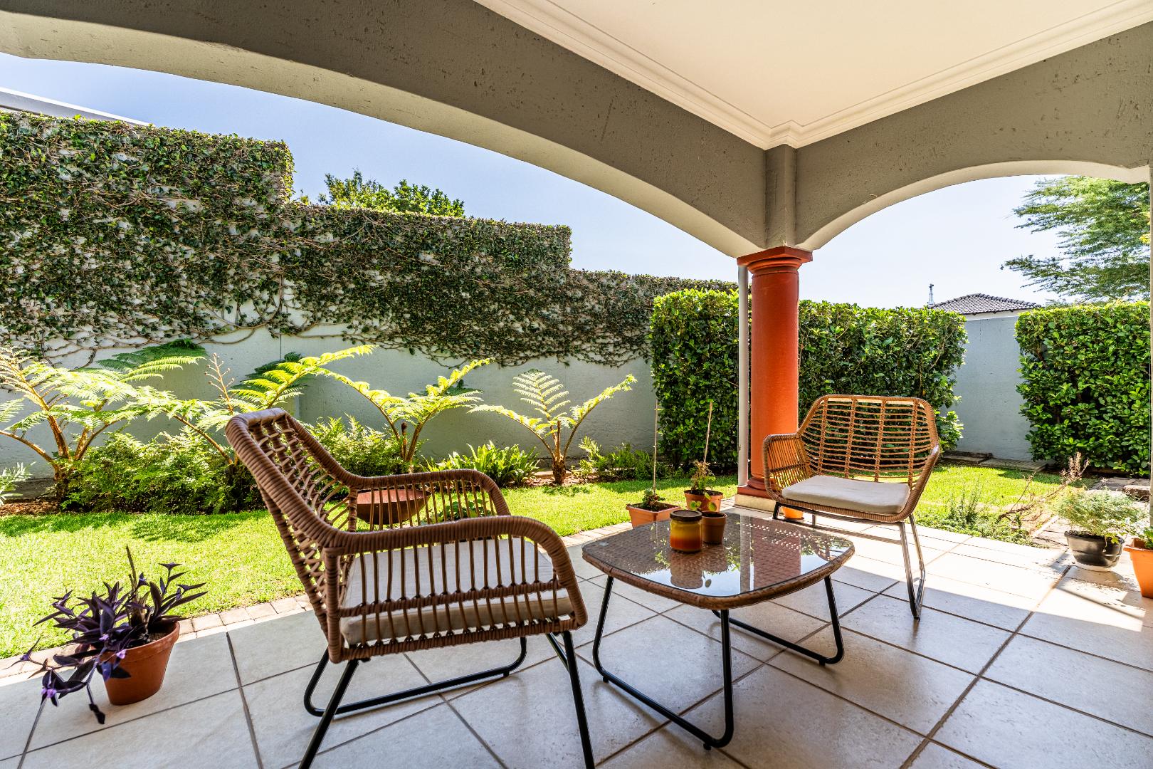 The outdoor areas are designed for enjoyment and relaxation. A spacious patio, equipped with a built-in braai, provides an ideal setting for outdoor dining and social gatherings, overlooking a refreshing swimming pool. The meticulously maintained garden offers a private green sanctuary, complemented by a charming balcony. Additional conveniences include a double garage for secure parking and ample storage space. With fibre internet connectivity and a pet-friendly policy, this home truly embodies contemporary living within a secure and esteemed community.