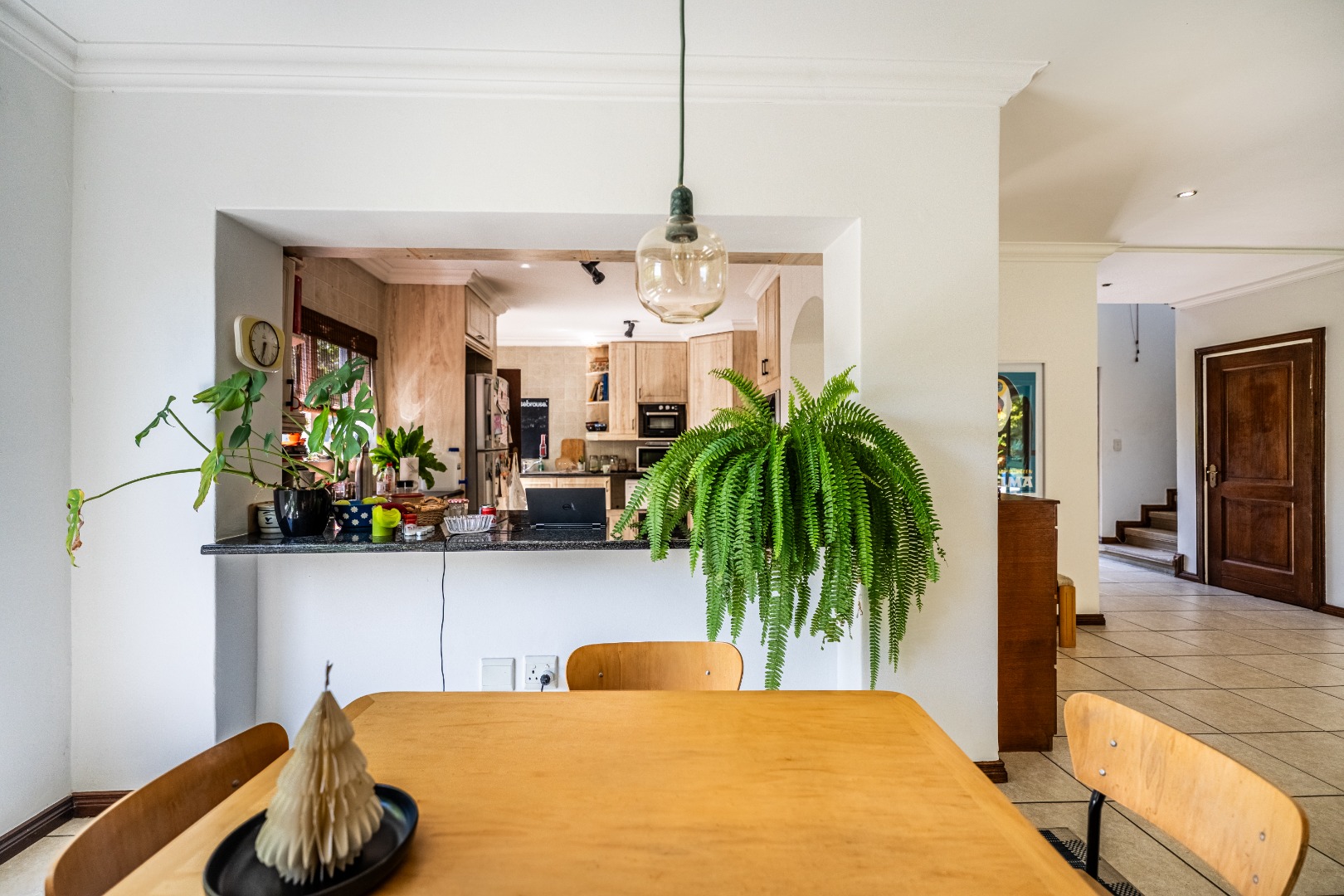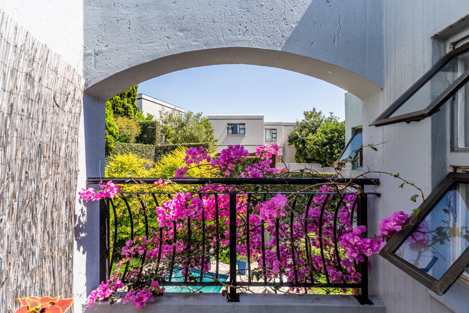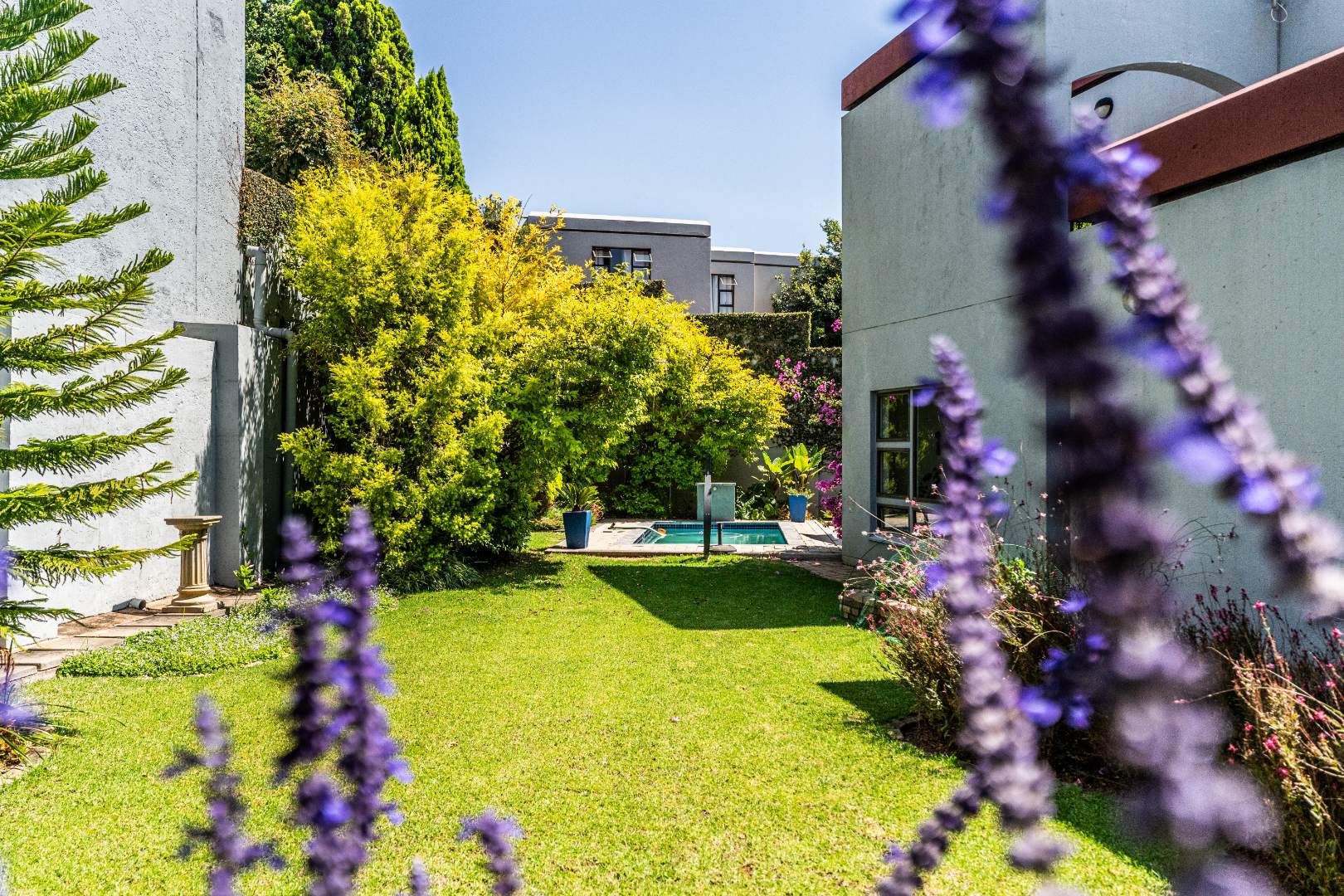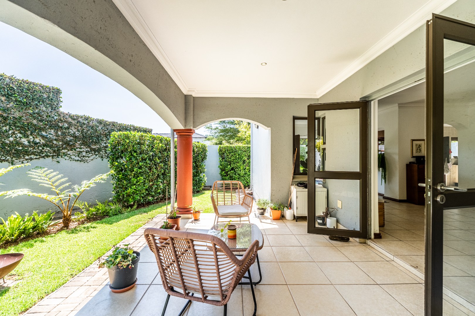 The outdoor areas are designed for enjoyment and relaxation. A spacious patio, equipped with a built-in braai, provides an ideal setting for outdoor dining and social gatherings, overlooking a refreshing swimming pool. The meticulously maintained garden offers a private green sanctuary, complemented by a charming balcony. Additional conveniences include a double garage for secure parking and ample storage space. With fibre internet connectivity and a pet-friendly policy, this home truly embodies contemporary living within a secure and esteemed community.